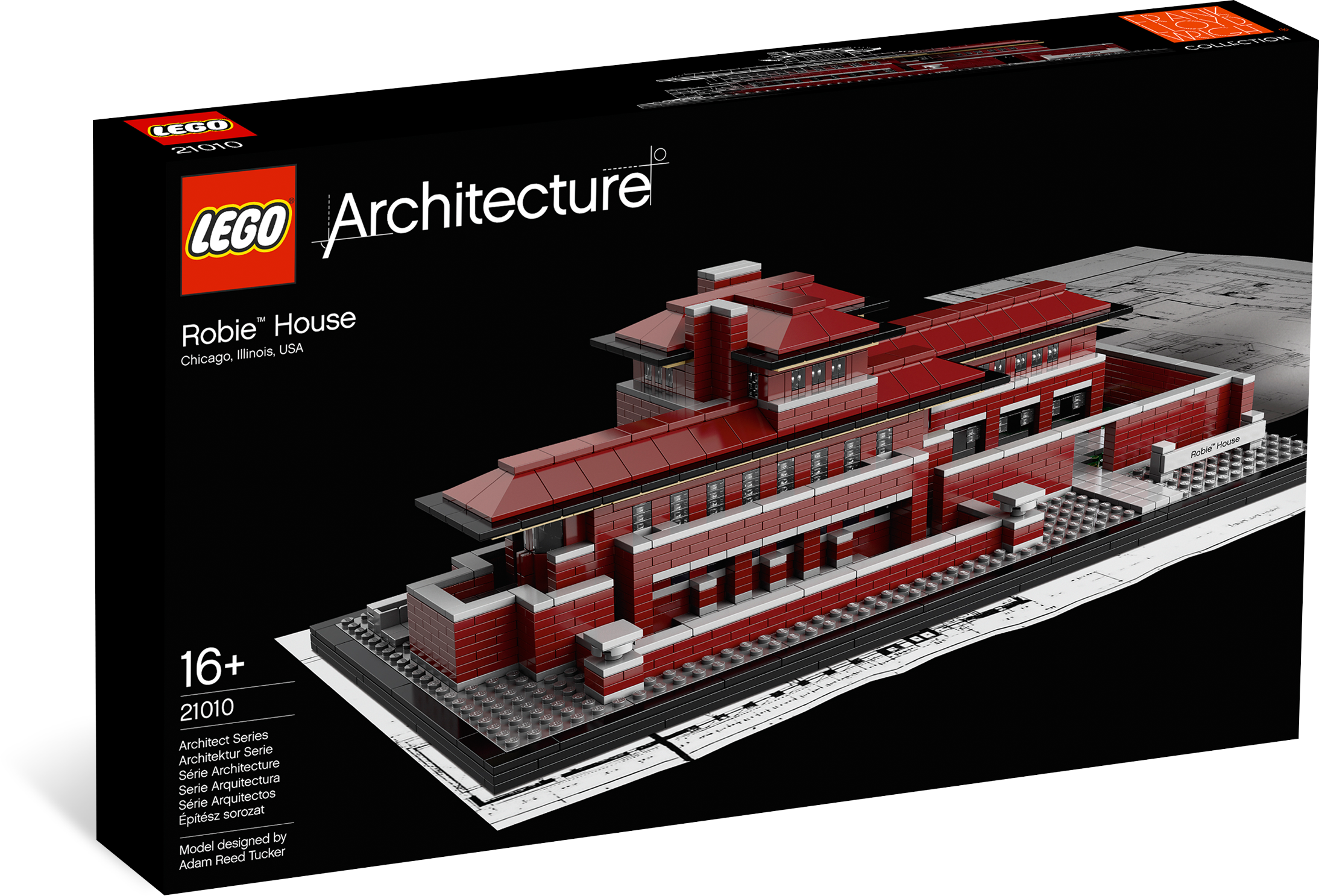 Build a LEGO® replica of the Robie™ House! Completed in 1910, the Frederick C. Robie™ House, located in Chicago’s Hyde Park neighborhood, is considered to be Frank Lloyd Wright’s most accomplished Prairie-style work. Prairie style is acknowledged as the first truly American style, characterized by dominating horizontal lines, banded rows of windows and spacious, open floor plans. F.C. Robie wanted a home that would provide beautiful vistas of the surrounding neighborhood while maintaining privacy for his family. Combined with the long, narrow size and shape, the views inspired Wright’s vision for the 9,062 square foot residence. This highly detailed LEGO model was designed by architect Adam Reed Tucker.Architectural replica of the real-world Robie™ HouseBooklet included with details on design and history. (English language only)Measures over 16.5” (42cm) wide and 5” (13cm) tall