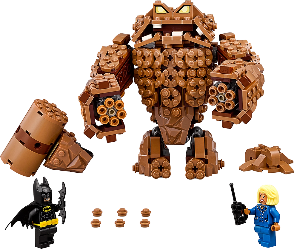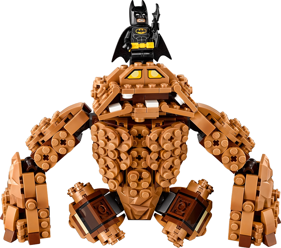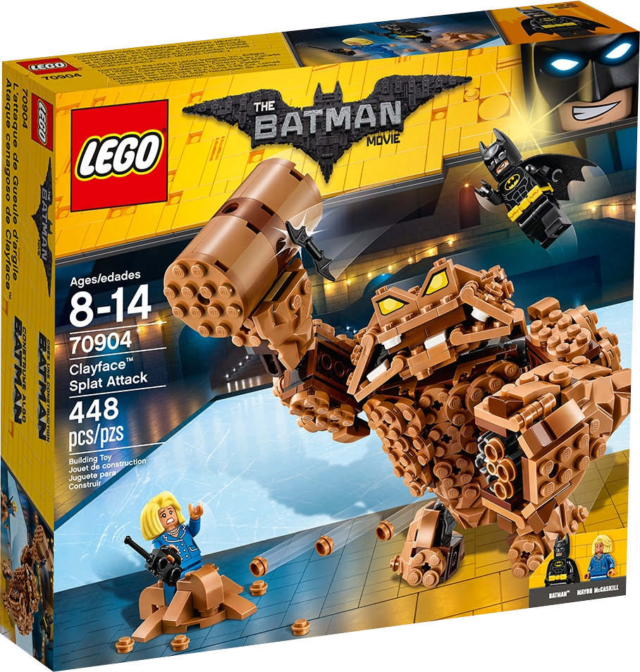 Team up with Batman™ to take on Clayface™ and free Mayor McCaskill from the clay prison in THE LEGO® BATMAN MOVIE: Clayface Splat Attack set. The highly posable, buildable Clayface figure features three interchangeable hands—two with a six-stud rapid shooter each and one with a clay hammer—while Batman is armed with a Batarang to dial up the role-play conflict. Includes two minifigures and a brick-built figure. Includes two minifigures: Batman™ and Mayor McCaskill, plus a brick-built Clayface™ figure. Clayface™ features posable arms, legs and head, plus three interchangeable hands—two with a six-stud rapid shooter each and one with a clay hammer. Arm Clayface™ with either two rapid shooters or a rapid shooter and a clay hammer. Also includes a clay prison to trap Mayor McCaskill. Includes Batman's Batarang weapon. Accessory elements include Batman's cape and new-for-spring-2017 moldedutility belt, and Mayor McCaskill’s walkie-talkie. This set offers an age-appropriate build and play experience for ages 8+. Clayface™ stands over 5” (14cm) tall. Clay prison measures over 1” (4cm) wide, 1” (4cm) deep and under 1” (2cm) high.
