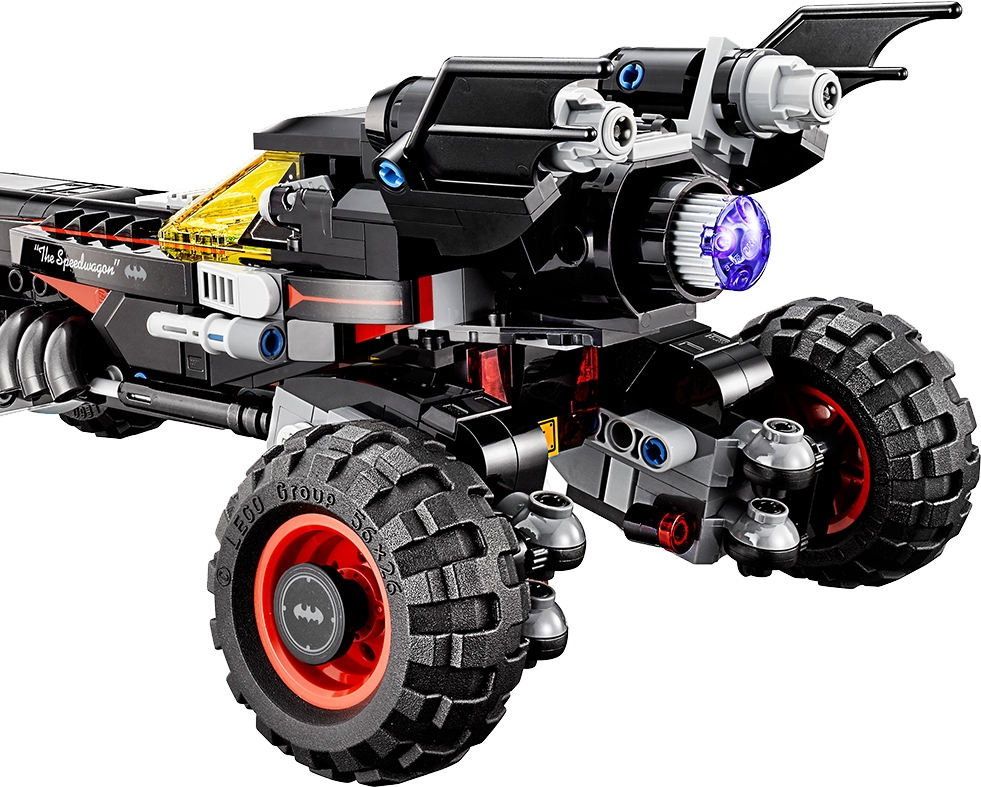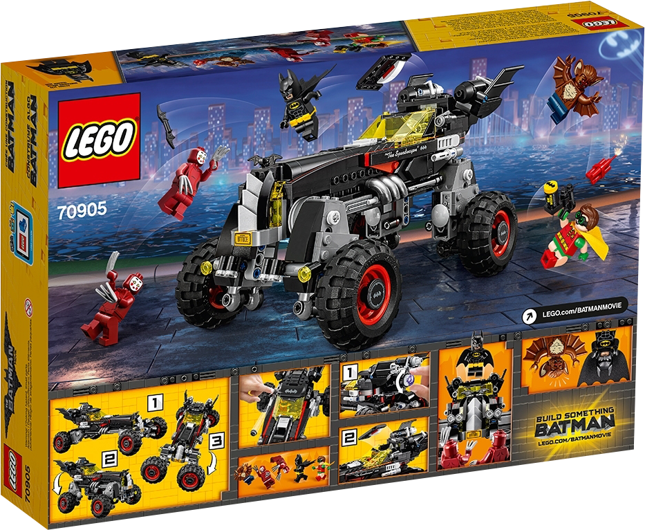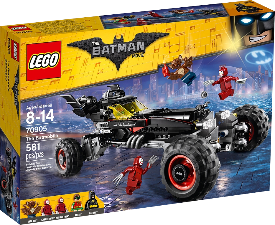 Race through Gotham City in pursuit of Man-Bat™ and the Kabuki Twins™ in the Batmobile. This set from THE LEGO® BATMAN MOVIE features the Batmobile with a dual cockpit for Batman™ and Robin™, two stud shooters and multidirectional wheels for three different modes—race mode, monster truck mode and parallel-parking mode. Man-Bat is equipped with a dynamite element and the Kabuki Twins each have claws to intensify the role-play battle action. Includes five minifigures. Includes five minifigures: Batman™, Robin™, Man-Bat™ and the Kabuki Twins™ The Batmobile features a two-minifigure cockpit with roof pop-off function, big multidirectional wheels with rubber tires, two stud shooters and posable bat wings. Adjust the wheels for three different modes—race mode, monster truck mode and parallel-parking mode. Weapons include Batman's Batarang, Robin's Batman™ Merch gun, Man-Bat's dynamite and the Kabuki Twins' claws (two each). Accessory elements include Batman and Robin’s capes, and Batman’s new-for-spring-2017 molded utility belt. This set offers an age-appropriate build and play experience for ages 8+. The Batmobile measures over 3” (10cm) high, 11” (29cm) long and 5” (15cm) wide in race mode.