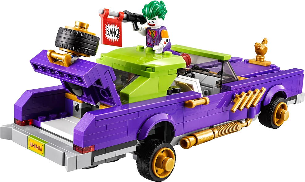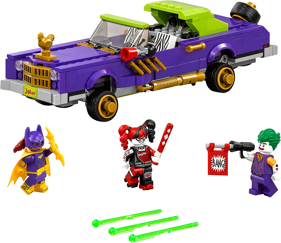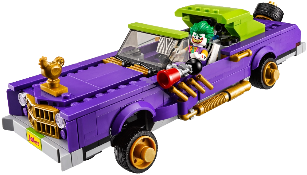 Join Batgirl’s pursuit of The Joker™ and Harley Quinn™ through the streets of Gotham City in this exciting set from THE LEGO® BATMAN MOVIE. The Joker’s Notorious Lowrider vehicle features bouncing suspension, handles for Harley to hang onto, an opening trunk with hidden double spring-loaded shooters and lots of comical features. Extra accessory elements such as Harley’s roller skates add to the role-play fun. Includes three minifigures. Includes three minifigures: The Joker™, Harley Quinn™ and Batgirl™. The Notorious Lowrider features a minifigure cockpit with stereo element, bouncing suspension function, opening trunk with hidden double spring-loaded shooters and storage space, handles for Harley Quinn to hang onto, golden-colored chicken ornament on the hood, spare wheel and a comedy horn. Activate the hidden double spring-loaded shooters by pressing the buttons behind the stereo element. Weapons include The Joker's pop-gun, Harley Quinn’s bat and Batgirl’s yellow Batarang. Accessory elements include Harley Quinn’s roller skates and Batgirl’s cape. This set offers an age-appropriate build and play experience for ages 8+. Notorious Lowrider measures over 2” (7cm) high, 9” (24cm) long and 3” (8cm) wide.
