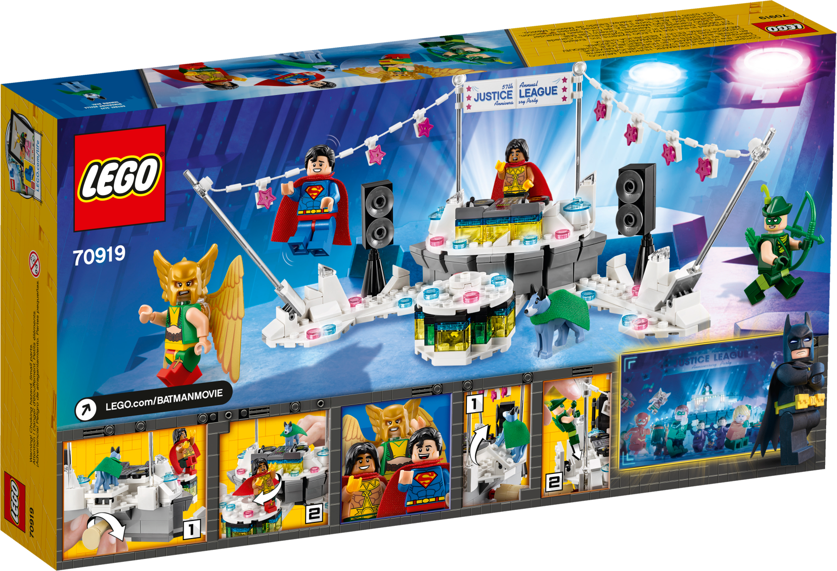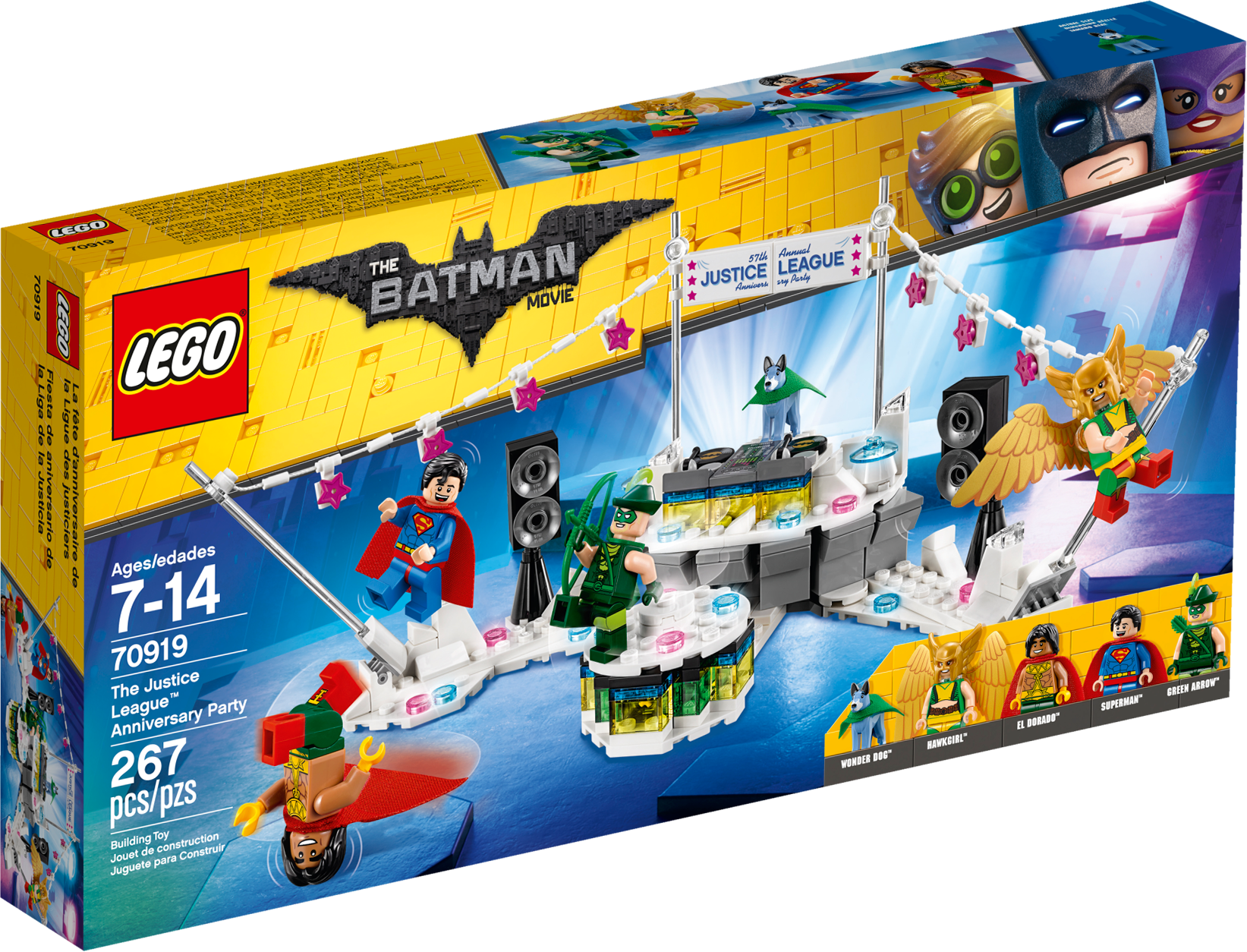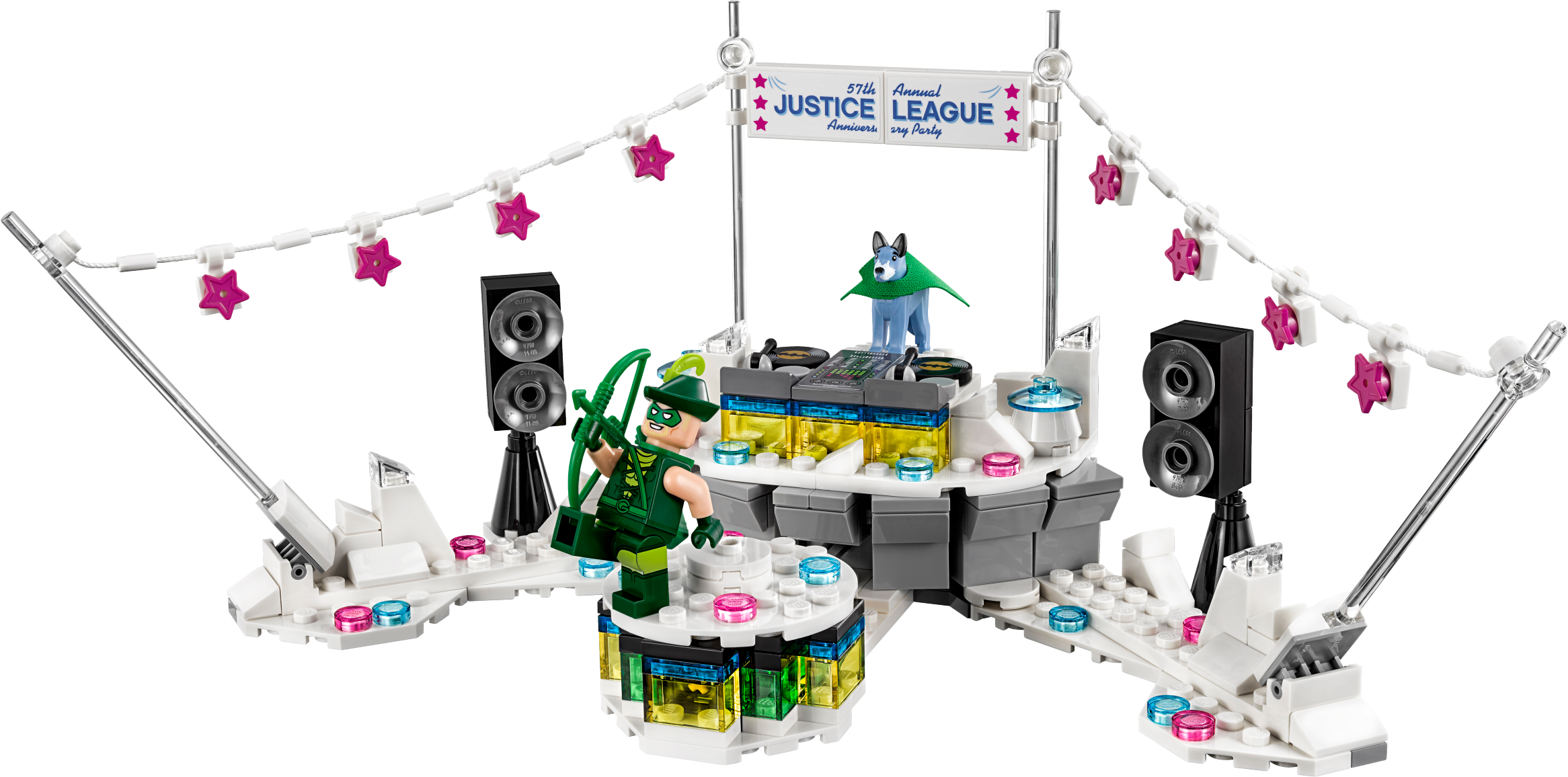 Recreate the hilarious scene from THE LEGO® BATMAN MOVIE where the Justice League™ throw a big party… but don’t invite Batman™! The Justice League Anniversary Party set features a wheel-operated, rotating dance floor, DJ booth with record decks, bunting and loads of translucent decorative elements. This LEGO Batman toy also features 4 minifigures, including Superman™, plus a Wonder Dog™ figure. (Note: Batman minifigure not included in this set.) Includes 4 minifigures: Superman™, Hawkgirl™, El Dorado™ and Green Arrow™, plus a Wonder Dog™ figure. Features a wheel-operated, rotating dance floor for a minifigure, DJ booth with a flip-up seat for the Wonder Dog™ figure or space for a minifigure and detailed record decks with 2 turntables and adjustable record needles, ‘57th Annual Justice League Anniversary Party' banner, bunting with attachment points for minifigures, and lots of multicolored, translucent disco-light-style and decorative elements. Turn the wheel behind the DJ booth to spin the dance floor around. Place Wonder Dog™ in the DJ booth or flip up the seat to put a minifigure behind the decks. Also includes Green Arrow’s bow. Accessory elements include Green Arrow's quiver and Wonder Dog's new-for-January-2018 cape. Hawkgirl™ and El Dorado™ minifigures are new for January 2018. This LEGO® Batman™ toy is suitable for ages 7-14. Measures over 4” (12cm) high, 9” (24cm) wide and 5” (14cm) deep.