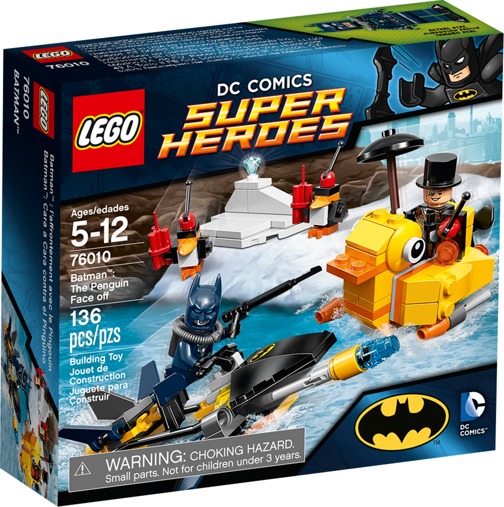 Help Scuba Batman™ defeat The Penguin in a battle on the water! The Penguin has stolen a priceless diamond and has two of his robot penguins guarding it. Help Scuba Batman™ to sweep in on his speedy scuba vehicle and get it from their grasp before The Penguin can attack with his crazy duck boat. Both cool vehicles are armed with 2 flick missiles, so if you need to shoot your way out of a tough corner, you have the firepower to do it! Includes Scuba Batman and The Penguin minifigures with weapon and assorted accessories.Includes exclusive Scuba Batman™ and The Penguin minifigures with weapon and assorted accessoriesFeatures Batman’s scuba vehicle and The Penguin’s duck boat, both with 2 flick missilesIncludes a harpoon, umbrella and dynamiteDodge the robot penguinsSpeed in and grab the diamondFire the flick missiles and send The Penguin waddling homeBatman’s scuba vehicle measures over 1” (4cm) high, 4” (12cm) long and 1” (5cm) wideDuck measures over 1” (4cm) high, 2” (6cm) long and 1” (4cm) wide