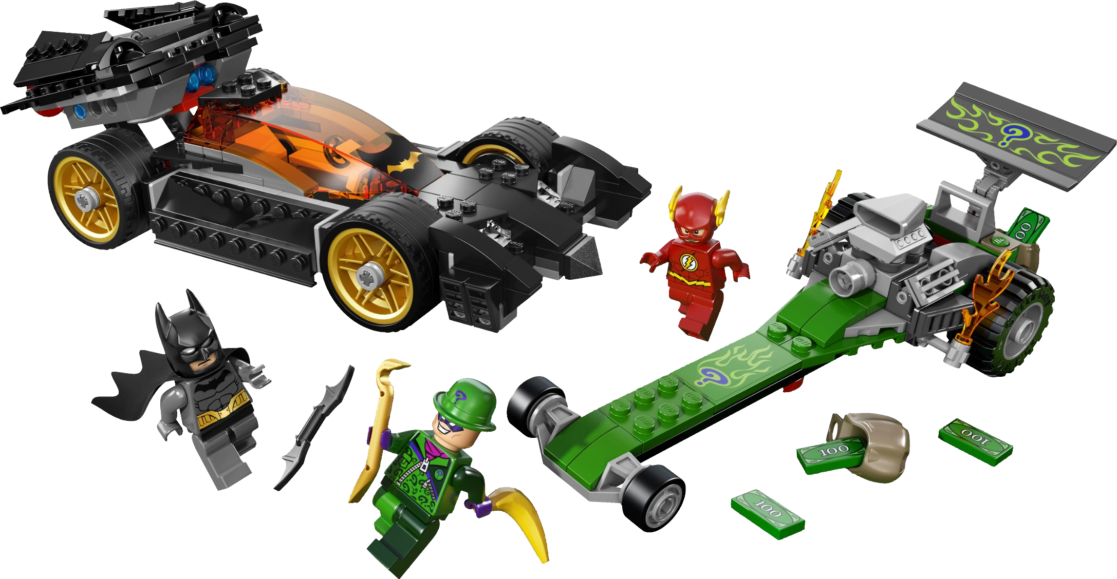 Pursue The Riddler’s Dragster and call in The Flash to catch him! The Riddler has robbed the Gotham City bank and is getting away in his ultra-fast dragster. Pursue him with Batman in his sleek new Batmobile, but watch out for the bombs being dropped by the dragster. If The Riddler manages to get away, call in help from The Flash, The Fastest Man Alive! Will he arrive in time to save the day? Only you can decide! Includes 3 minifigures with assorted weapons and an accessory: never-before-seen Batman (with new suit) and The Flash, and The Riddler.Includes 3 minifigures with assorted weapons and an accessory: never-before-seen Batman (with new suit) and The Flash, and The RiddlerFeatures the Batmobile with detachable cockpit and hidden flick missiles, and The Riddler’s dragster with big engine, flames, huge rear wheels, money bags and a detachable bombWeapons include Batman’s Batarang and a crowbarAlso includes a bananaLeave a slippery banana trap for The FlashThrow the Batarang and send The Riddler spinning Pull a scorching wheelie in the dragster and release the bombBatmobile measures over 2” (7cm) high, 7” (20cm) long and 3” (9cm) wideDragster measures over 2” (6cm) high, 6” (16cm) long and 2” (6cm) wide