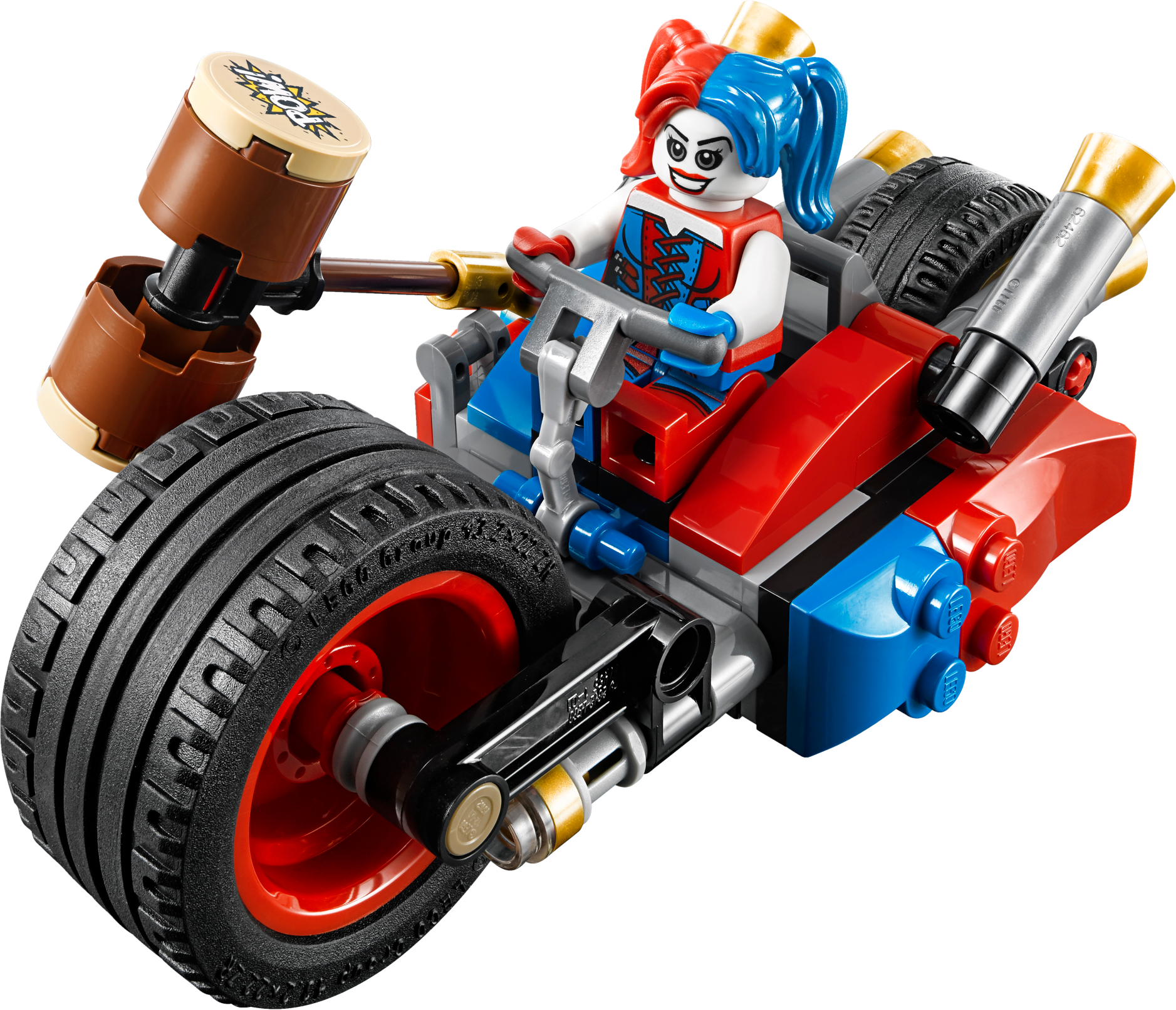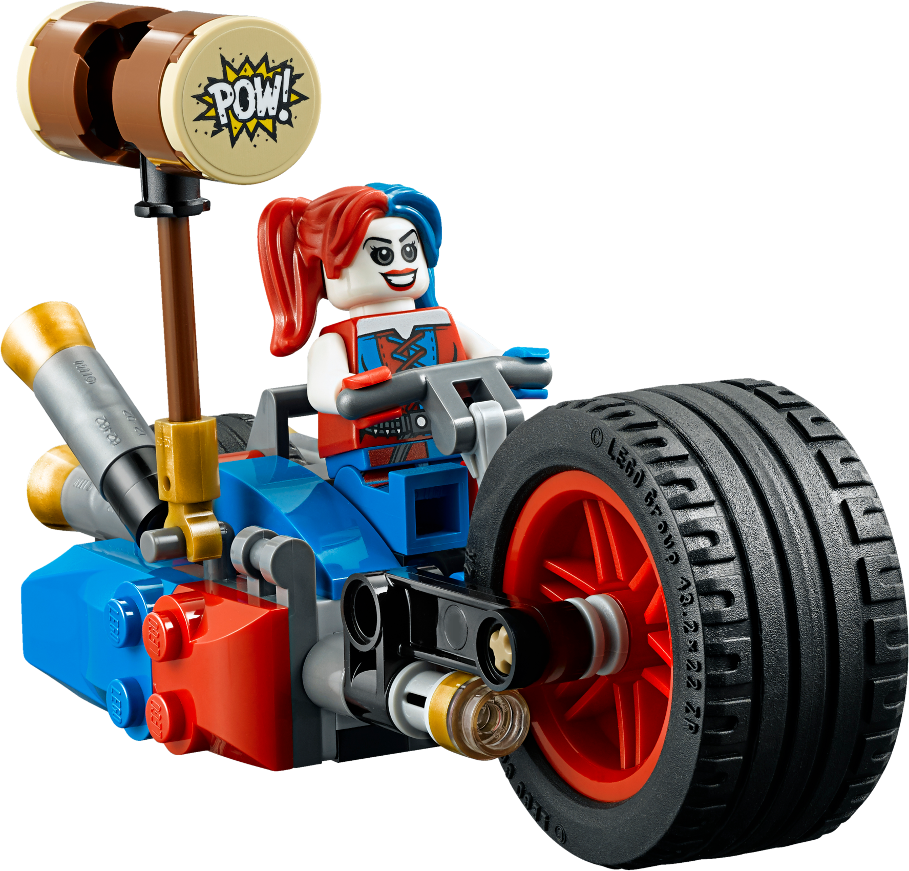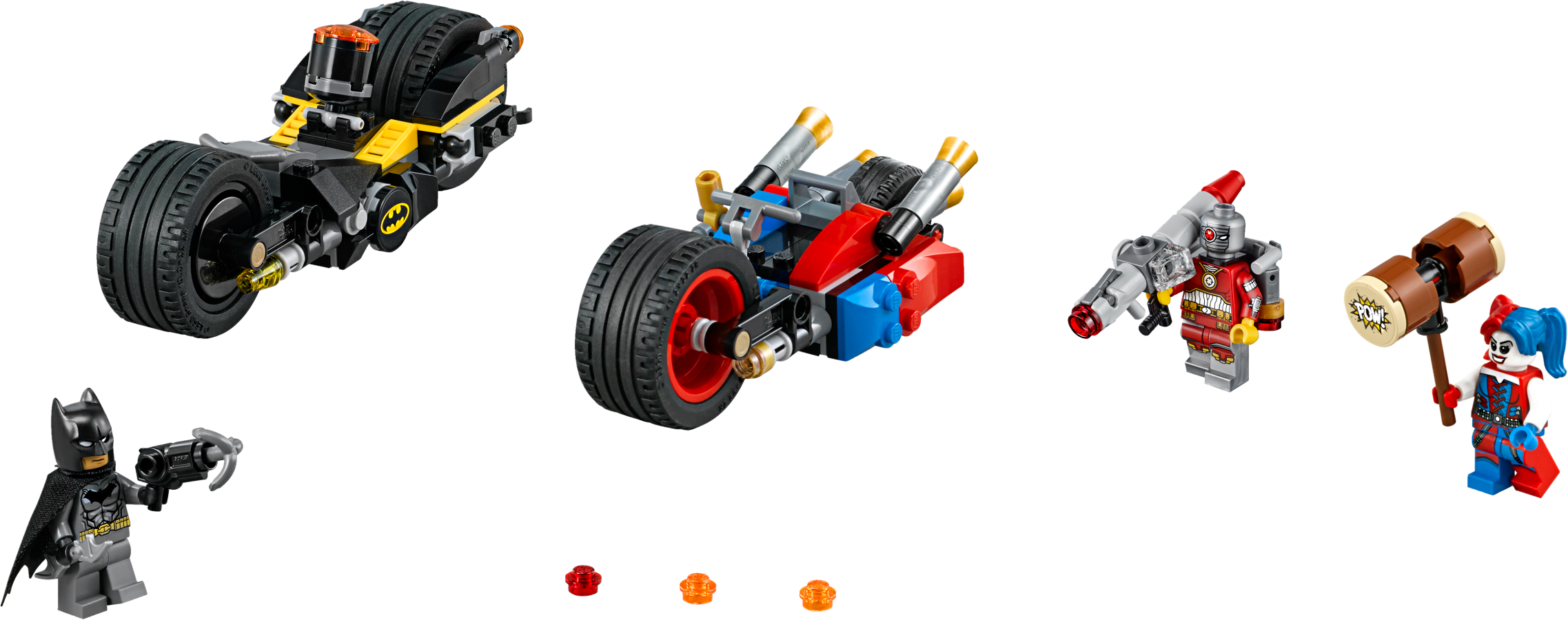 Speed after Harley Quinn’s bike on Batman’s awesome Batcycle! Deadshot™ is flying with his jetpack and firing his bazooka, so blast him out of the sky with the Batcycle stud shooters! Catch up with Harley and take the battle to the ground with Batman’s Batarang and grapple-hook gun. But beware—Harley can attach her big hammer to her bike and send Batman™ flying! Includes 3 minifigures: Batman™, Harley Quinn™ and Deadshot™. The Batcycle features big wheels with rubber tires, 2 rotating stud shooters and weapon holders for the Batman’s Batarang and grapple-hook gun. Harley Quinn’s bike features a big front wheel, rubber tires, adjustable exhausts and a hinged attachment point for Harley’s hammer to fold out and knock Batman™ over. Weapons include Batman’s Batarang and grapple-hook gun, Harley Quinn’s hammer and Deadshot’s stud-shooting bazooka. Includes Deadshot’s jetpack accessory element. Batcycle measures over 1” (5cm) high, 5” (15cm) long and 2” (6cm) wide. Harley Quinn’s bike measures over 3” (8cm) high, 4” (12cm) long and 2” (6cm) wide.