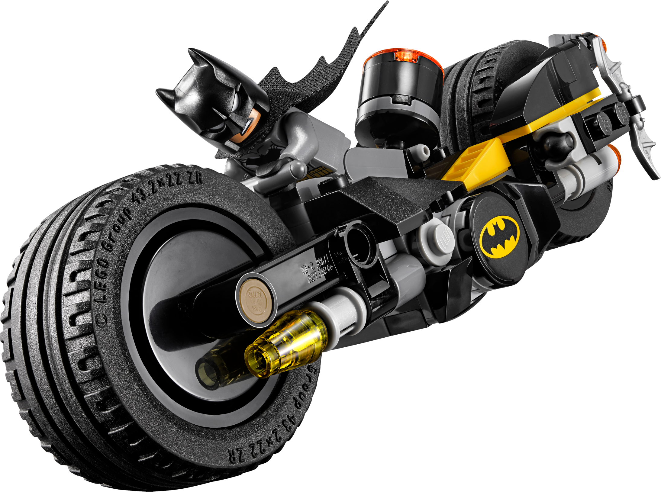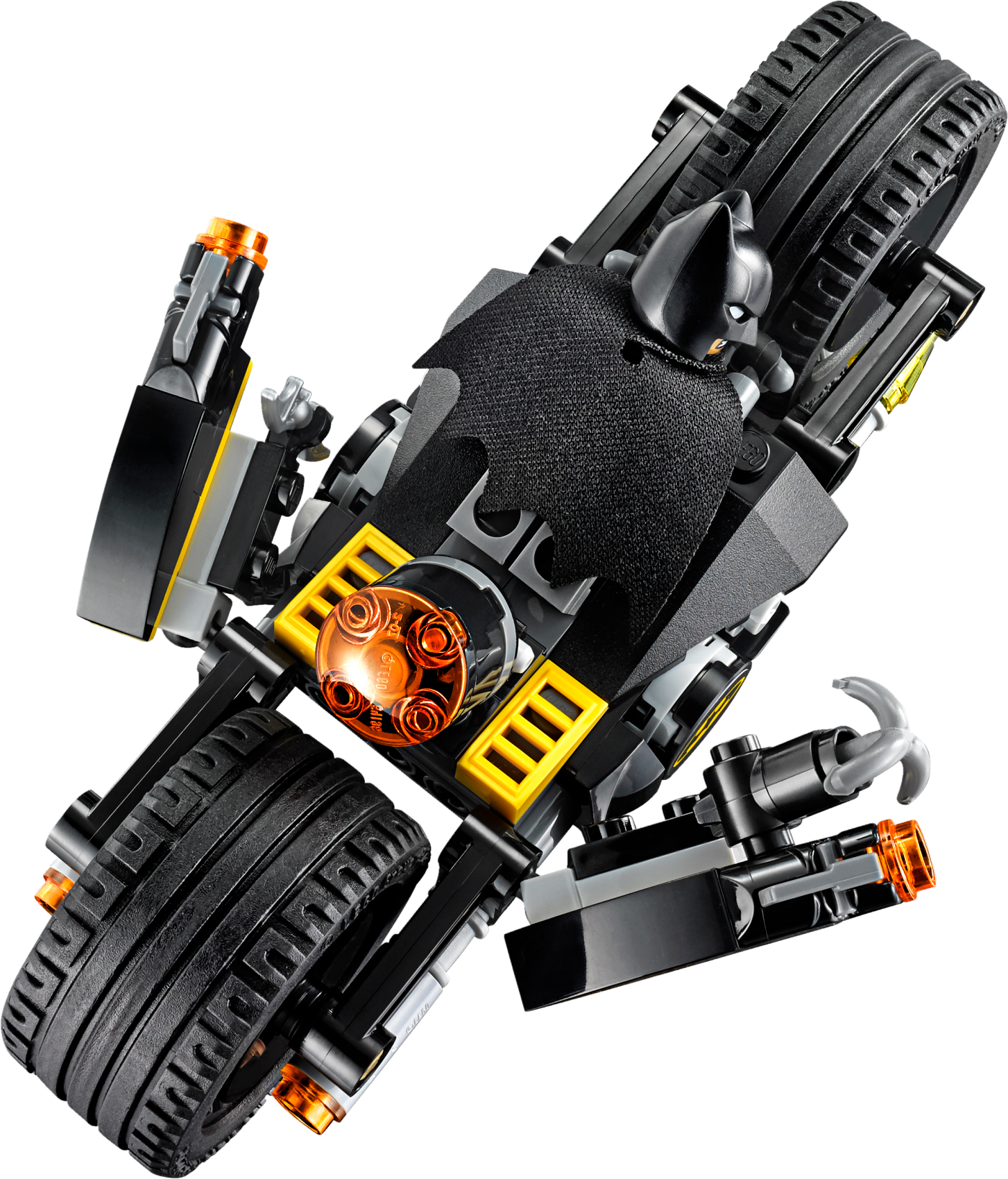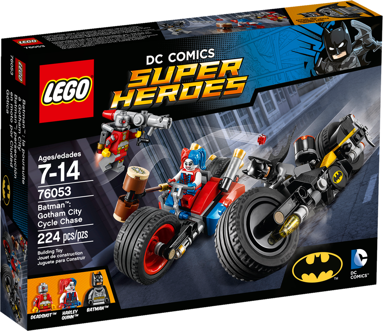 Speed after Harley Quinn’s bike on Batman’s awesome Batcycle! Deadshot™ is flying with his jetpack and firing his bazooka, so blast him out of the sky with the Batcycle stud shooters! Catch up with Harley and take the battle to the ground with Batman’s Batarang and grapple-hook gun. But beware—Harley can attach her big hammer to her bike and send Batman™ flying! Includes 3 minifigures: Batman™, Harley Quinn™ and Deadshot™. The Batcycle features big wheels with rubber tires, 2 rotating stud shooters and weapon holders for the Batman’s Batarang and grapple-hook gun. Harley Quinn’s bike features a big front wheel, rubber tires, adjustable exhausts and a hinged attachment point for Harley’s hammer to fold out and knock Batman™ over. Weapons include Batman’s Batarang and grapple-hook gun, Harley Quinn’s hammer and Deadshot’s stud-shooting bazooka. Includes Deadshot’s jetpack accessory element. Batcycle measures over 1” (5cm) high, 5” (15cm) long and 2” (6cm) wide. Harley Quinn’s bike measures over 3” (8cm) high, 4” (12cm) long and 2” (6cm) wide.