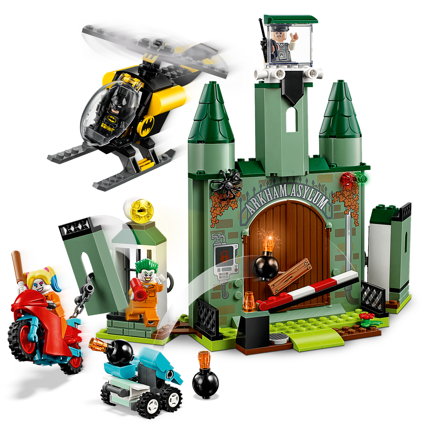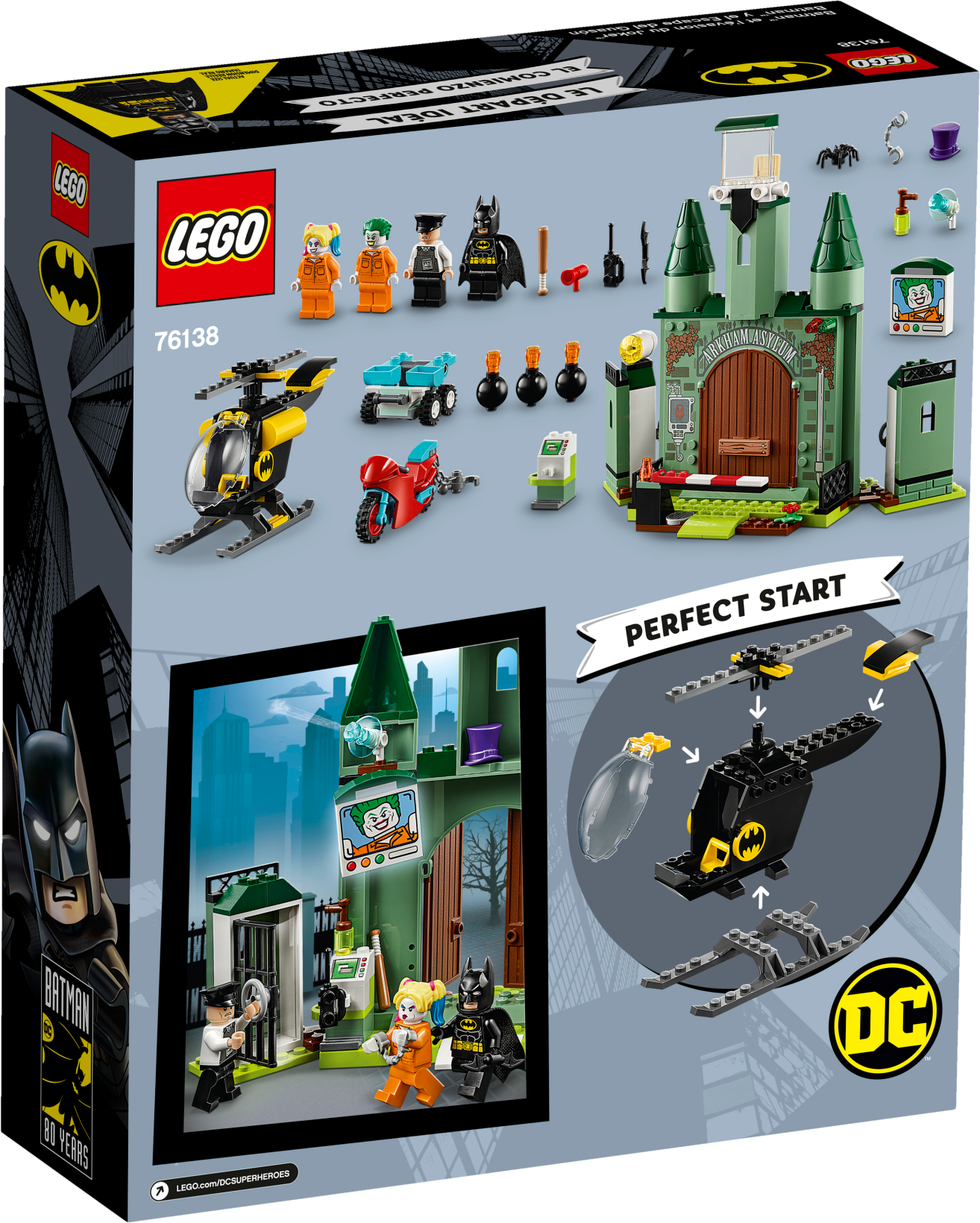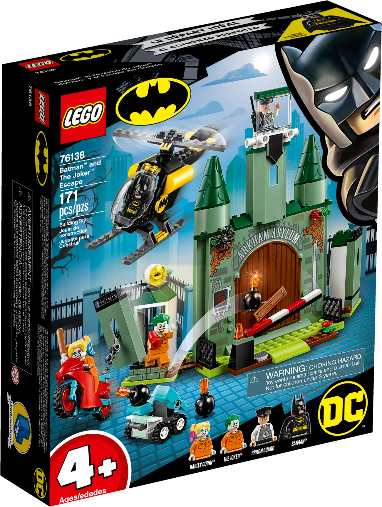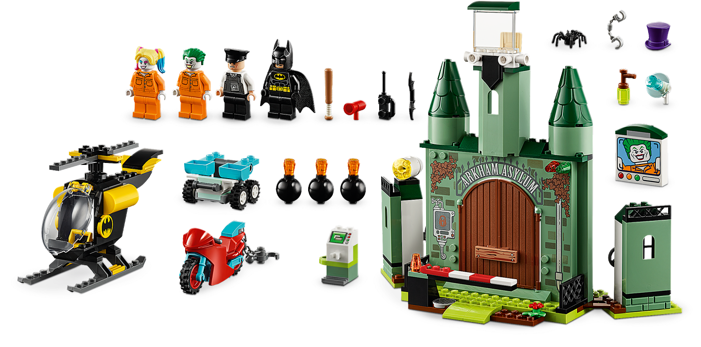 Young children will love role-playing as Batman™ to stop a Super-Villain prison breakout with this LEGO® DC Batman 76138 Batman and The Joker™ Escape super-hero toy playset. Specially designed to be fun and easy for preschoolers, this LEGO 4+ set includes a Batman helicopter toy with a special Starter Brick chassis that lets even first-time builders experience the pride of building all on their own. An ideal birthday gift, this kids’ toy playset also features an Arkham Asylum model with lots of details to inspire play including 2 jail cells with walls that can be pulled down by attaching a chain and hook from Harley Quinn’s bike. It comes with 4 LEGO minifigures with weapons and a simple guide to build and play. Instructions PLUS are also available for this Batman playset in the LEGO Life app for smartphones and tablets. These easy-to-use, intuitive building instructions let kids zoom, rotate and visualize their creation using the special ghost mode as they go. LEGO® 4+ sets are specially designed to be fun and easy for youngsters and help to grow their confidence with simple building steps for the perfect start to LEGO brick building. This super-hero toy includes 4 LEGO® minifigures: Batman™, Harley Quinn™, The Joker™ and a prison guard. Arkham Asylum features an opening barrier, entrance doors with a removable crossbar lock, watchtower with a minifigure seat, 2 prison wings each with an opening jail cell for a minifigure, rotating buildable searchlight, TV screen element with image of The Joker™, buildable control panel with a detachable handcuffs element, plus 3 Batman villains’ possessions—buildable Scarecrow™ fear gas container and Mr. Freeze™ ray gun, plus Penguin’s hat element. Batman’s helicopter features a Starter Brick chassis, opening minifigure cockpit and rotating rotors. Harley Quinn’s bike features space for a minifigure plus a chain and hook to pull the mobile catapult or pull down the prison cell walls. Mobile catapult has 2 launchers plus 3 buildable bombs. This cool Batman™ toy playset includes Batman’s Batarang and megaphone element, and Harley Quinn’s baseball bat. Harley Quinn™ and The Joker™ minifigures with prison outfit decoration are new for June 2019. The best super-hero gift for preschoolers, LEGO® 4+ introduces your child to a wide universe of their movie favorites, TV characters and everyday heroes. LEGO® 4+ building sets were previously known as LEGO Juniors and can be built together with all other original LEGO sets and LEGO bricks for creative building. Use the LEGO® Life app to access the intuitive Instructions PLUS building instructions. Help even younger builders through the building process, with easy-to-use zoom, rotate and ghost-mode functions to visualize their creations as they go. Arkham Asylum measures over 8” (21cm) high, 9” (23cm) wide and 3” (10cm) deep. Batman™ helicopter toy measures over 3” (9cm) high, 5” (14cm) long and 1” (4cm) wide.