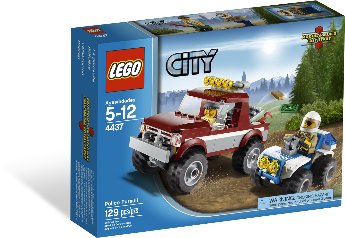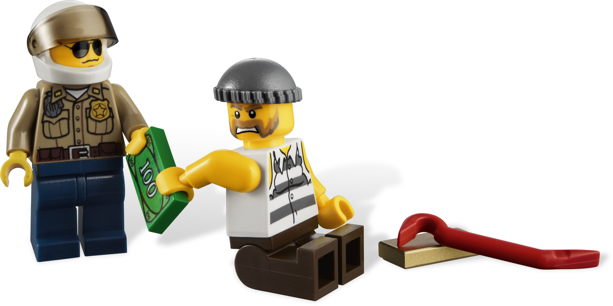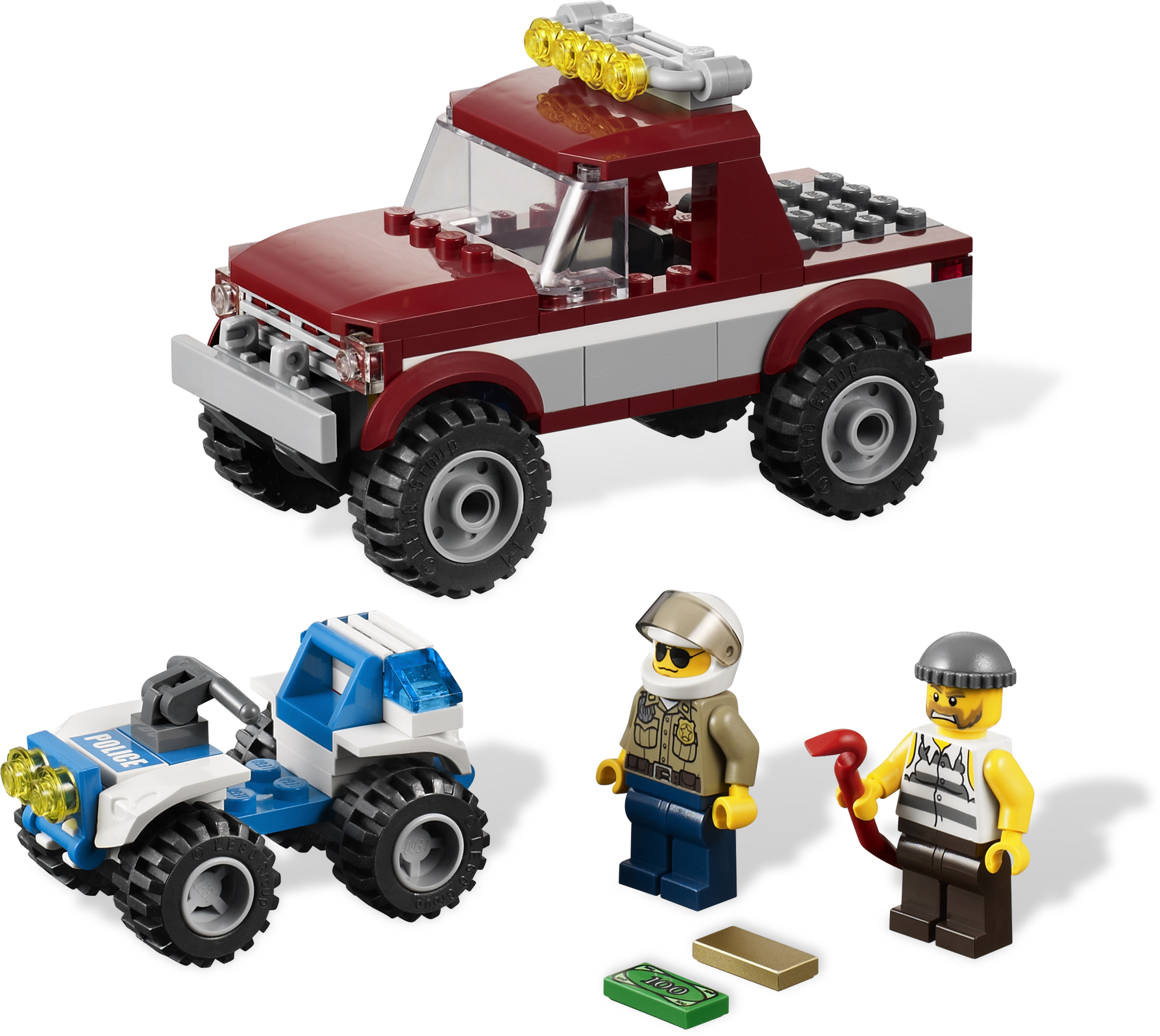 Catch the robber on the run with the police ATV! Help! The robber is getting away in his cool off-roader with stolen money and a gold bar. Chase him down and catch him with the forest policeman on the ATV! Includes forest policeman and robber minifigures.Includes 2 minifigures: forest policeman and robberVehicles include police ATV and robber’s off-road vehicleFeatures gold bar, money bill and crowbarCatch the robber before he escapes!Robber’s off-road vehicle measures over 4” (12cm) longPolice ATV measures over 2” (6cm) long