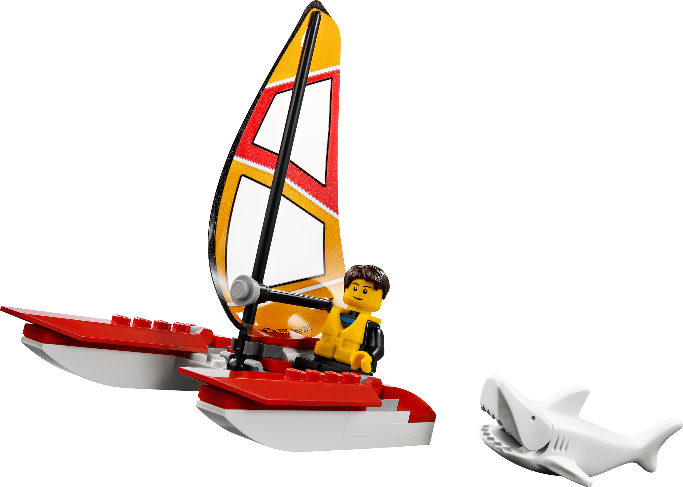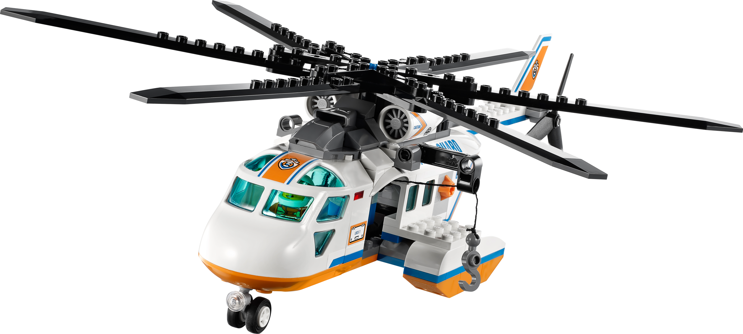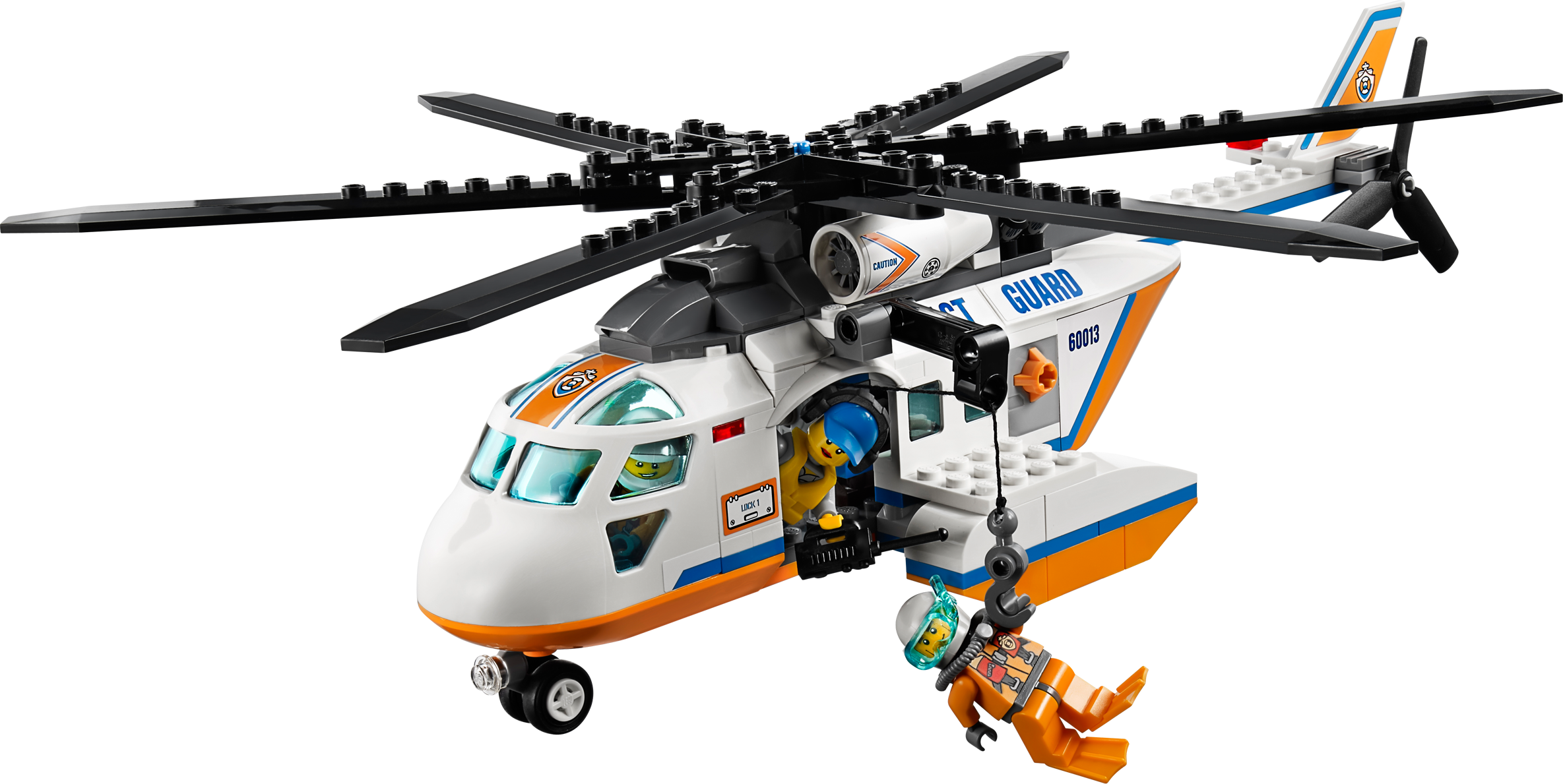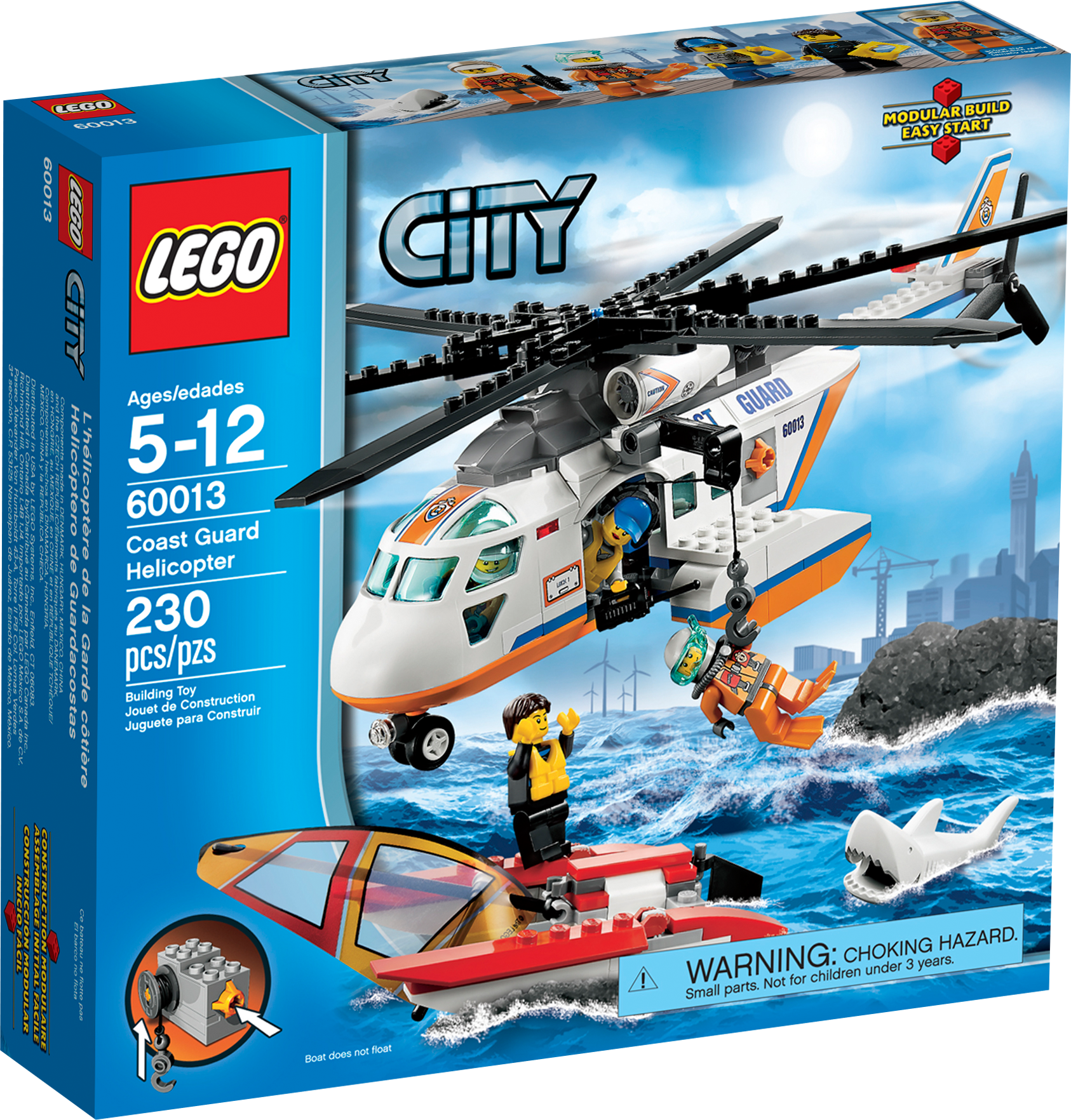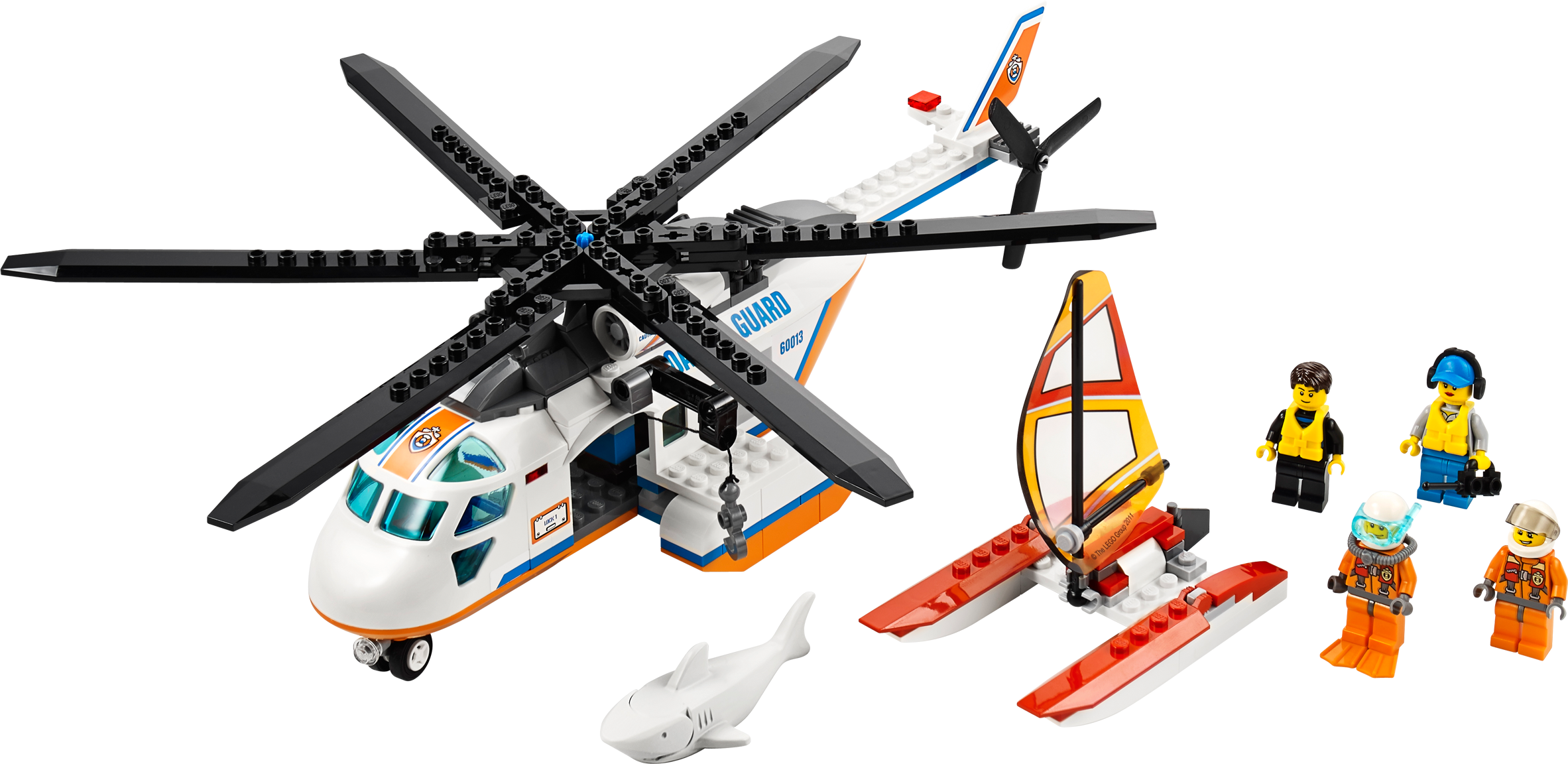 Fly to the sailor’s rescue in the Coast Guard Helicopter! Take flight in the Coast Guard Helicopter and search the sea for the stranded sailor! Find his broken down catamaran sailboat with a falling sail function before the great white shark does! Lower the diver down with the functioning winch and help the rescuer to lift the sailor out of the water with the life preserver. Spin the rotors to take off and return him to LEGO® City! Includes 4 minifigures with accessories: pilot, diver, rescuer and a sailor.• Includes a great white shark and 4 minifigures with accessories: pilot, diver, rescuer and a sailor• Features a working winch, wheels and spinning rotors• Also includes a catamaran sailboat with falling sail function• Accessories include a life jacket and diving gear• Lower the winch and rescue the sailor!• Spin the helicopter’s rotors!• Measures over 3" (10cm) high, 11" (30cm) long and 12" (31cm) wide• Catamaran sailboat measures over 4" (11cm) high, 3" (10cm) long and 2" (6cm) wide• Shark measures over 2" (7cm) long, 1" (3cm) wide and less than 1" (2cm) high