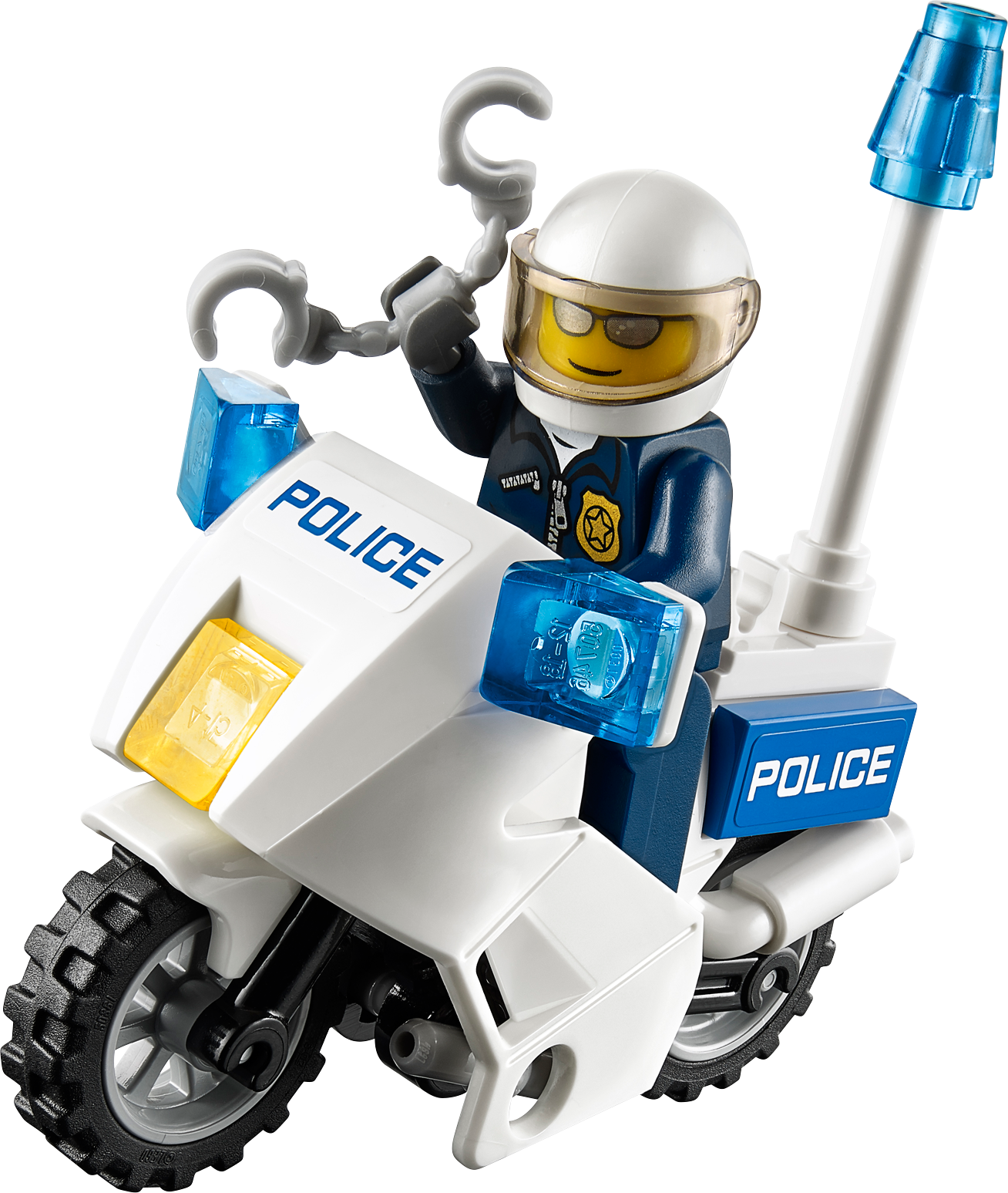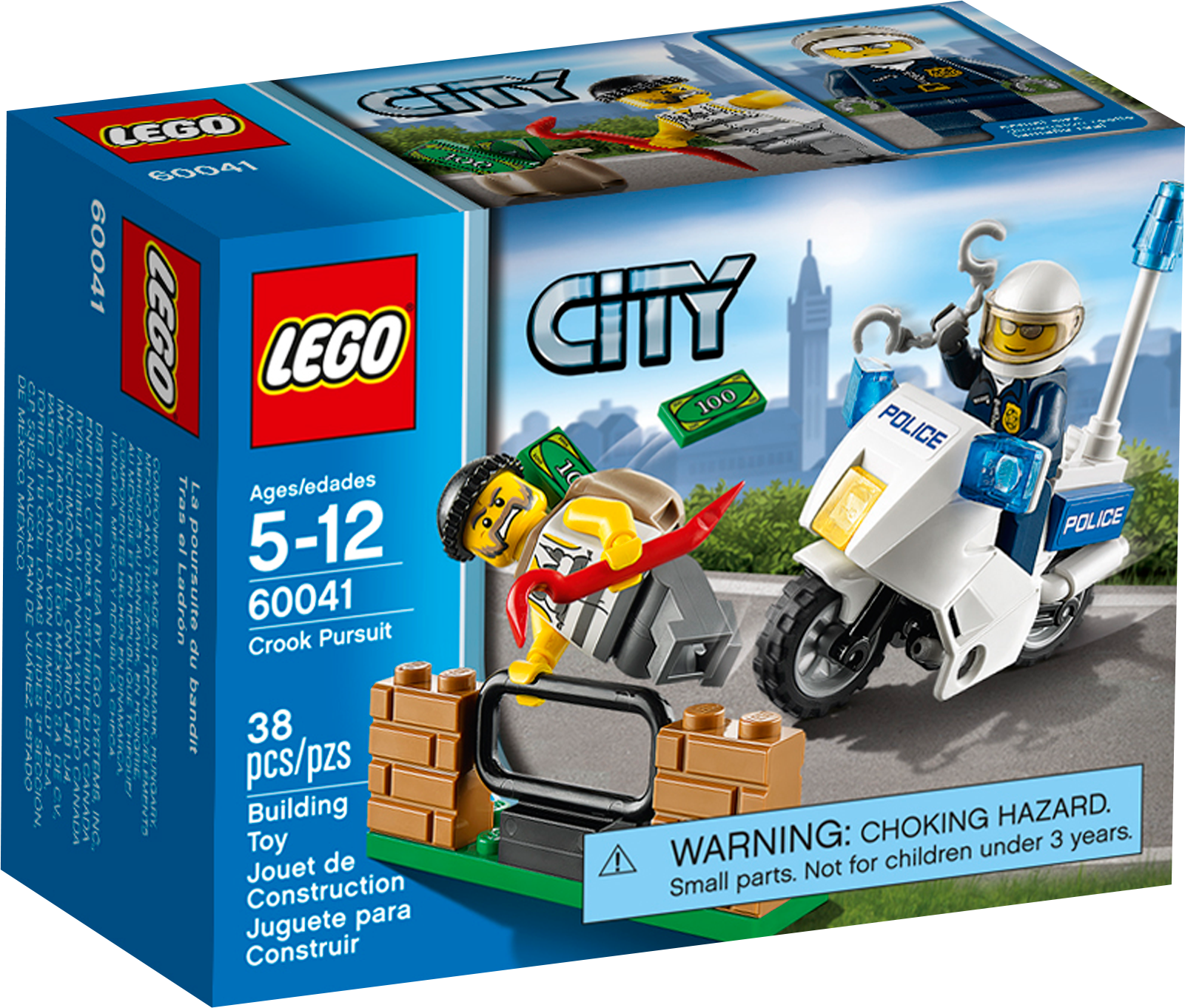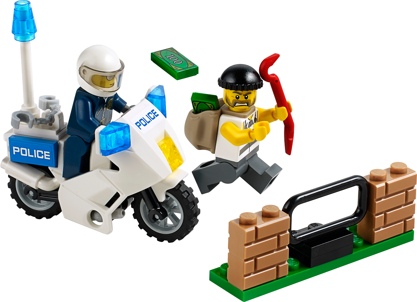 Catch the crook with the speedy police motorbike and put him in handcuffs! The crook is escaping with the stolen money! Help the policeman speed after him on the cool police motorbike and put him in handcuffs before he leaps the fence and makes off with his backpack full of loot. Includes crook and policeman minifigures with assorted accessories.Includes crook and policeman minifigures with assorted accessoriesFeatures a police motorbike and a wall/fence sectionAccessories include a crowbar, handcuffs, 2 money notes and a backpack Chase the crook on the fast police motorbikeJump the fence and make off with the loot! Motorbike measures over 2” (7cm) high, 2” (7cm) long and 1” (4cm) wideFence measures over 2” (6cm) wide and under 1” (2cm) high and 1” (1cm) deep
