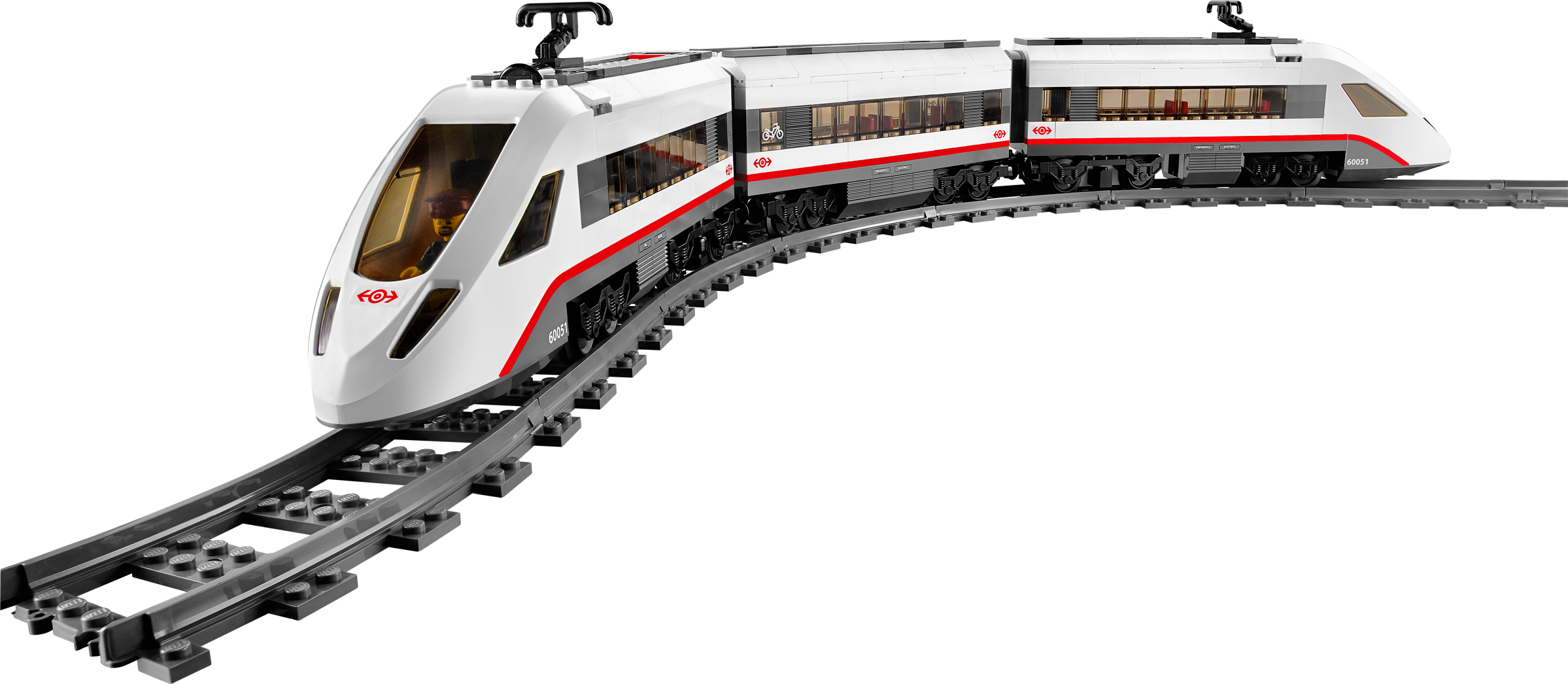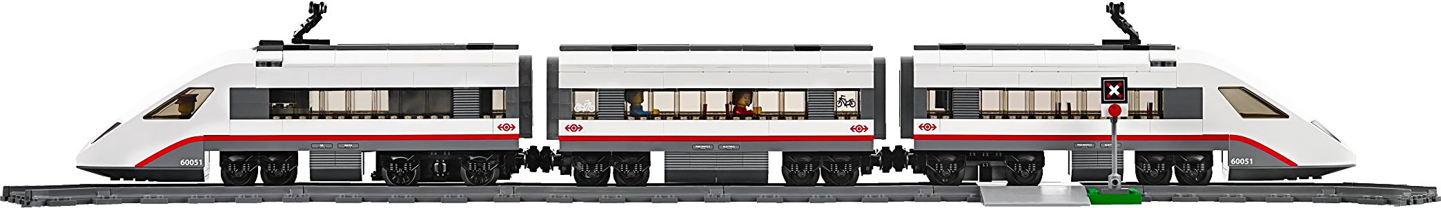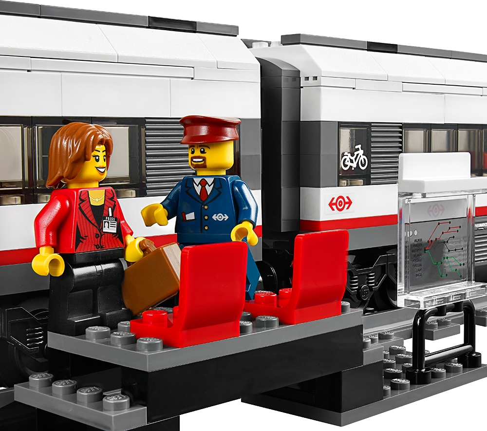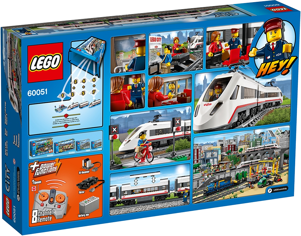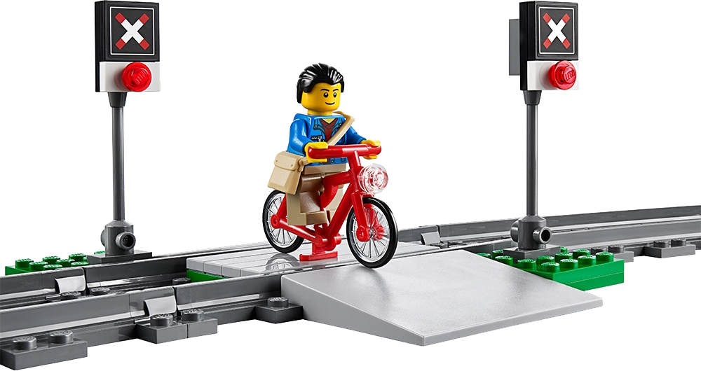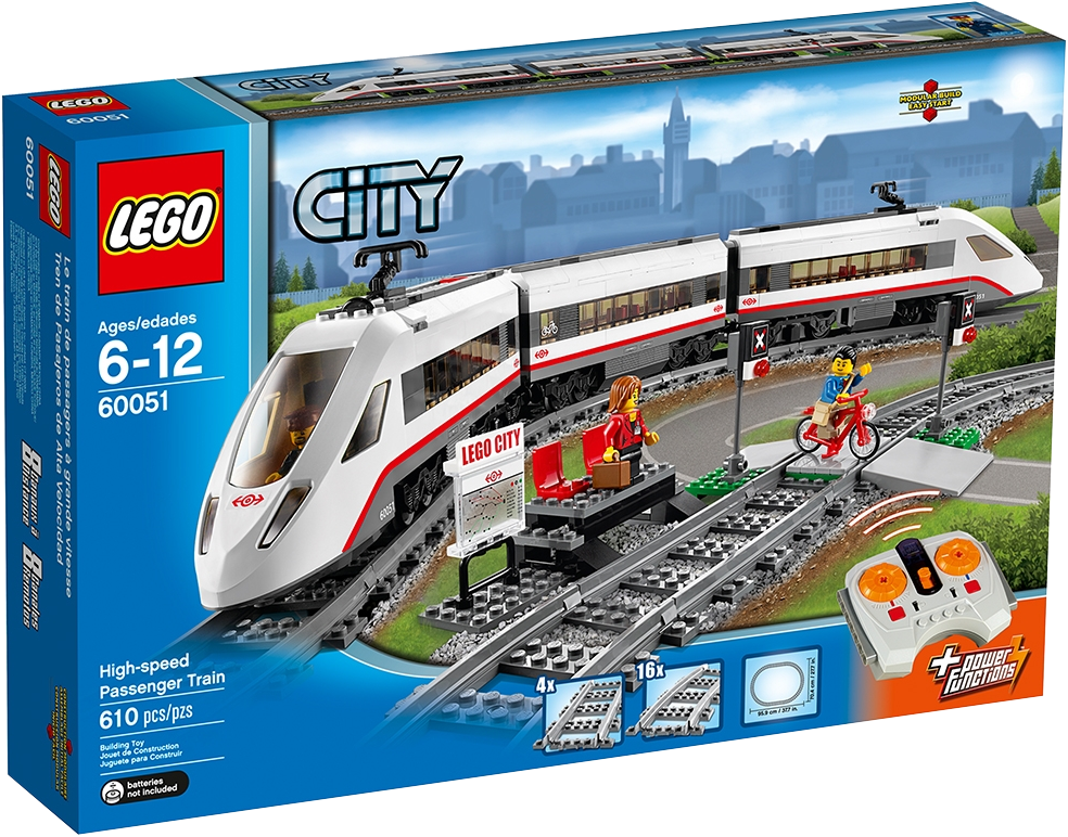 Travel around the city in no time with the motorized LEGO® City High-speed Passenger Train! Operate the 8-channel, 7-speed infrared remote control to power around the curved tracks at top speed. This streamlined, super-efficient train has a high-speed front profile and electricity contact points on top. Lift off the roof of the front car to place the driver inside at the cool dashboard and open the passenger cars to access the seats and tables. Wait for the train with the traveler at the way station, and pedal safely across the crossing with the cyclist once the train has gone past. Includes 3 minifigures: train driver, traveler and a cyclist.