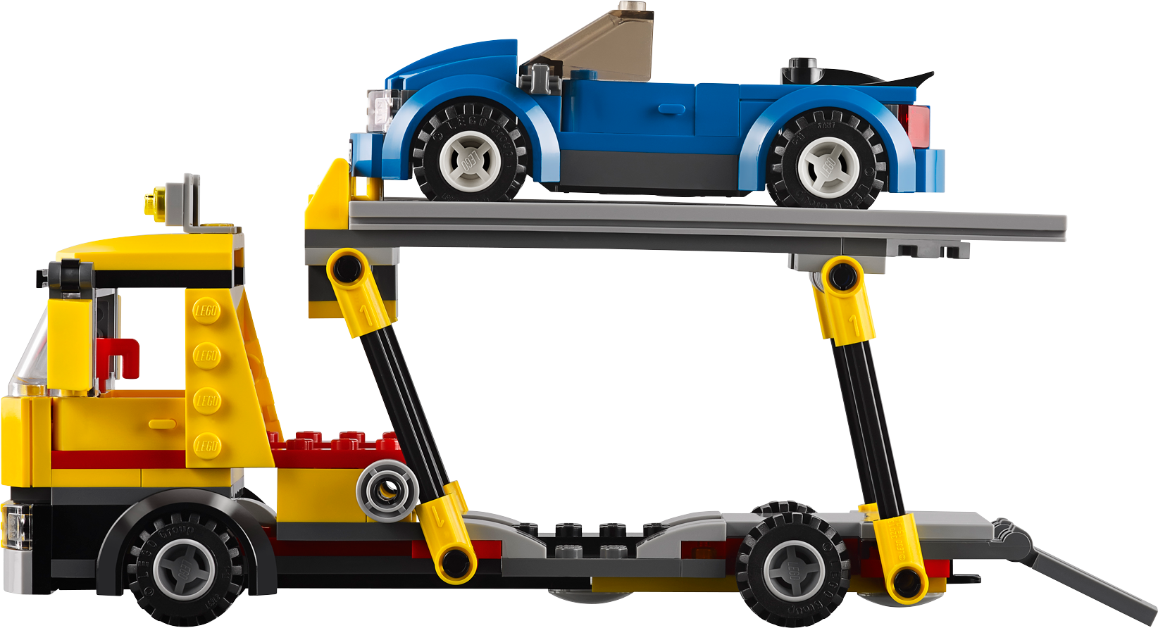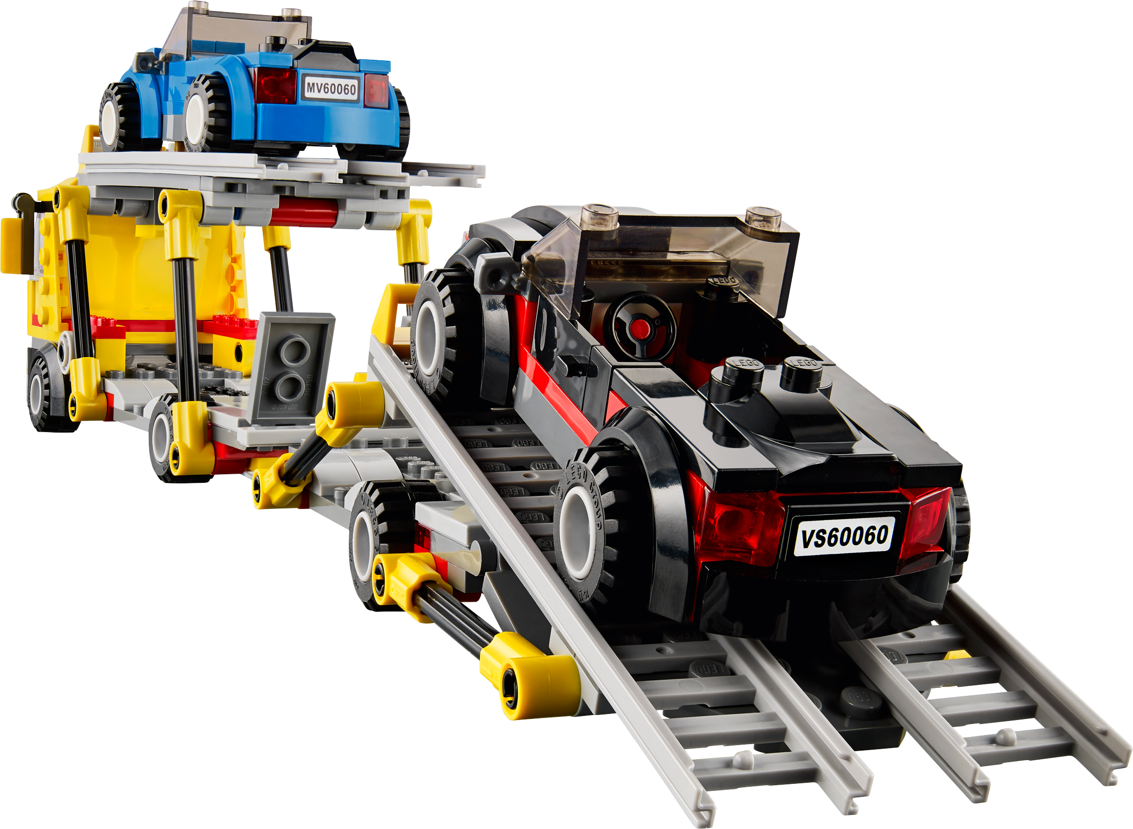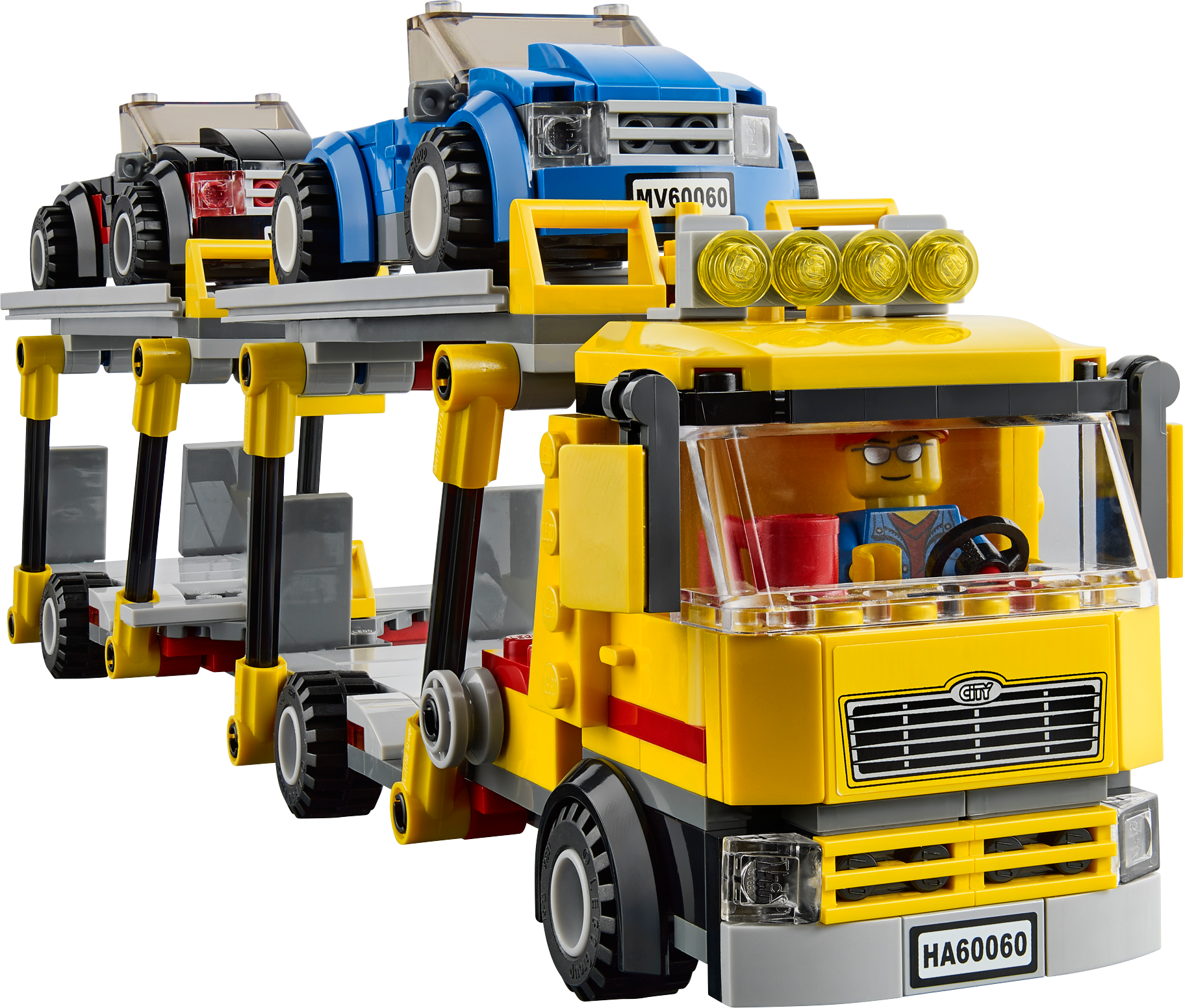 Deliver the shiny new cars to the LEGO® City dealerships with the amazing Auto Transporter! Detach the trailer, lower the ramps and offload the cool sports cars. After the customer signs the clipboard, lift the ramps back into position, hook up the trailer and jump back in the cab ready to collect more vehicles for the eager customers! Collect this and all the other vehicles in the Great Vehicles range! Includes 2 minifigures with assorted accessories: a driver and a dealer.