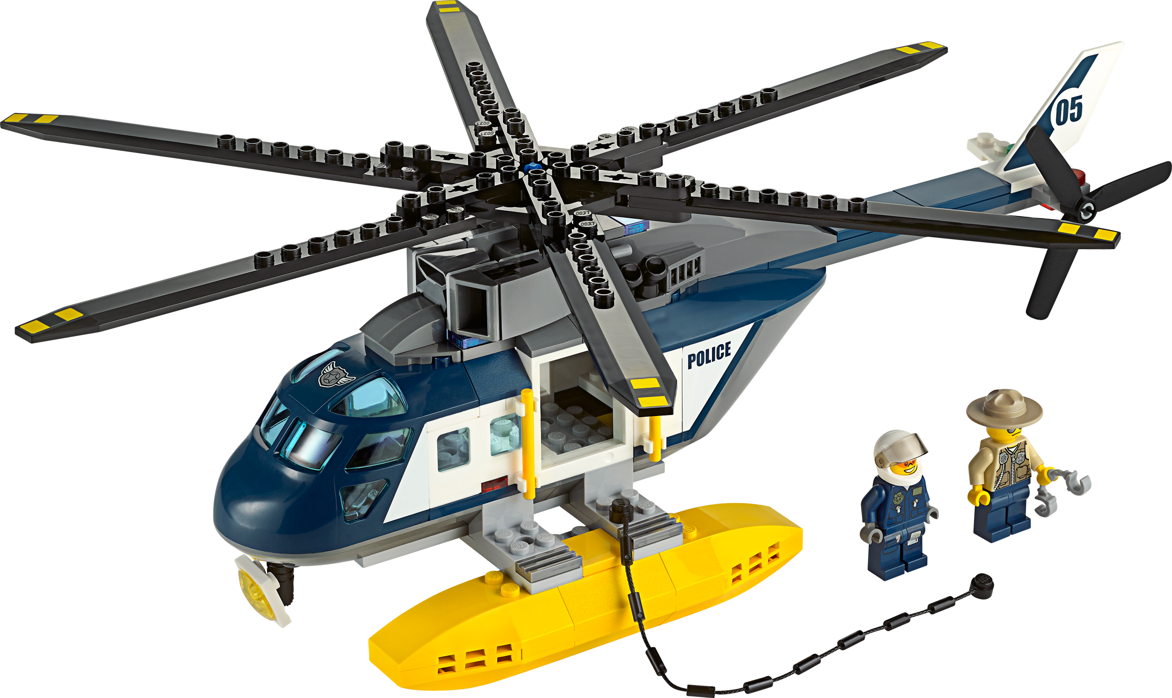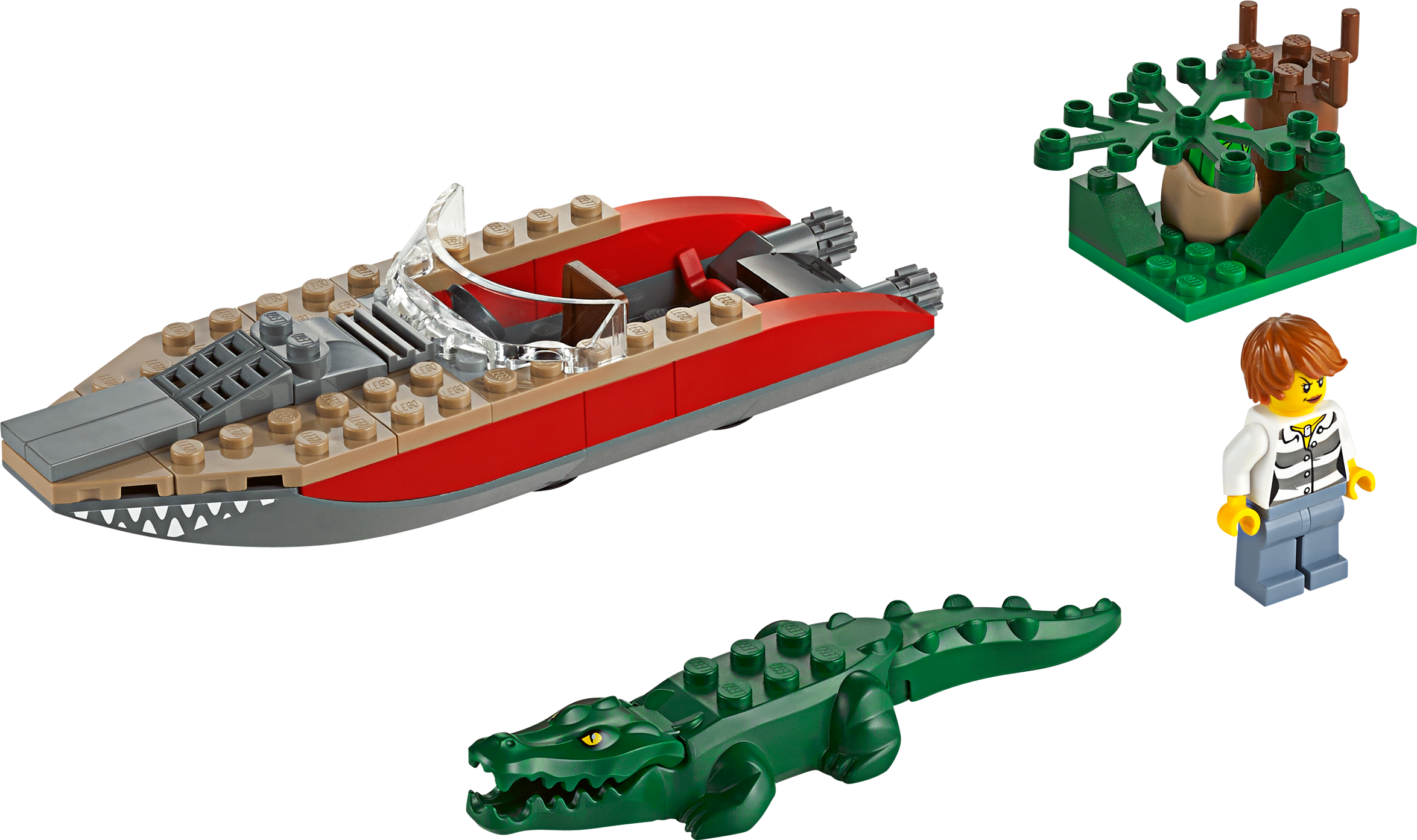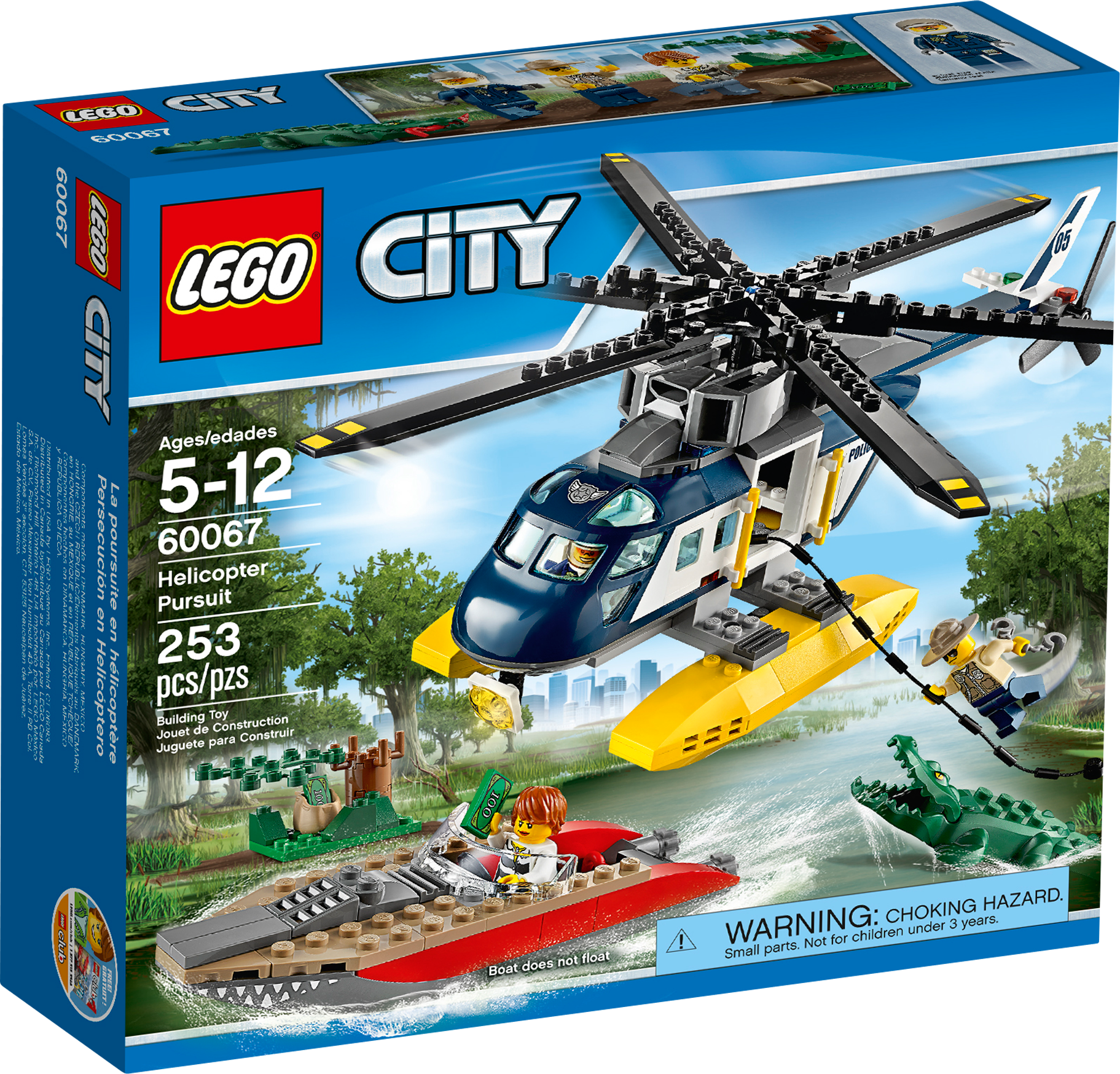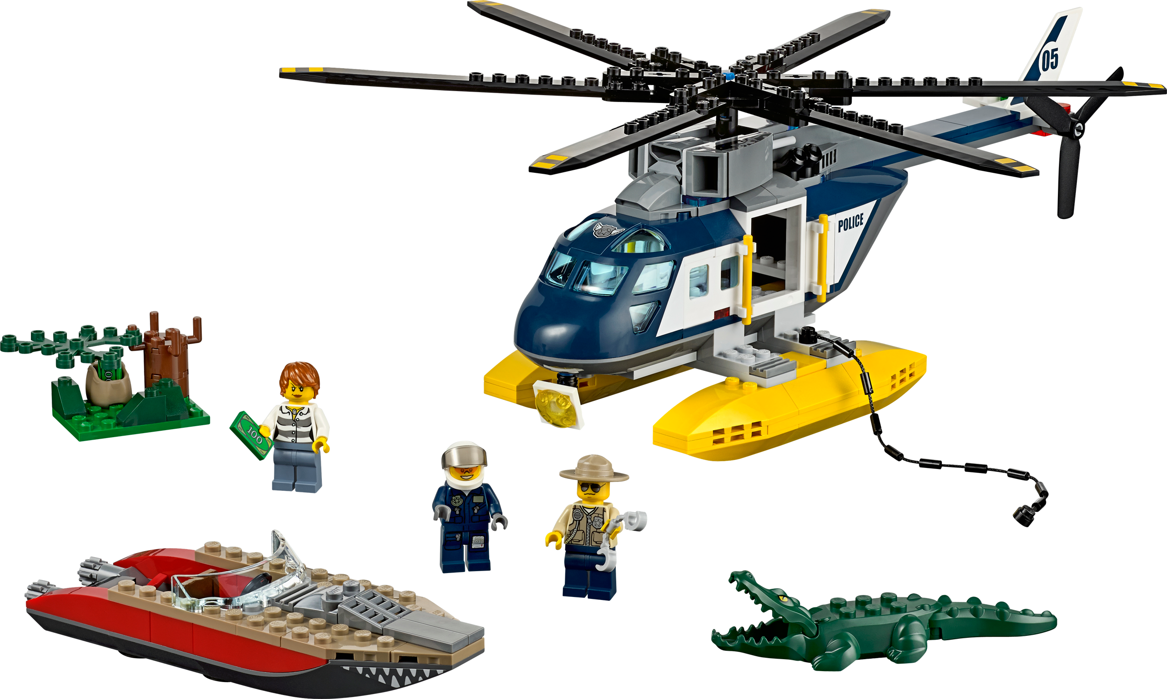 Board the fast-moving speedboat in an exciting Helicopter Pursuit! Join the high-speed pursuit! Stop the crook from escaping in her stolen speedboat. Jump aboard the powerful police helicopter and give chase! Thunder over the alligator infested swamp at breakneck speed and locate the fleeing crook. Lower the policeman down onto the fast-moving speedboat using the rope. Oh no… double trouble! Look out for the huge, snappy alligator lurking beneath the water! Includes 3 minifigures with assorted accessories: a pilot, a police officer and a crook. Includes 3 minifigures with assorted accessories: a pilot, police officer and a crook Features a police helicopter, crook’s speedboat, an alligator and a hideout Accessories include a crowbar, handcuffs, backpack and 2 banknotes Thunder over the swamp at breakneck speed! Lower the police officer down onto the fast-moving speedboat Watch out for snappy alligator! Police helicopter (with rotors) measures over 4” (12cm) high, 11” (30cm) long and 12” (31cm) wide Crook’s speedboat measures over 1” (3cm) high, 5” (15cm) long and 1” (4cm) wide