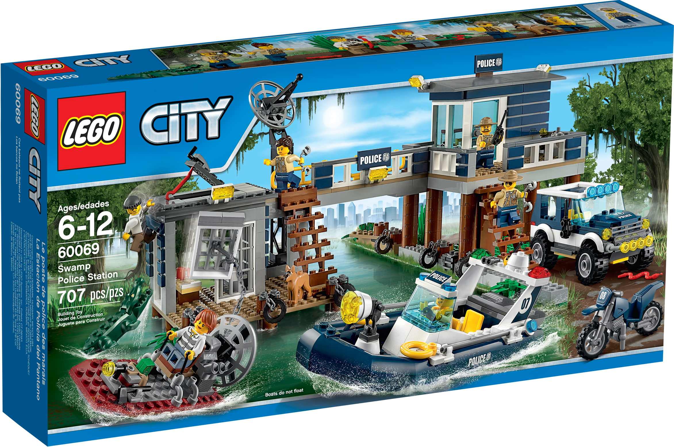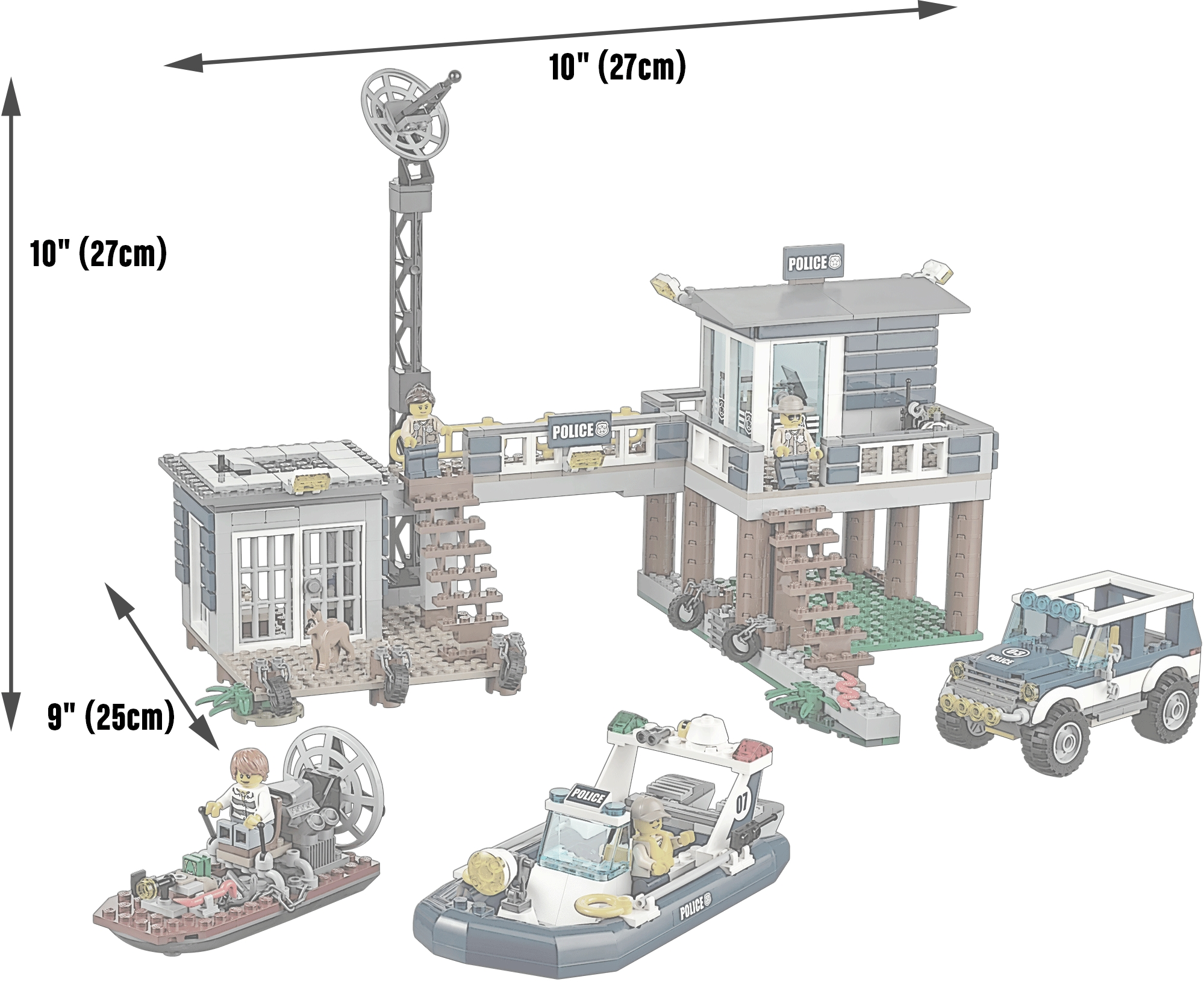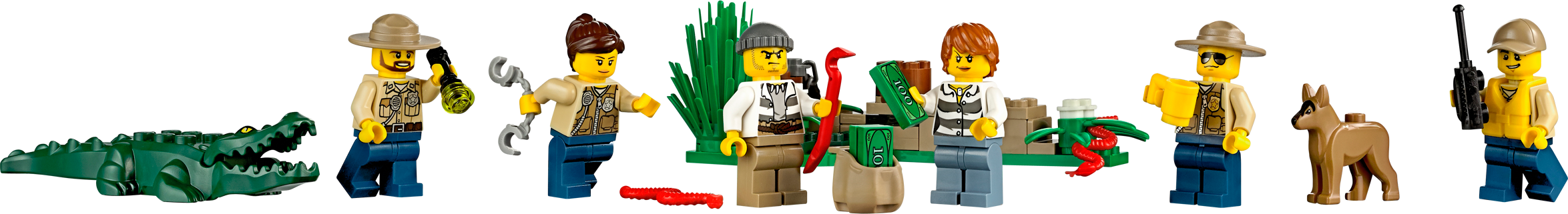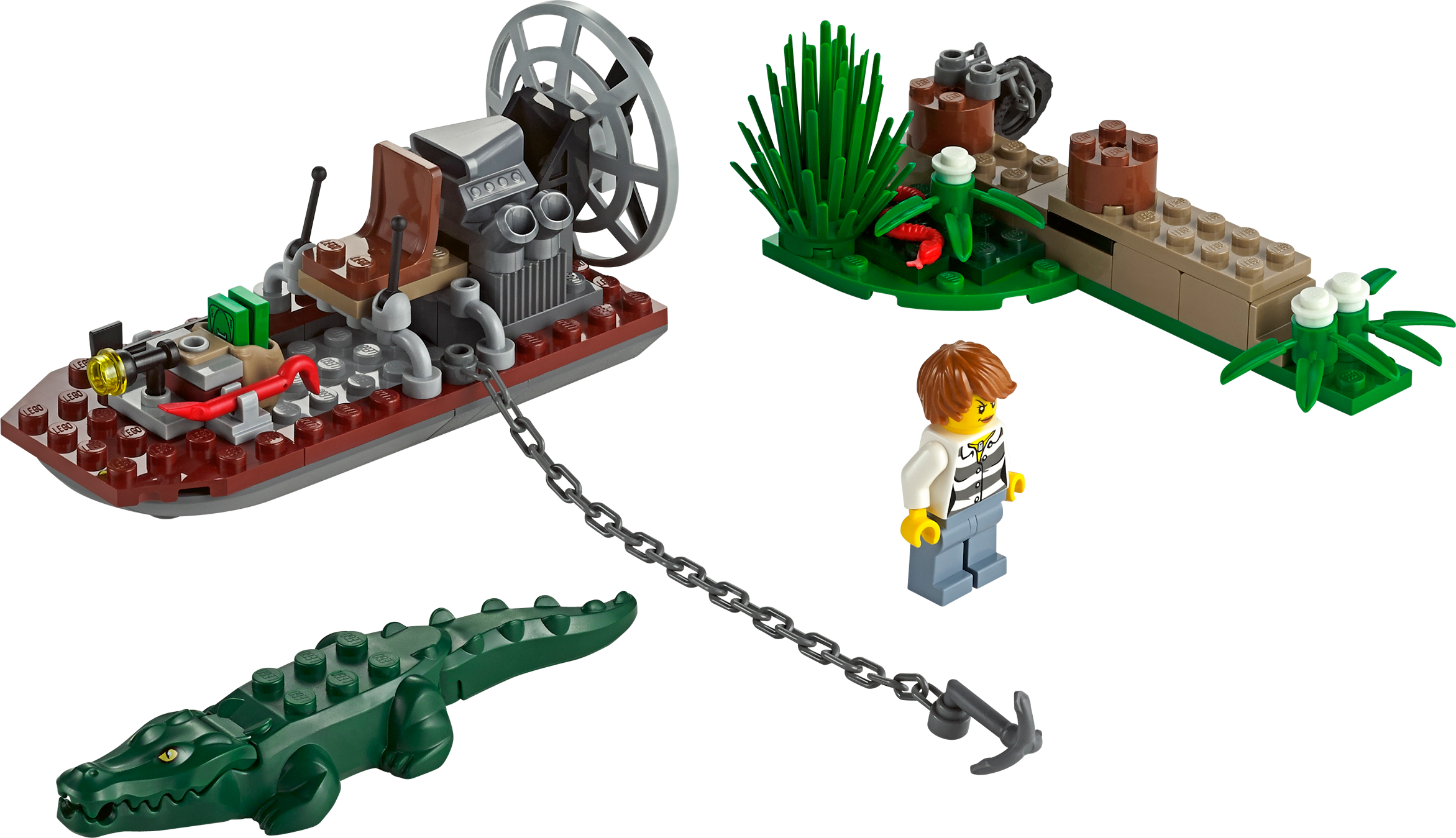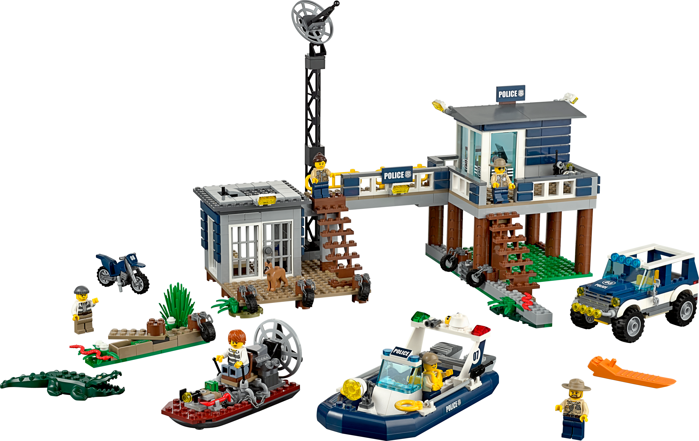 Foil the Swamp Police Station jailbreak and catch the crooks! It’s business as usual at the high-tech Swamp Police Station, when crash…! “Sound the alarm!” The crooks have carried out a daring jailbreak, by pulling the jailhouse door clean from its frame using a chain attached to their high-powered swamp boat! Mobilize all police units, deploy the 4x4 off-roader and jump aboard the powerful patrol boat. It’s time to catch those crooks and put them back behind bars where they belong! Includes 6 minifigures with assorted accessories: 2 crooks and 4 police officers. Includes 6 minifigures with assorted accessories: 2 crooks and 4 police officers Features a police station, 4x4 off-roader, police boat, crooks’ boat, off-road motorcycle, hideout and an alligator Police station features a command room, garage, police cell with breakout function, toilet, connecting bridge, radar dish, dog, coffee machine, chair, table, computer screen and a fan Crooks’ boat features a chain with anchor Police Boat features a searchlight and 2 lifebuoys Accessories include 2 pairs of handcuffs, 2 cups, 3 walkie-talkies, crowbar, axe, backpack, binoculars, 3 banknotes, 2 snakes and 3 glow-in-the-dark flies Tear out the jailhouse door! Mobilize all vehicles! Police station (with antenna raised) measures over 10” (27cm) high, 15” (39cm) wide and 9” (25cm) deep Police station (without antenna) measures over 6” (17cm) high Police car measures over 2” (7cm) high, 5” (13cm) long and 2” (6cm) wide Police boat measures over 2” (6cm) high, 7” (19cm) long and 3” (8cm) wide Crooks’ boat measures over 2” (7cm) high, 4” (11cm) long and 1” (4cm) wide