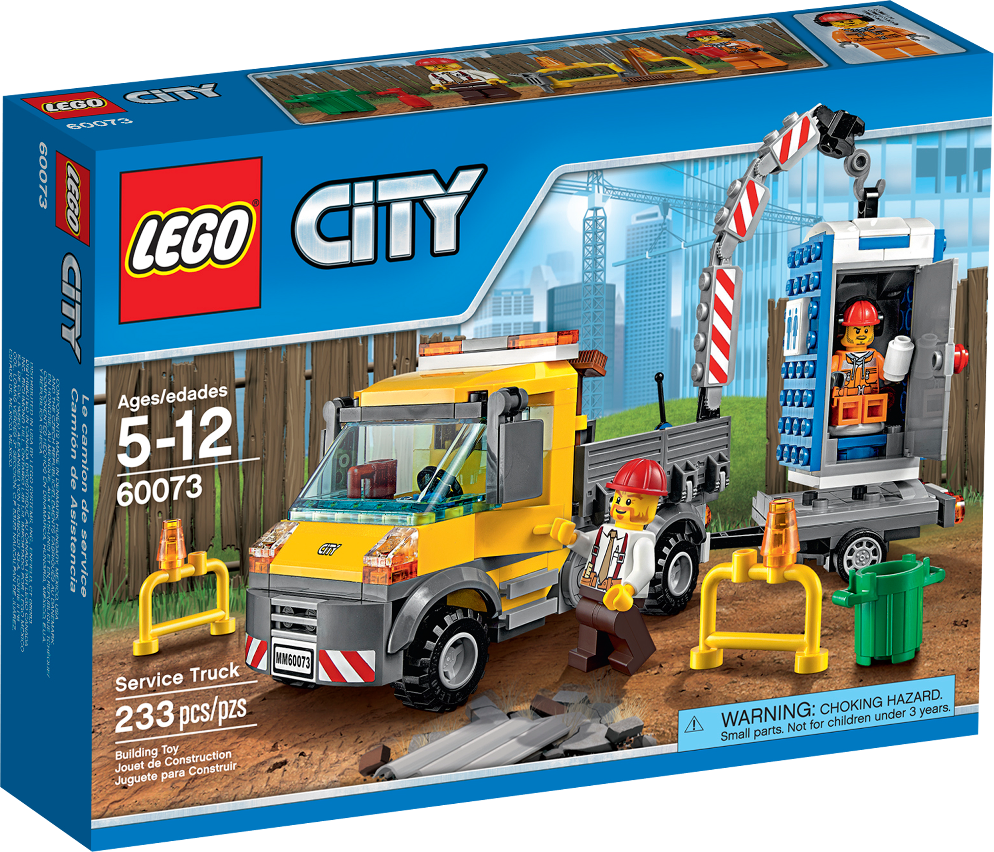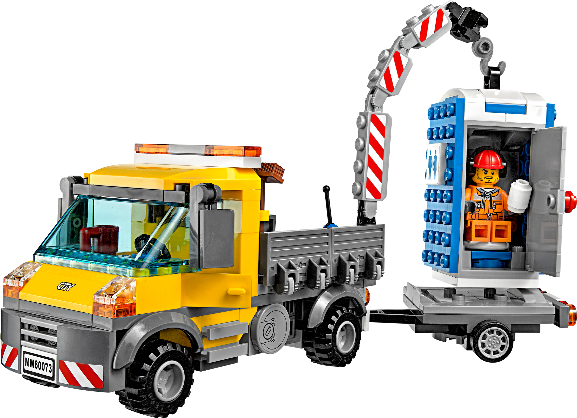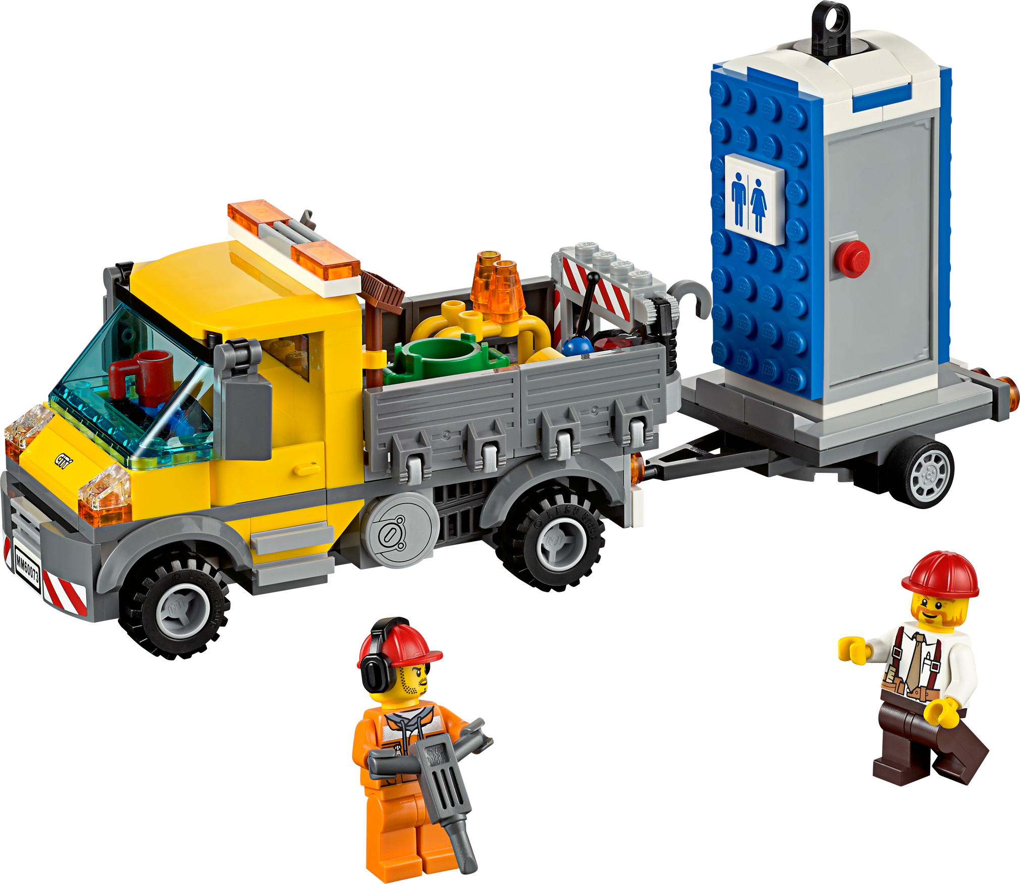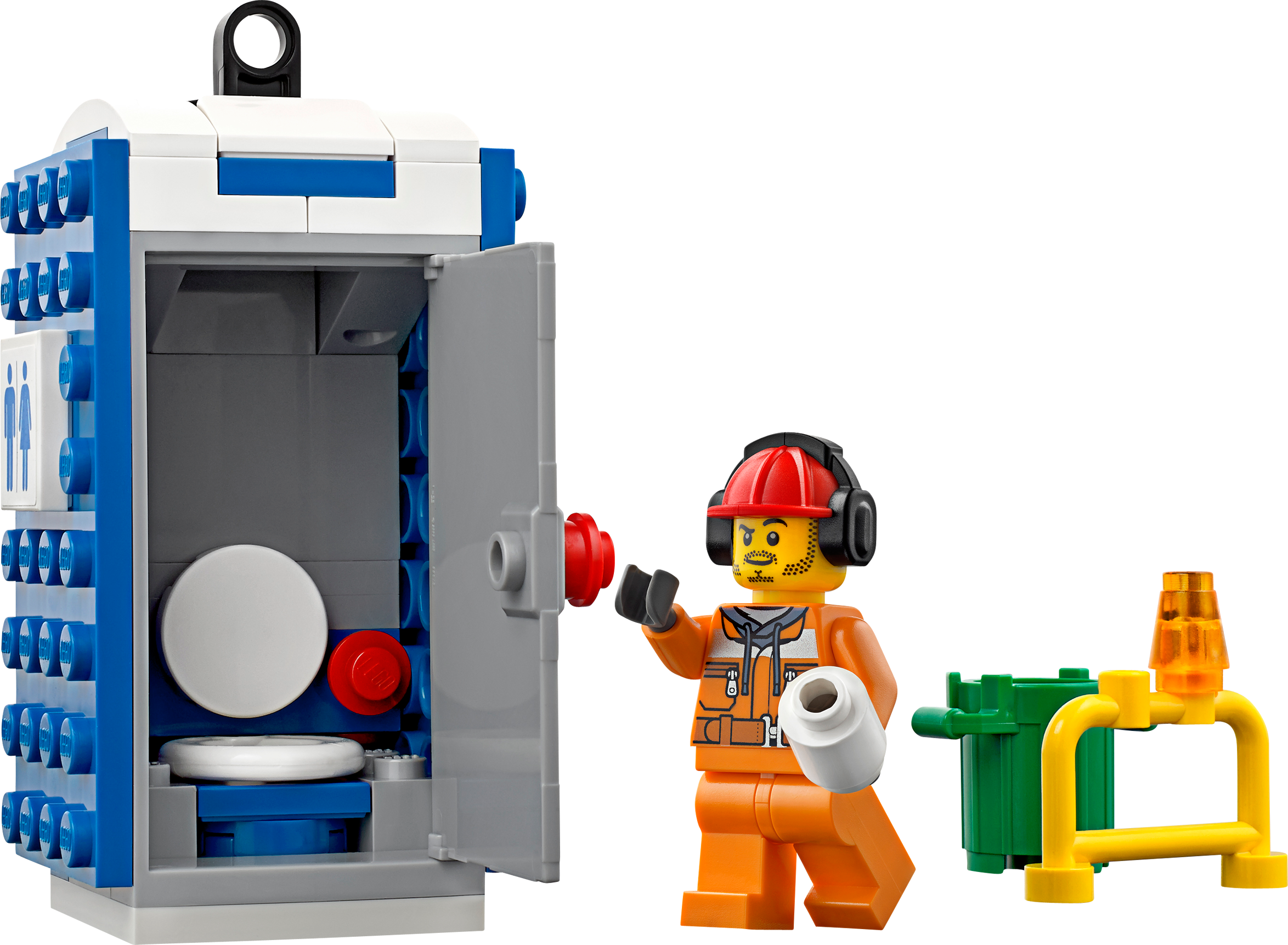 Toilet trouble in LEGO® City! Bubble, bubble, toilet trouble! Work is over at the construction site, and it’s time to move the portable toilet to its next destination. Help the driver lift the portable toilet using the powerful crane located at the rear of the awesome Service Truck, “aargh… hey!” Uh-oh… don’t forget to check if the toilet is engaged before you start! Includes 2 minifigures with assorted accessories: a driver and a worker. Includes 2 minifigures with assorted accessories: a driver and a worker Features a truck with crane, trailer and a portable toilet Accessories include a mug, shovel, jackhammer, broom, bin, fire extinguisher, toilet paper and 2 barriers Operate the powerful crane Lift the portable toilet onto the trailer Truck (with crane raised) measures over 5” (13cm) high, 5” (13cm) long and 2” (7cm) wide Trailer measures over 3” (8cm) long, 2” (6cm) wide and under 1” (2cm) high Portable toilet measures over 3” (8cm) high, 1” (4cm) wide and 1” (3cm) deep