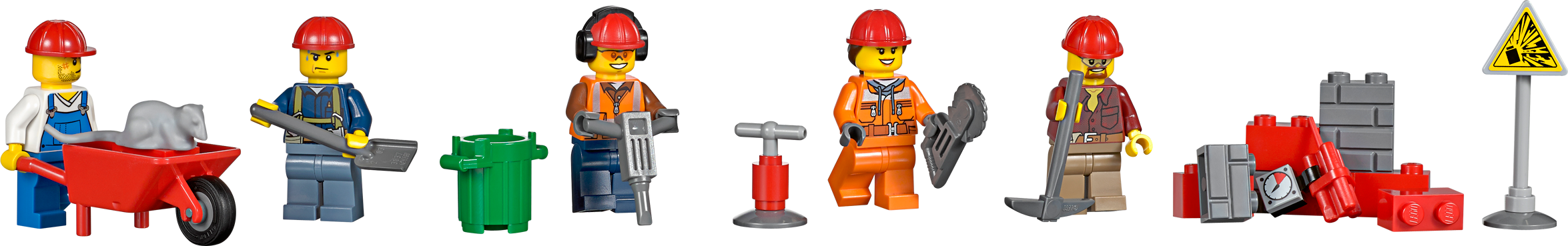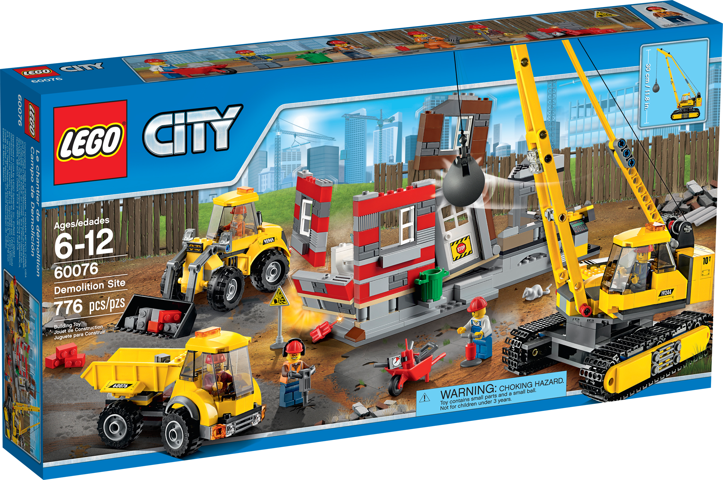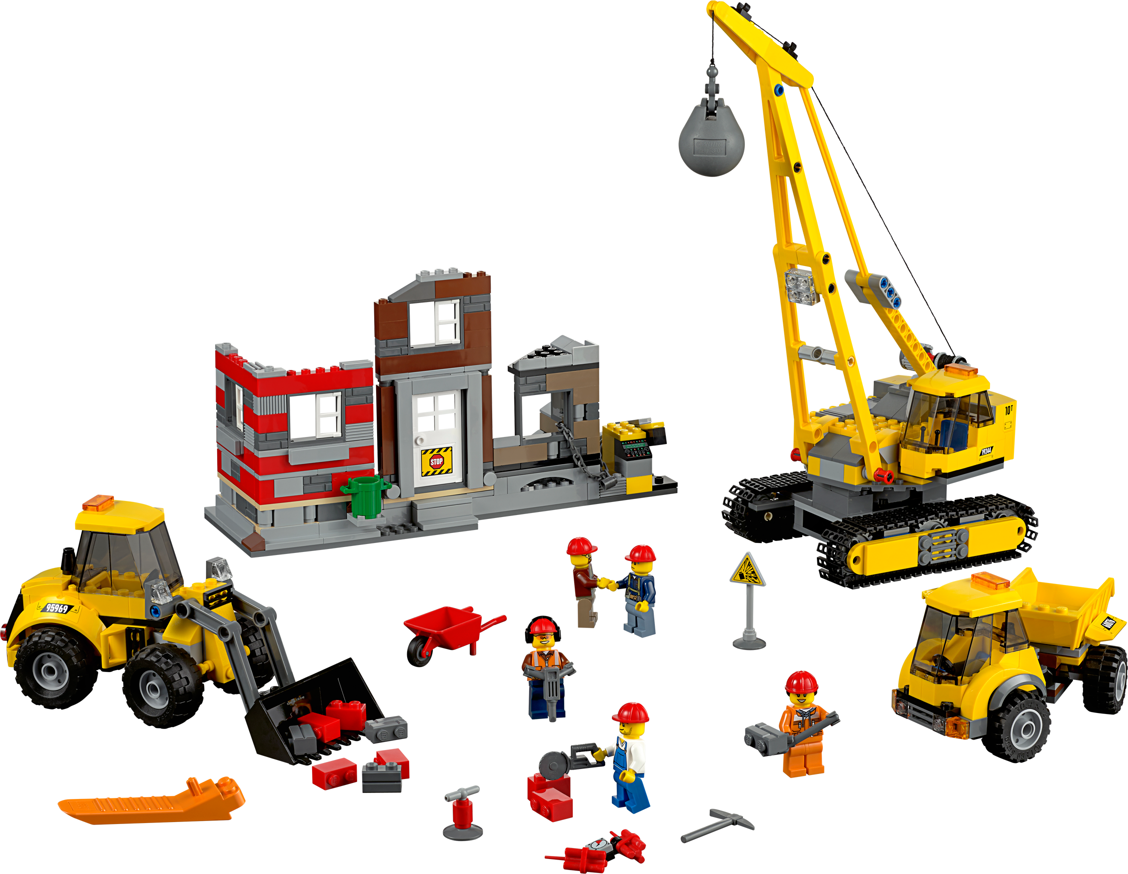 Call in the awesome demolition team! A big job has broken out! The demolition experts are using all of their heavy-duty equipment to demolish a row of derelict houses and they need your help. Jump aboard the giant crane and operate the jib to swing the heavy wrecking ball… smash! Help the demolition expert plant the dynamite and push the detonator handle… pow! Use the powerful front-end loader to pull the demolition chain… crash! When the dust has settled, empty the rubble into the rugged dump truck. Now that’s what you call an awesome demolition team! Includes 5 demolition worker minifigures with assorted accessories. Includes 5 demolition worker minifigures with assorted accessories Features a crane with movable jib and wrecking ball, front-end loader with moving bucket, dump truck with tipping bed and 3 building sections featuring different demolition functions Building section functions: tear down section, knock down section and exploding section Accessories include a jackhammer, pickaxe, saw, shovel, 2 dynamite sticks, sign, wheelbarrow, garbage can, toilet, rat and ear protectors Join the demolition team! Operate the powerful front-end loader Swing the awesome wrecking ball! Crane measures over 11” (29cm) high, 8” (21cm) long and 4” (11cm) wide Front-end loader measures over 3” (9cm) high, 7” (19cm) long and 2” (7cm) wide Dump truck measures over 2” (7cm) high, 5” (13cm) long and 2” (6cm) wide