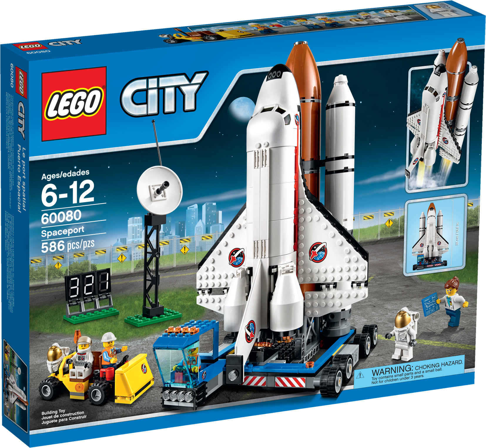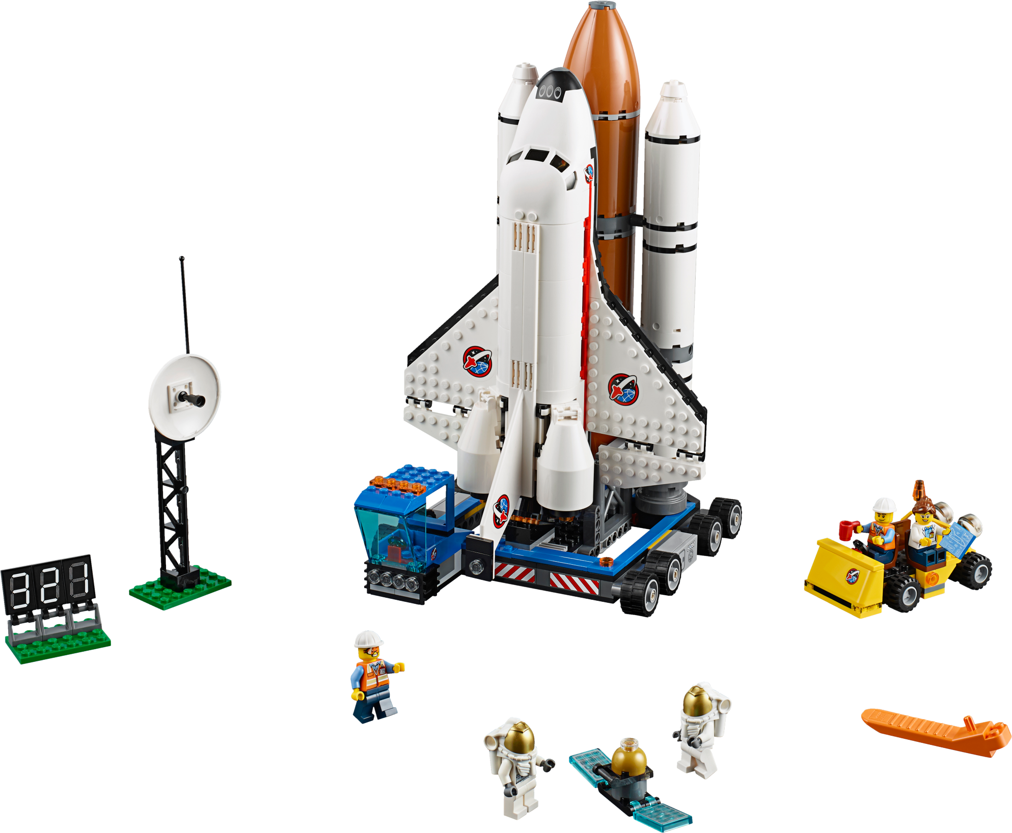 Launch the awesome shuttle from the LEGO® City Spaceport! It’s launch day at the LEGO® City Spaceport. Load the satellite into the space shuttle and use the powerful, mobile launchpad to slowly maneuver it to the launch site. Then deliver the astronauts with the service vehicle and get strapped in as countdown commences, 3… 2… 1… liftoff! Feel the power as the main engines ignite and send the shuttle hurtling into space. Eject the external fuel tank and rocket boosters and then open the cargo bay doors ready to launch the satellite! It’s another successful mission for the LEGO City Spaceport! Includes 5 minifigures with assorted accessories: a scientist, 2 service personnel and 2 astronauts. Includes 5 minifigures with assorted accessories: a scientist, 2 service personnel and 2 astronauts Features a space shuttle, mobile launchpad, satellite, countdown display, antenna and a service vehicle Space shuttle features a detachable external fuel tank, 2 detachable rocket boosters, opening cargo bay doors and a foldout loading arm Mobile launchpad features driver’s cab and a beacon Accessories include 2 helmets, mug and a wrench Operate the mobile launchpad! Transportthe astronauts to the spacecraft! Launch the space shuttle! Eject the external fuel tank and boosters! Open the cargo bay doors Place the satellite into orbit! Space shuttle measures over 4” (12cm) high, 10” (27cm) long, and 7” (19cm) wide External fuel tank measures over 1” (4cm) high, 11” (28cm) long, and 1” (4cm) wide Each rocket booster measures over 10” (26cm) long, and under 1” (2cm) wide and 1” (2cm) high Mobile launchpad measures over 4” (11cm) high, 7” (20cm) long and 6” (17cm) wide Service car measures over 2” (6cm) high, 3” (9cm) long and 1” (5cm) wide