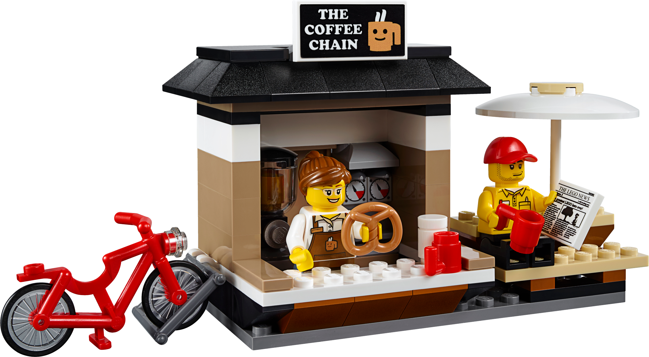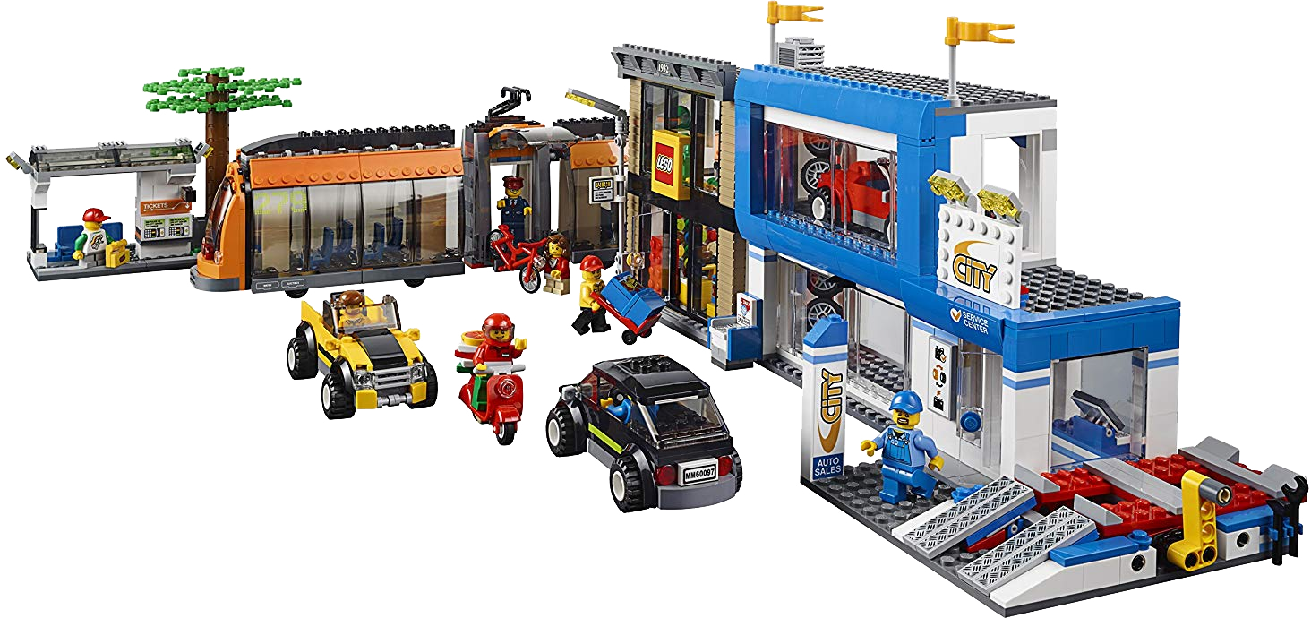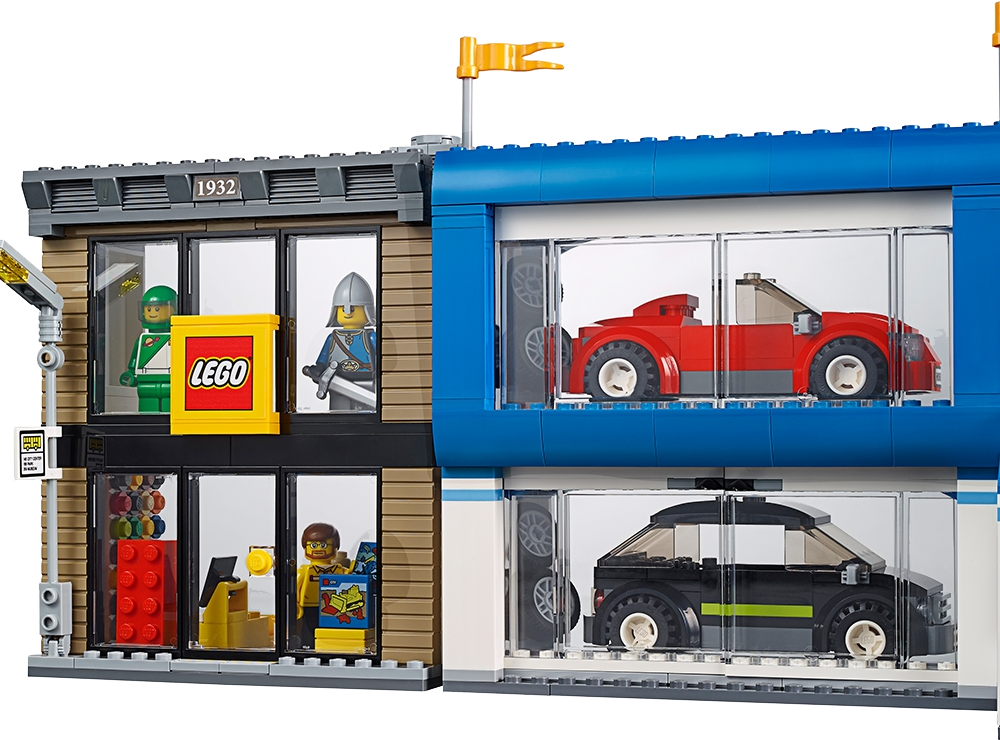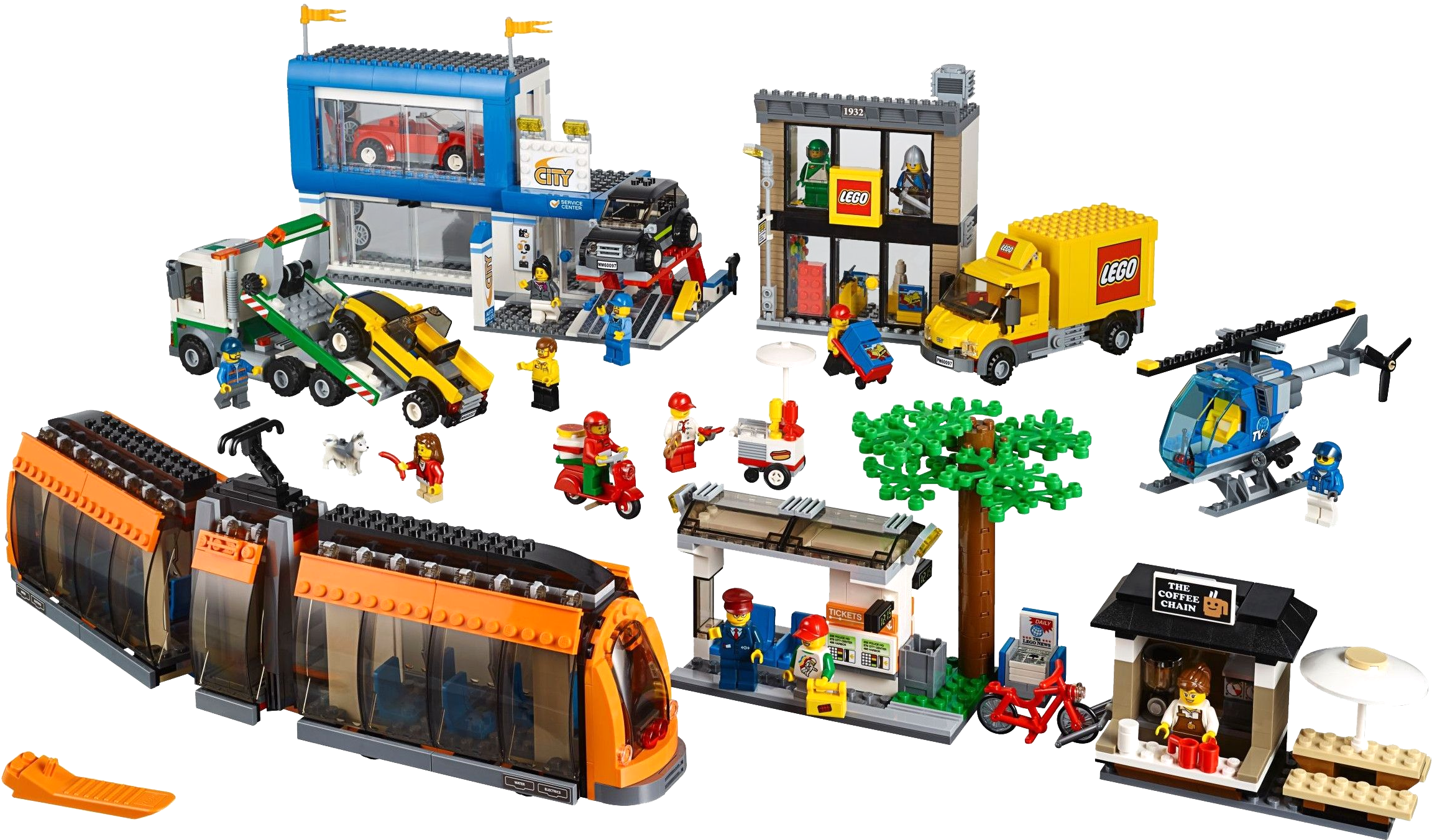 Features a tram, LEGO® Store, LEGO delivery truck, helicopter, car dealership, 3 cars, tow truck, bike, pizza delivery scooter, tram stop, coffee shop, hotdog stand and a newsstand