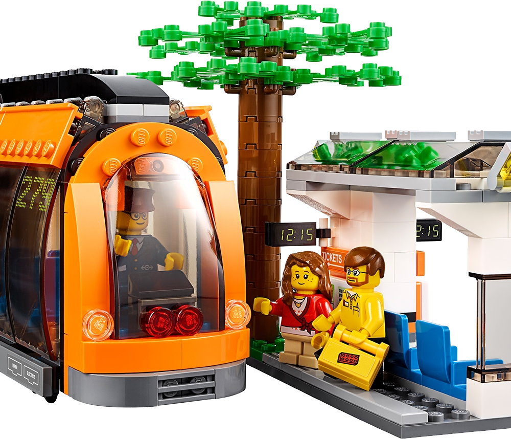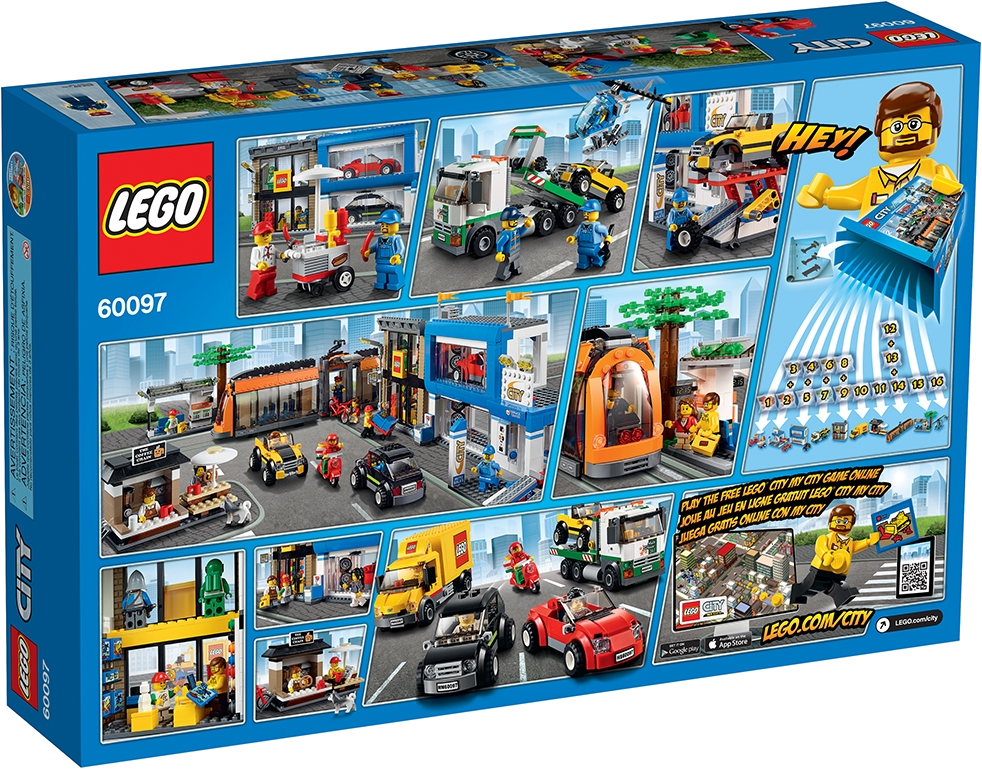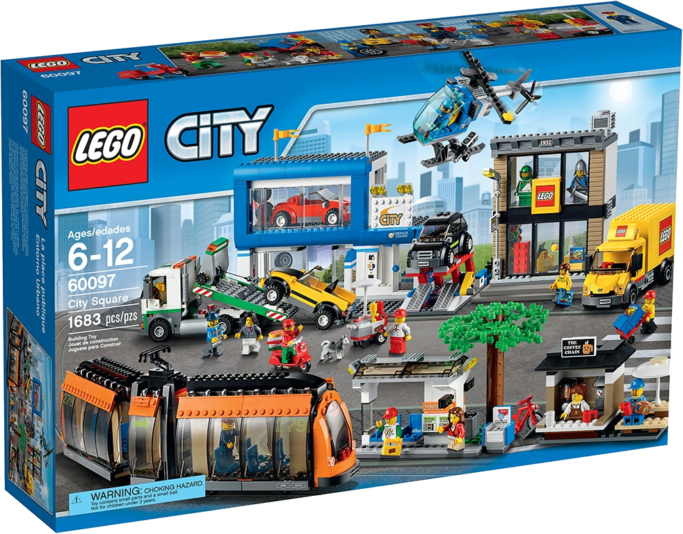 It’s buzzing with activity at the City Square! Park your bike at the cozy coffee bar, hop aboard the awesome news helicopter and take to the skies for a bird’s-eye view. When you’re done flying, call by the LEGO® Store where a new delivery has just arrived. Help the driver unload the boxes, place them on the handcart and wheel them into the store. Then check out the cool cars for sale at the dealership showrooms. Help the mechanic operate the car lift and fit a new set of sporty alloy rims. There’s just time to buy a hotdog and a newspaper for the journey home, but watch out for the pizza deliveryman on his speedy scooter as you head for the tram stop! Load your bike into the bike compartment, take a seat and watch the world go by as you travel through the LEGO City streets. What an exciting day! Includes 12 minifigures with assorted accessories: a tram driver, helicopter pilot, coffee shop saleswoman, pizza deliveryman, car saleswoman, mechanic, tow truck driver, hotdog salesman, LEGOsales person, LEGO delivery driver, a girl and a boy. Also includes 2 LEGO store statues.