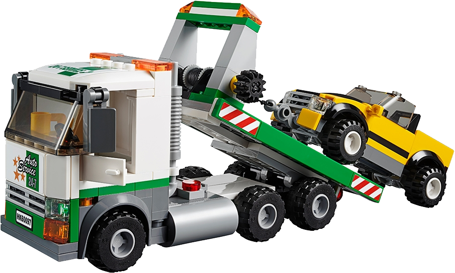 Tow truck features a tilting flatbed and a working winch with hook