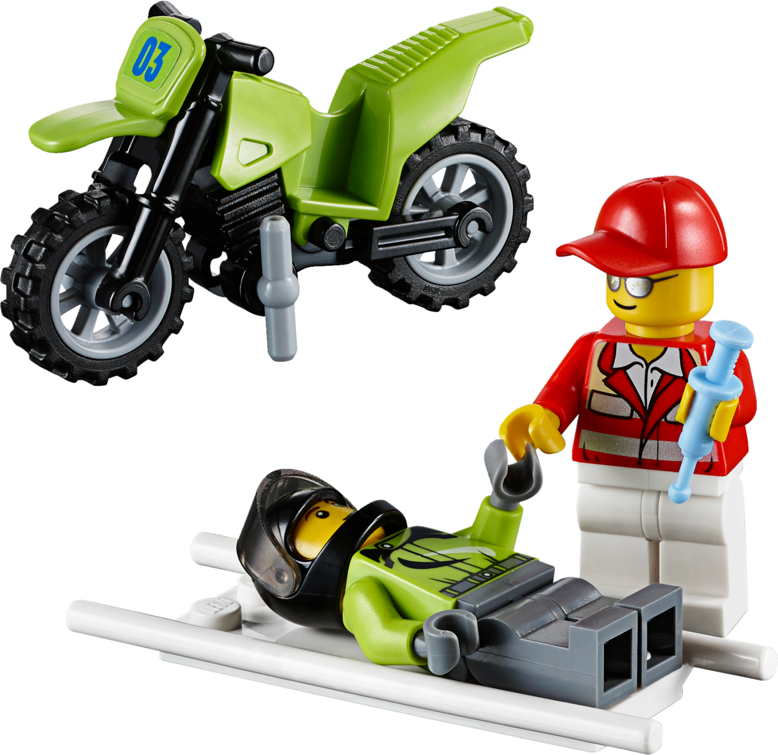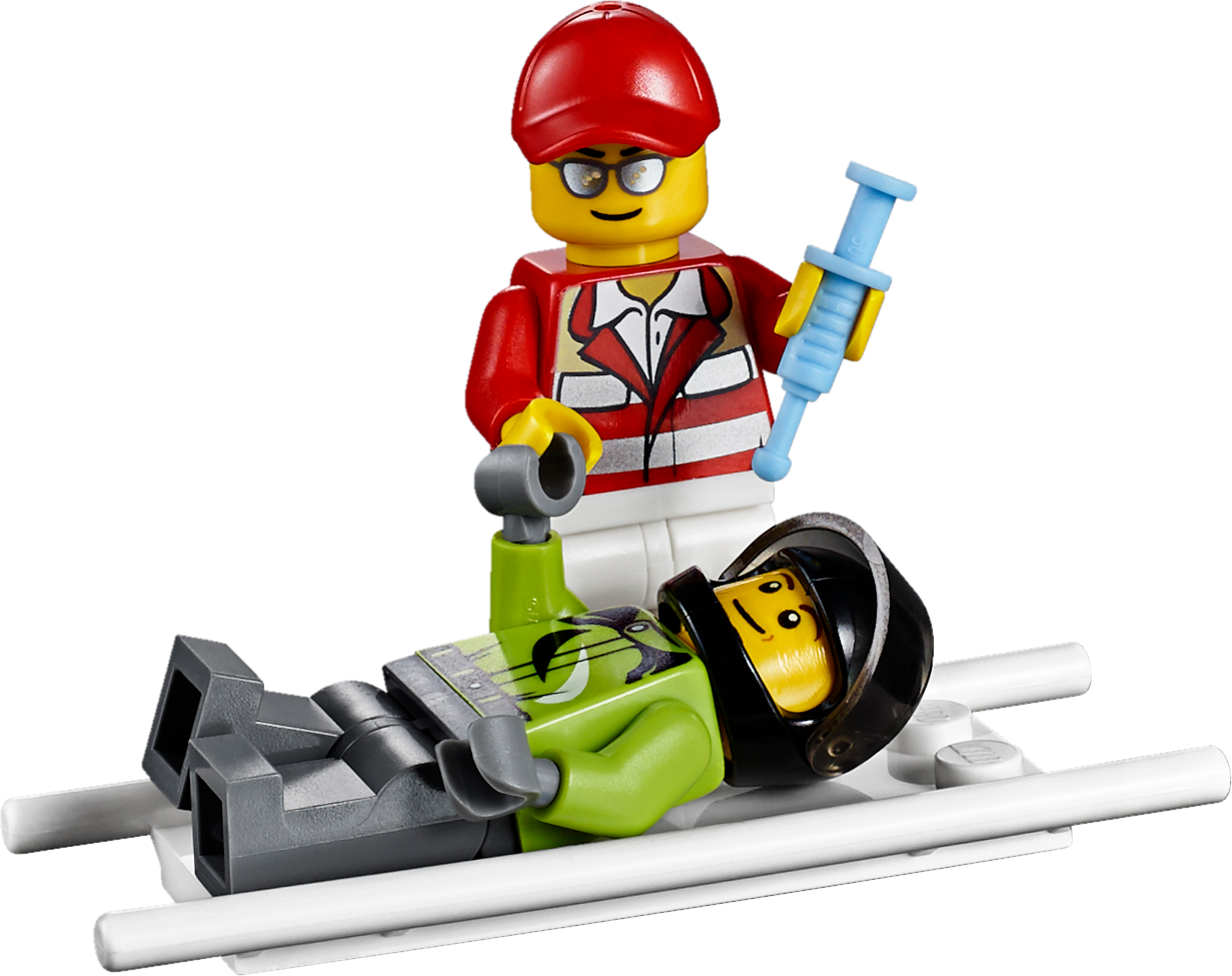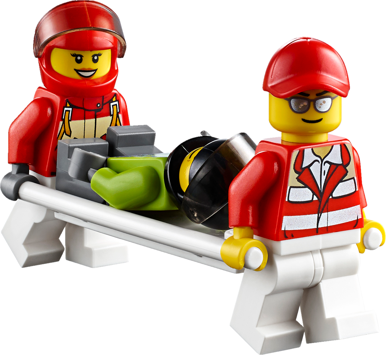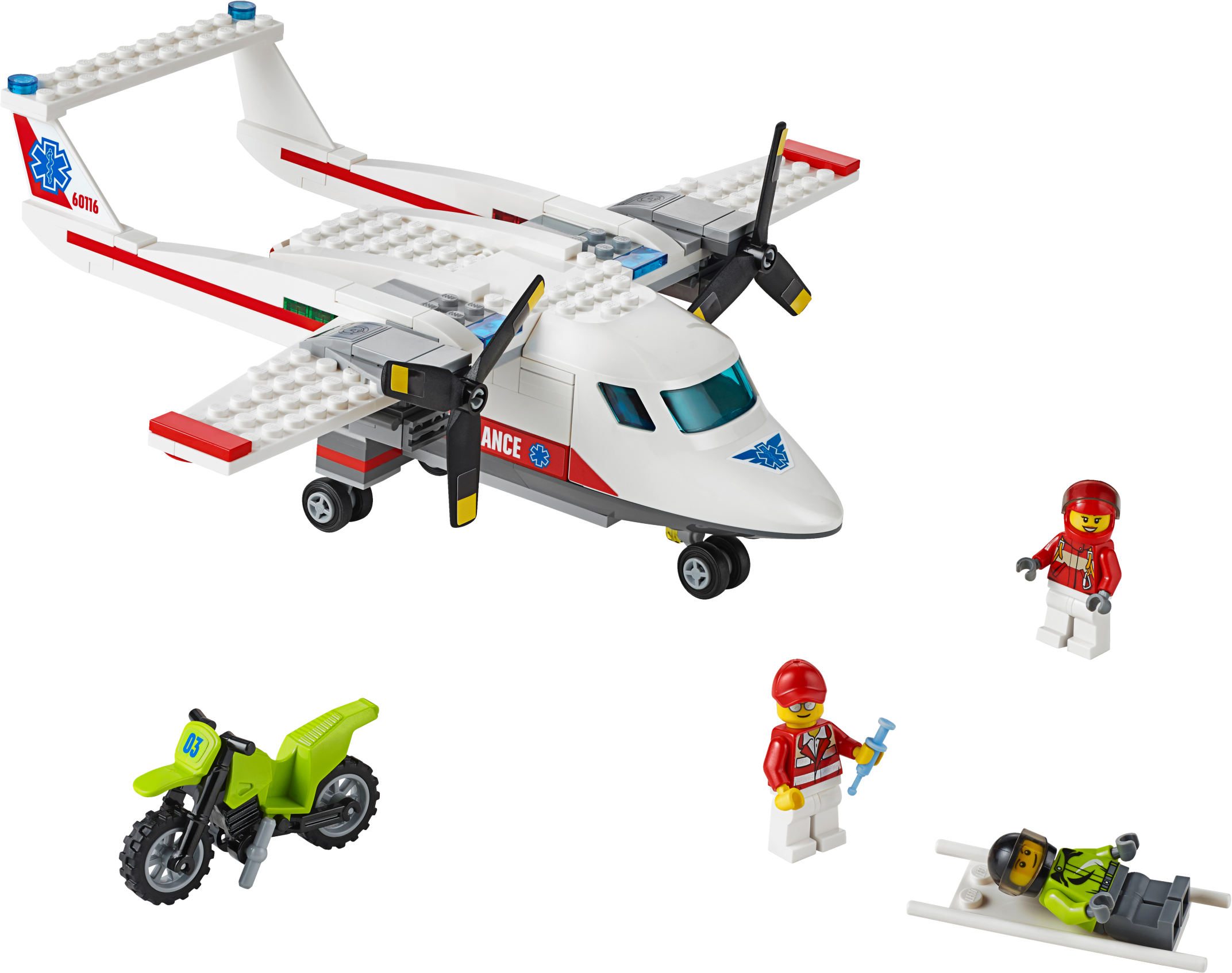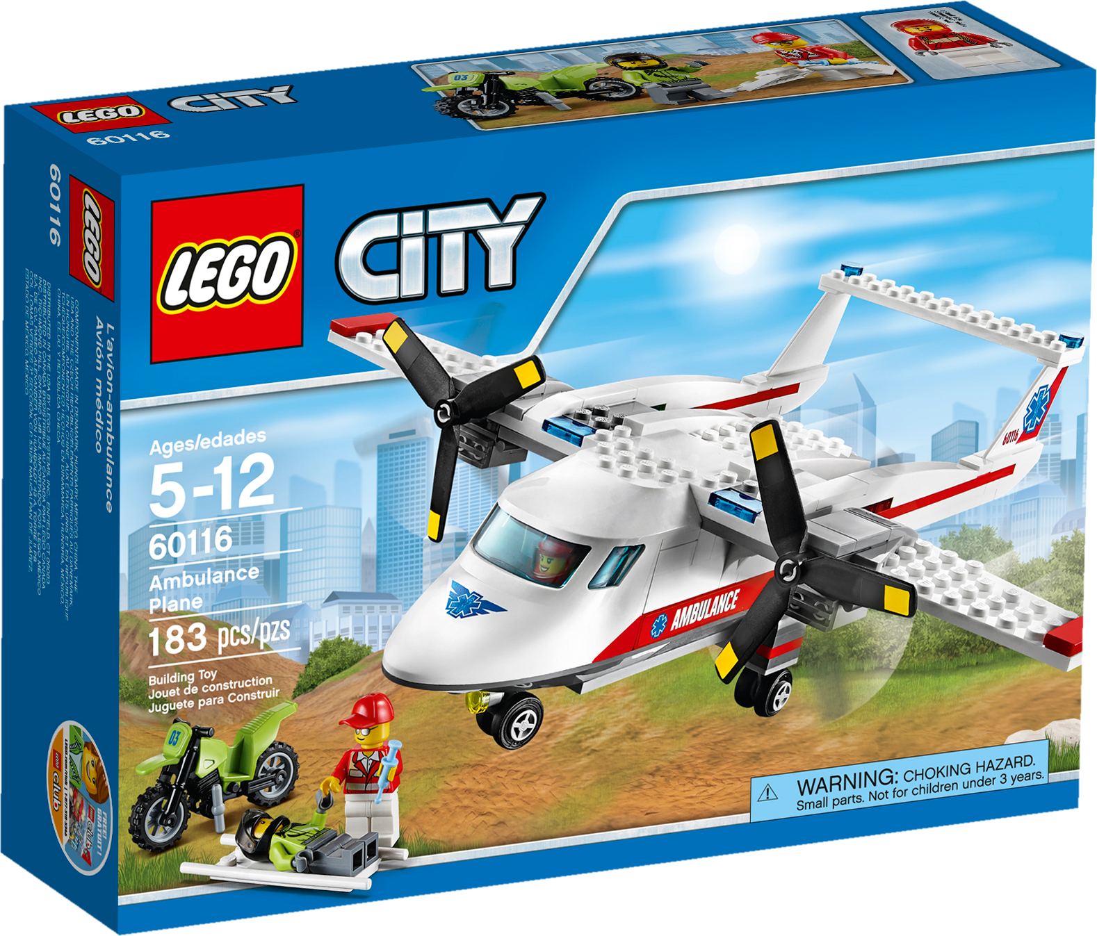 Fly in and transport the motorcyclist to the hospital! Cheer on the motorcyclist as he rides past! If he falls during the ride, help the doctor tend to the injured motorcyclist. Then put him on the stretcher, load him into the Ambulance Plane and fly him to safety! Includes 3 minifigures: a pilot, doctor and a motorcyclist. Ambulance Plane features rotating propellers and a back hatch that opens to load the stretcher. Open the hatch, spin the rotors and fly the rider off for treatment. Accessory elements include a stretcher and a syringe. Ambulance Plane measures over 4” (11cm) high, 8” (22cm) long and 10” (27cm) wide. Motorbike measures over 1” (4cm) high, 2” (6cm) long and under 1” (2cm) wide.
