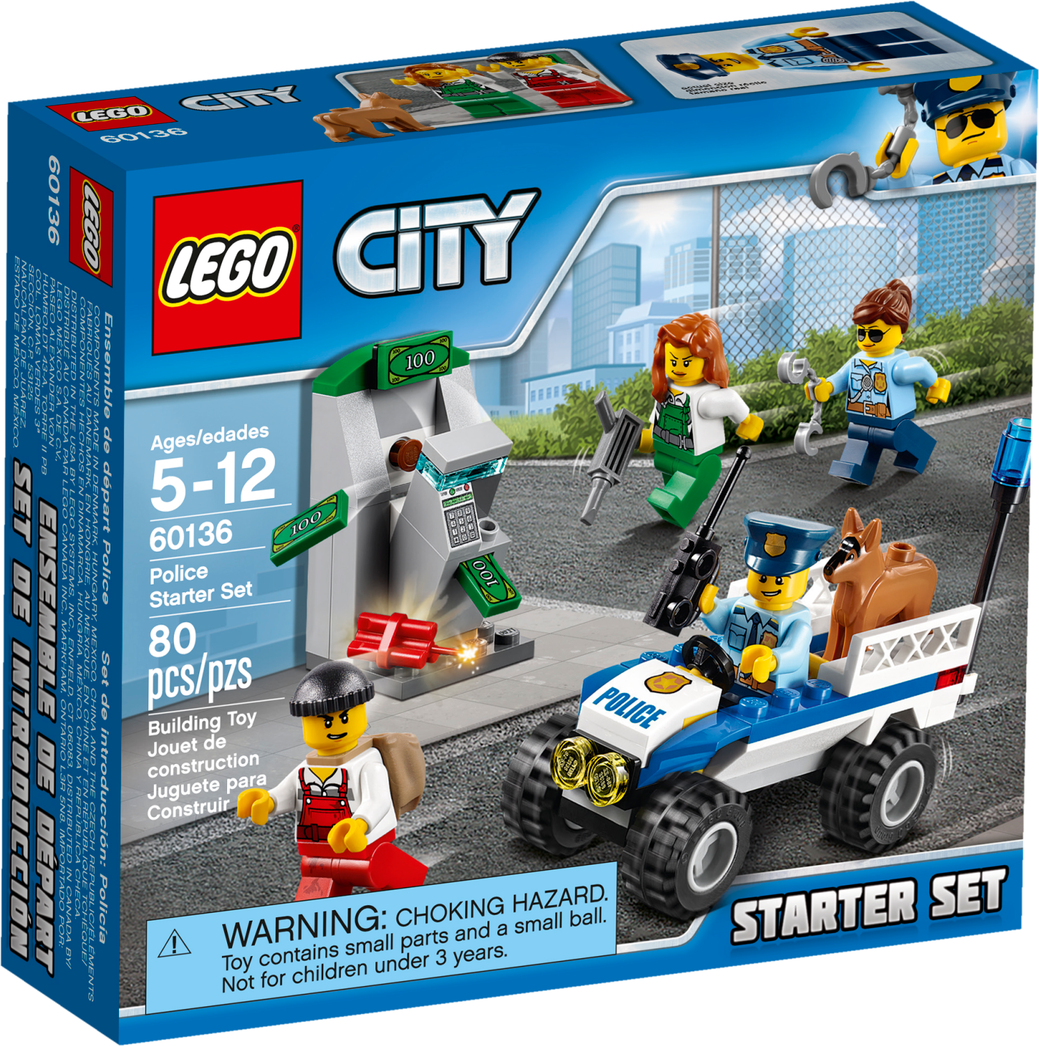 Be part of the action with the LEGO® City police as they stop the crooks from getting away with the money from the ATM, featuring a police ATV that includes a radio and a set of handcuffs, plus an ATM with breakout function and opening door on the back, money bills, dynamite and a jackhammer. Includes four minifigures plus a police dog figure. Includes four minifigures: two police officers and two crooks, plus a police dog figure. Features a police ATV with room for the dog figure in the back. Also includes a wall section with ATM breakout function, opening door on the back and space to hold money bills. Break out the ATM with the dynamite and crack it open with the jackhammer. Use the police radio to call for help from the police officer and his dog. Accessory elements include two money bills, a walkie-talkie, handcuffs, dynamite, backpack and a jackhammer. This set offers an age-appropriate build and play experience for ages 5-12. ATM measures over 1” (5cm) high, 1” (3cm) wide and 1” (3cm) deep. ATV measures over 2” (7cm) high, 3” (8cm) long and 1” (4cm) wide.