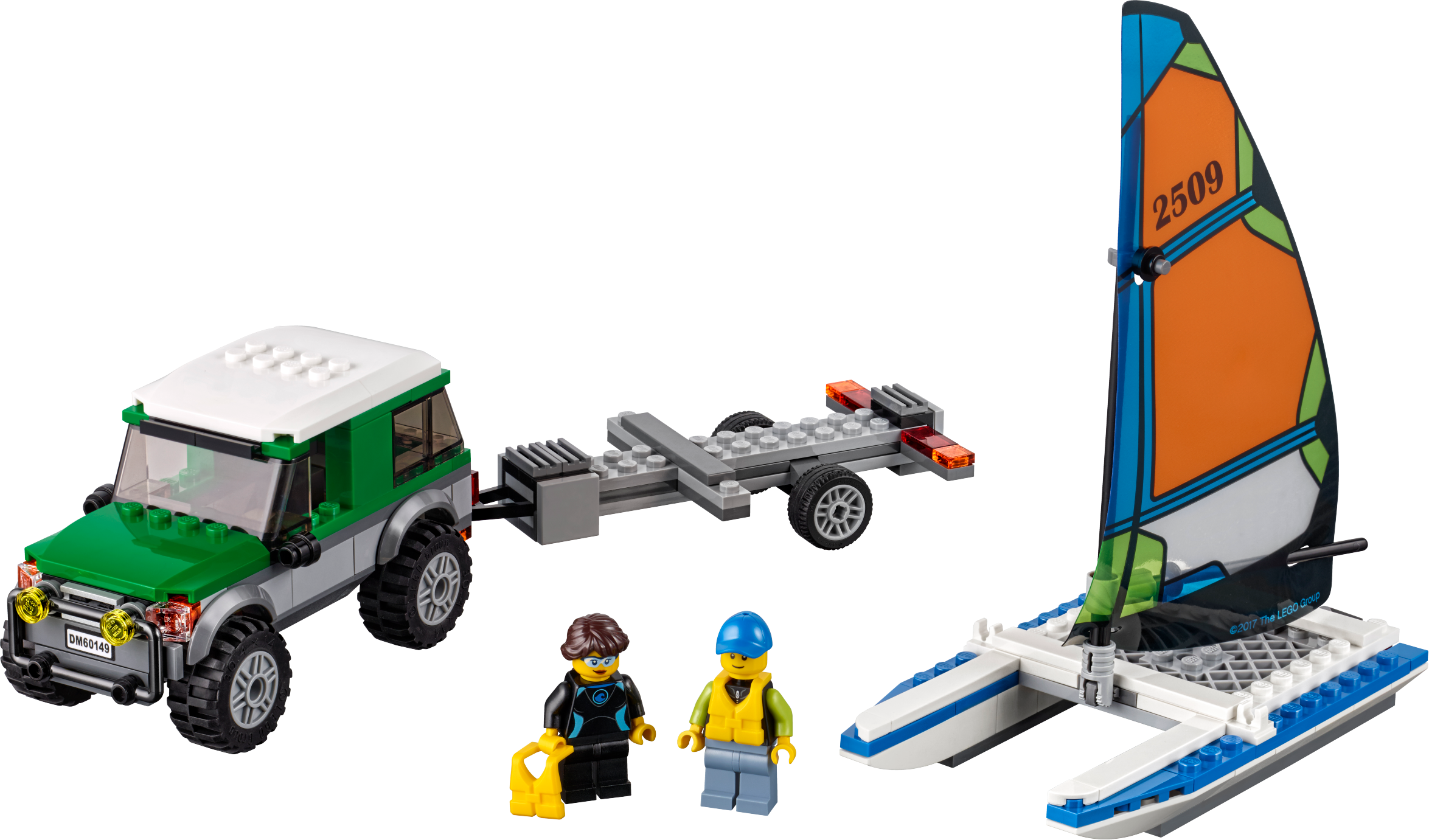 Includes two minifigures: a catamaran pilot and a 4x4 driver.