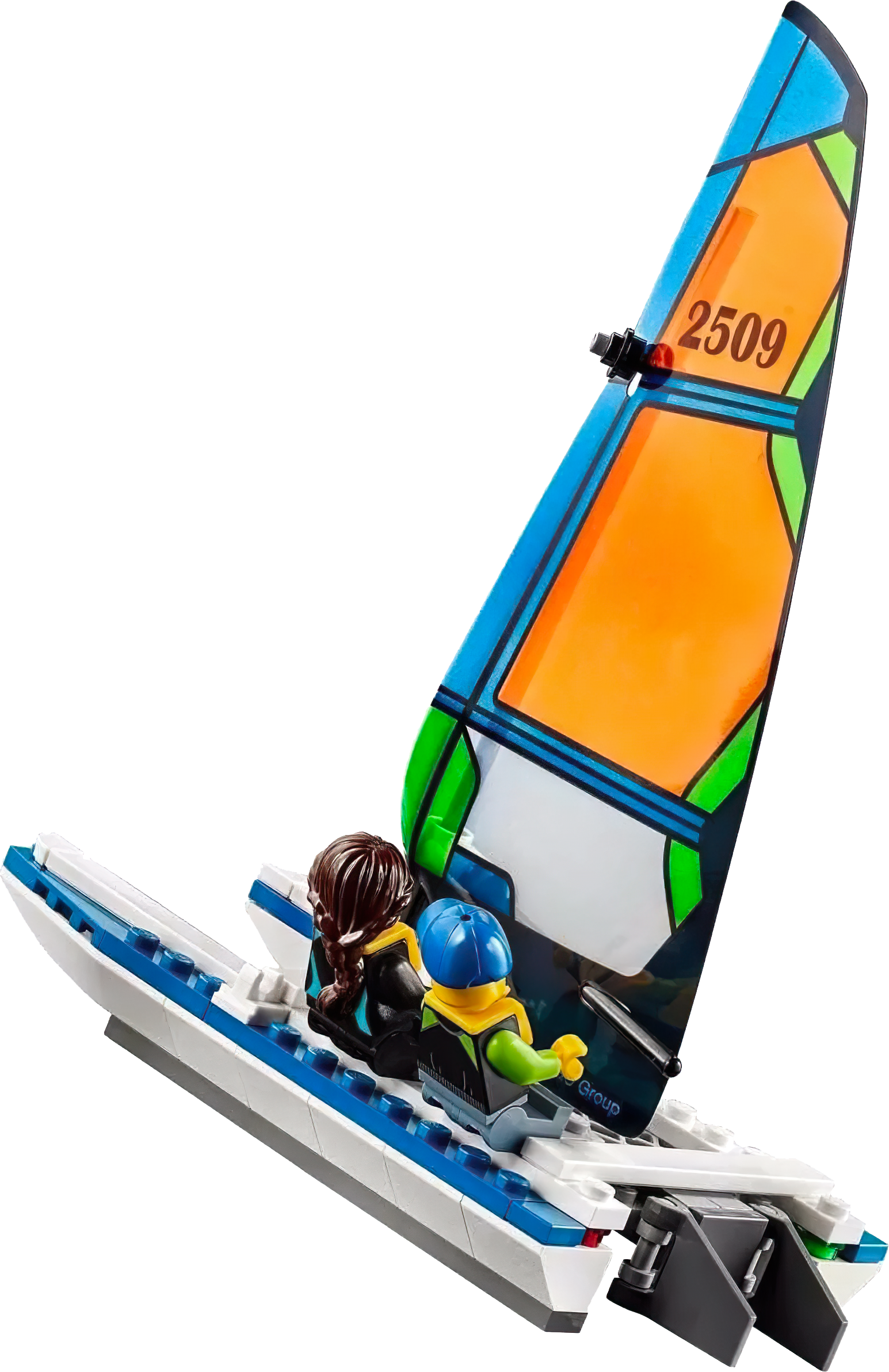 Get ready for an adventure on the water with the catamaran boat, featuring dual rudders and a folding sail, and a 4x4 truck with trailer hitch and a detachable trailer. Includes two minifigures.