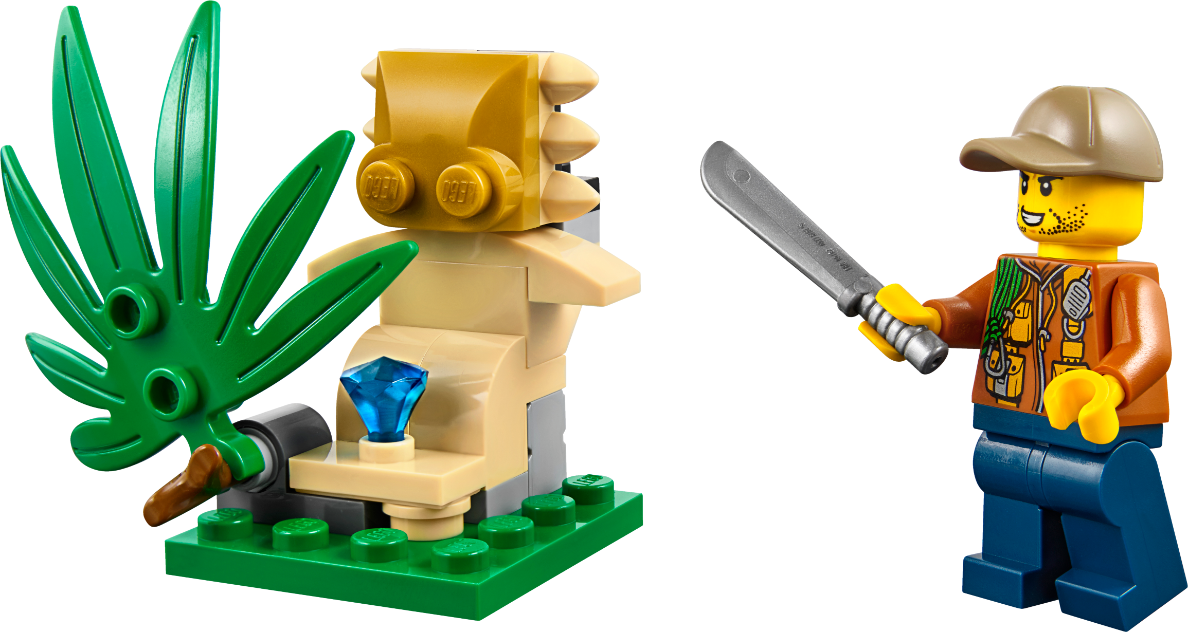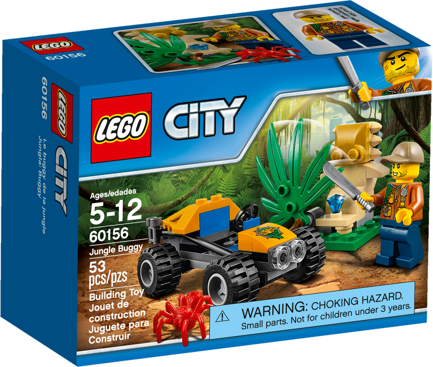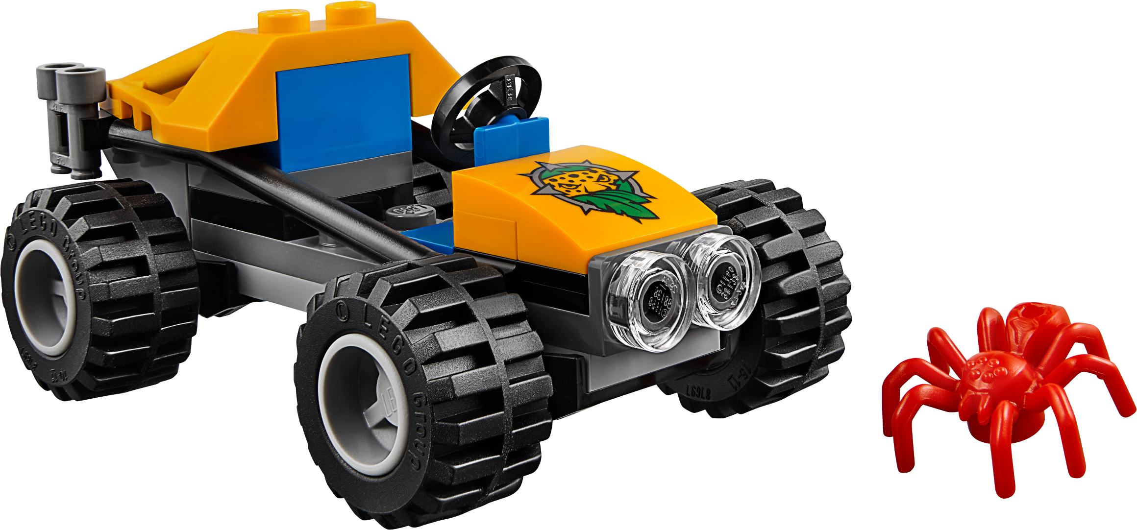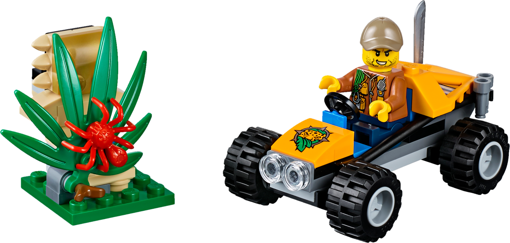 Go exploring in the wilds of the LEGO® City jungle with the Jungle Buggy featuring a minifigure cockpit and space in the back for machete and binoculars elements, plus a buildable statue with hidden diamond element, moving leaf and a red spider figure. Includes a minifigure.Includes an explorer minifigure and a spider figure.Features a buggy with a minifigure cockpit.Also includes a statue with a moving leaf and hidden diamond element.Rotate the leaf to reveal the hidden diamond.Accessory elements include a machete and pair of binoculars.Buggy measures over 1” (3cm) high, 3” (8cm) long and 1” (4cm) wide.Statue measures over 1” (4cm) high, 1” (5cm) wide and 1” (3cm) deep.