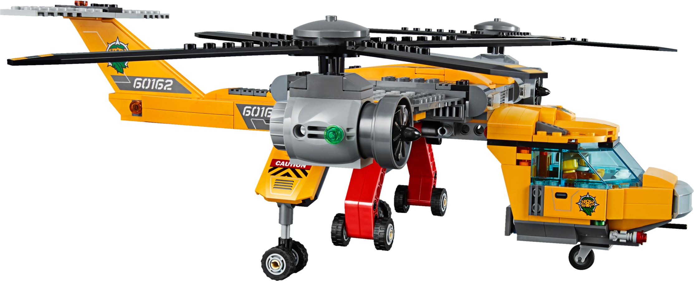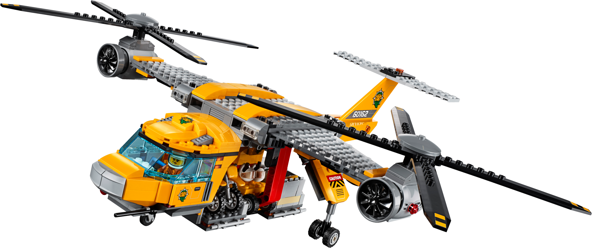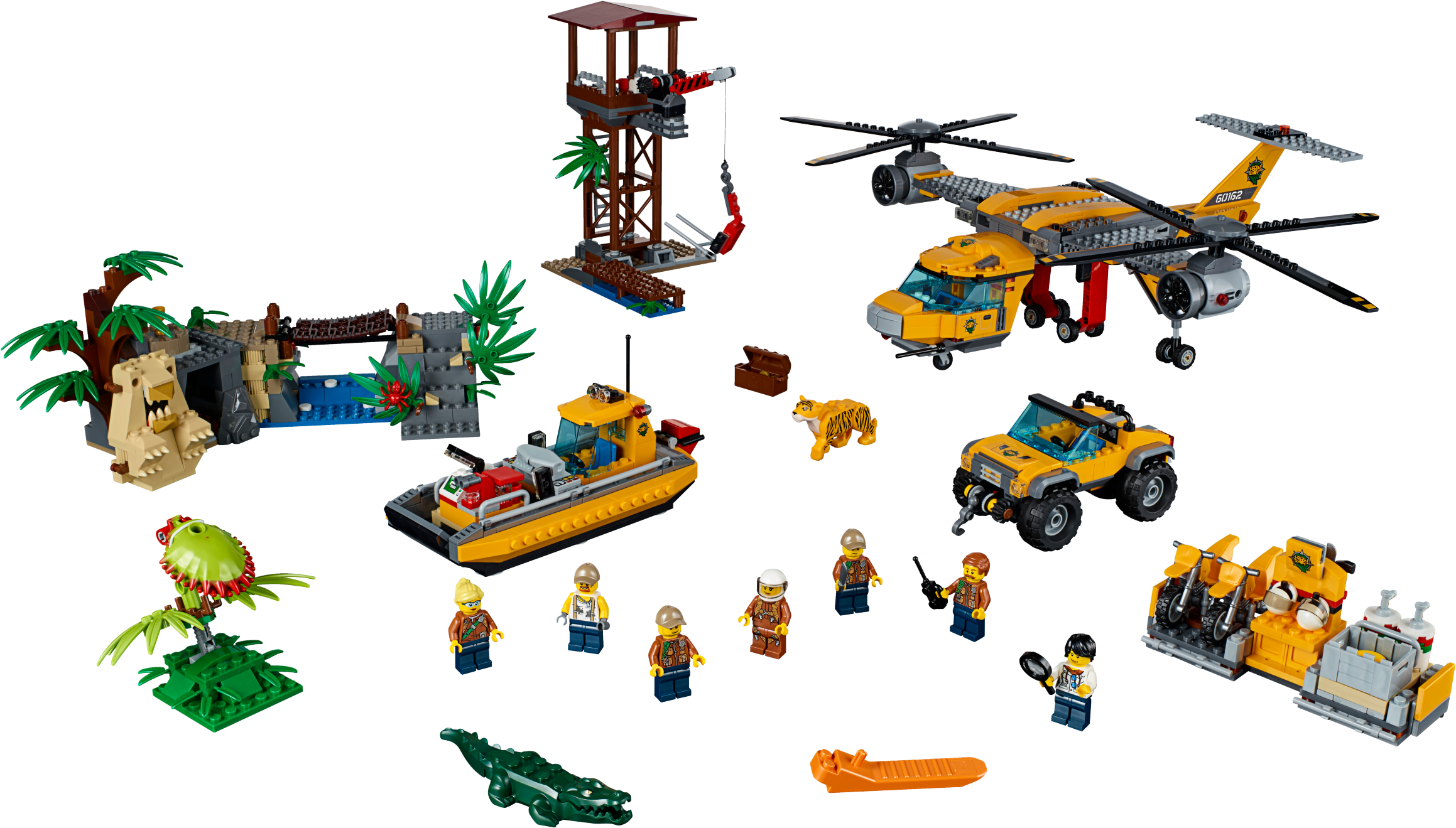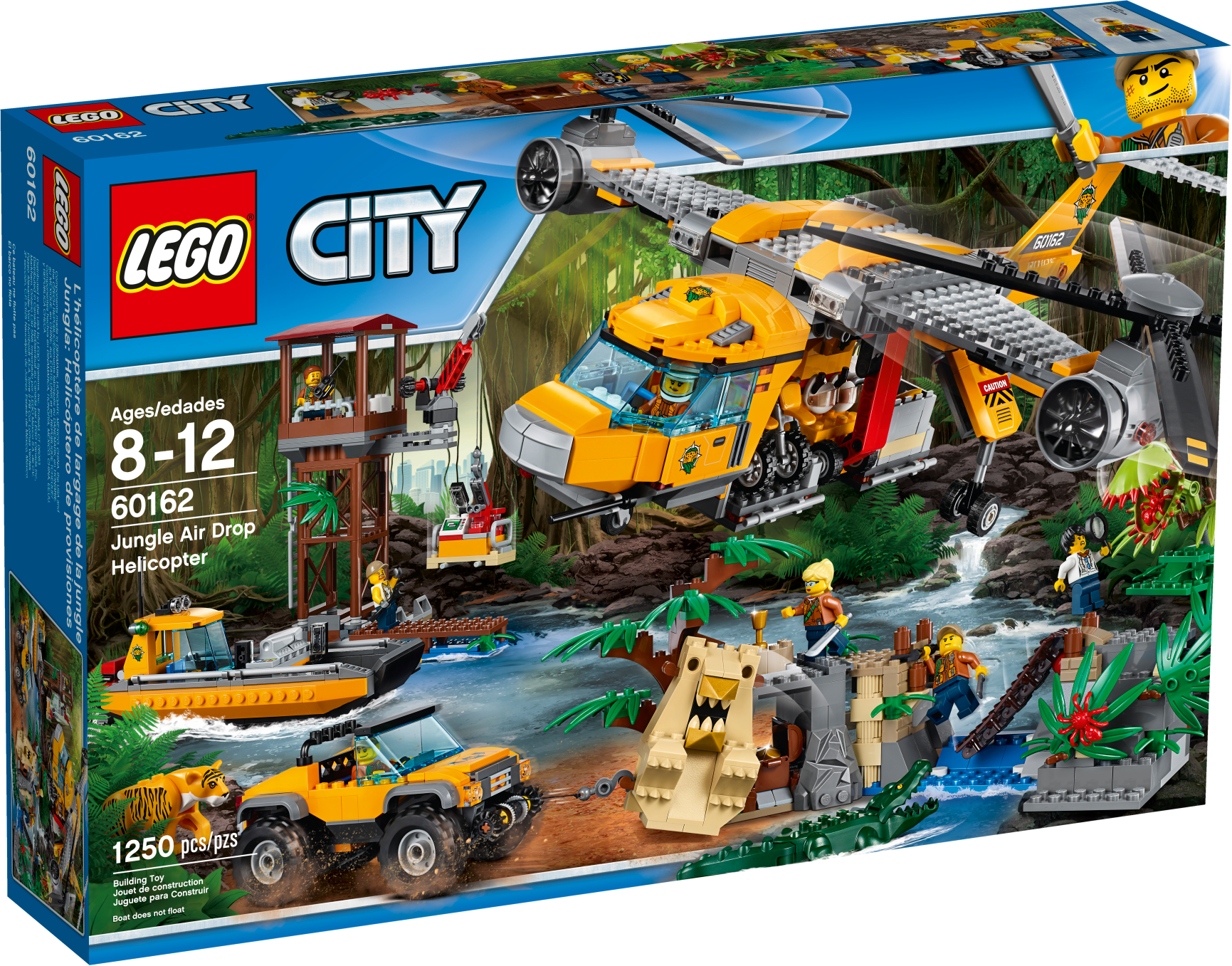 Keep your camp well-supplied in the LEGO® City jungle with the Jungle Air Drop Helicopter, featuring 2 spinning rotors, a clamp system to carry the pallet platform or truck, work tower with rotating crane, riverboat that holds 2 pallets or motorbikes, a temple, collapsible bridge, movable statue, buildable Venus flytrap and a 4x4 truck with winch. Includes 7 minifigures, plus tiger, crocodile and 2 spider figures.Includes 7 minifigures: riverboat captain, helicopter pilot, 3 explorers and 2 base camp workers, plus tiger, crocodile and 2 spider figures.Features a side-by-side rotor helicopter, work tower, pallet transporter, 2 motorbikes, riverboat, buildable Venus flytrap, and a temple and bridge build.Helicopter features a switch-activated clamp system to carry the included pallet platform or 4x4 truck with winch.Work tower features a rotating and elevating crane arm.Pallet transporter holds 3 pallets and/or 2 motorbikesRiverboat features a minifigure cockpit and space for 2 pallets and/or motorbikes.Venus flytrap build features a closing ‘mouth’ and space for a spider.Temple and bridge build features a moving statue that reveals a hiding space and lever-activated collapsing bridge.Push the switch on the helicopter’s tail to activate the clamp system and lift the pallet transporter or 4x4 truck.Rotate the crane arm on the work tower to move the pallet transporter or pallets to and from the riverboat.Hook the 4x4 truck’s winch to the statue to set it upright and find what’s hidden behind it.Slide the lever out on the temple and bridge section to collapse the bridge and send the explorer tumbling into the water.Push the top of the Venus flytrap down to trap the spider inside.Accessory elements include 3 pallets, mobile lab, fuel box, 2 fuel cans, treasure chest, gold-colored chalice, box, machete, working magnifying glass, camera and other tools.Side-by-side rotor helicopter including rotors measures over 5” (14cm) high, 15” (38cm) long and 22” (56cm) wide.Riverboat measures over 2” (6cm) high, 7” (20cm) long and 3” (8cm) wide.4x4 truck measures over 2” (7cm) high, 4” (12cm) long and 2” (7cm) wide.Work tower measures over 7” (20cm) high, 5” (15cm) wide and 5” (13cm) deep.Temple and bridge build measures over 4” (11cm) high, 12” (31cm) wide and 5” (14cm) deep.Pallet transporter measures over 2” (7cm) high, 2” (6cm) wide and 5” (14cm) deep.Each pallet measures over 1” (4cm) high, 1” (5cm) wide and 1” (3cm) deep.Venus flytrap build measures over 3” (8cm) high, 2” (6cm) wide and 3” (9cm) deep.Crocodile figure measures over4” (11cm) long.Tiger figure measures over 3” (8cm) long.