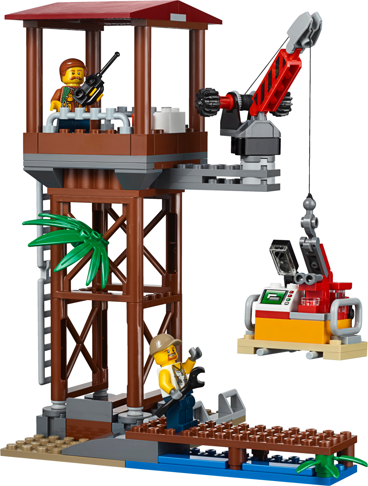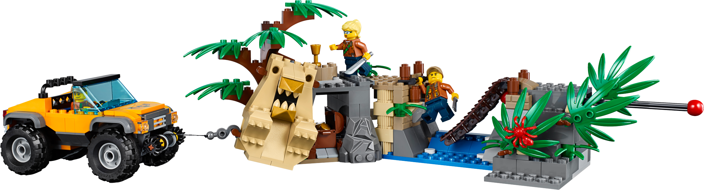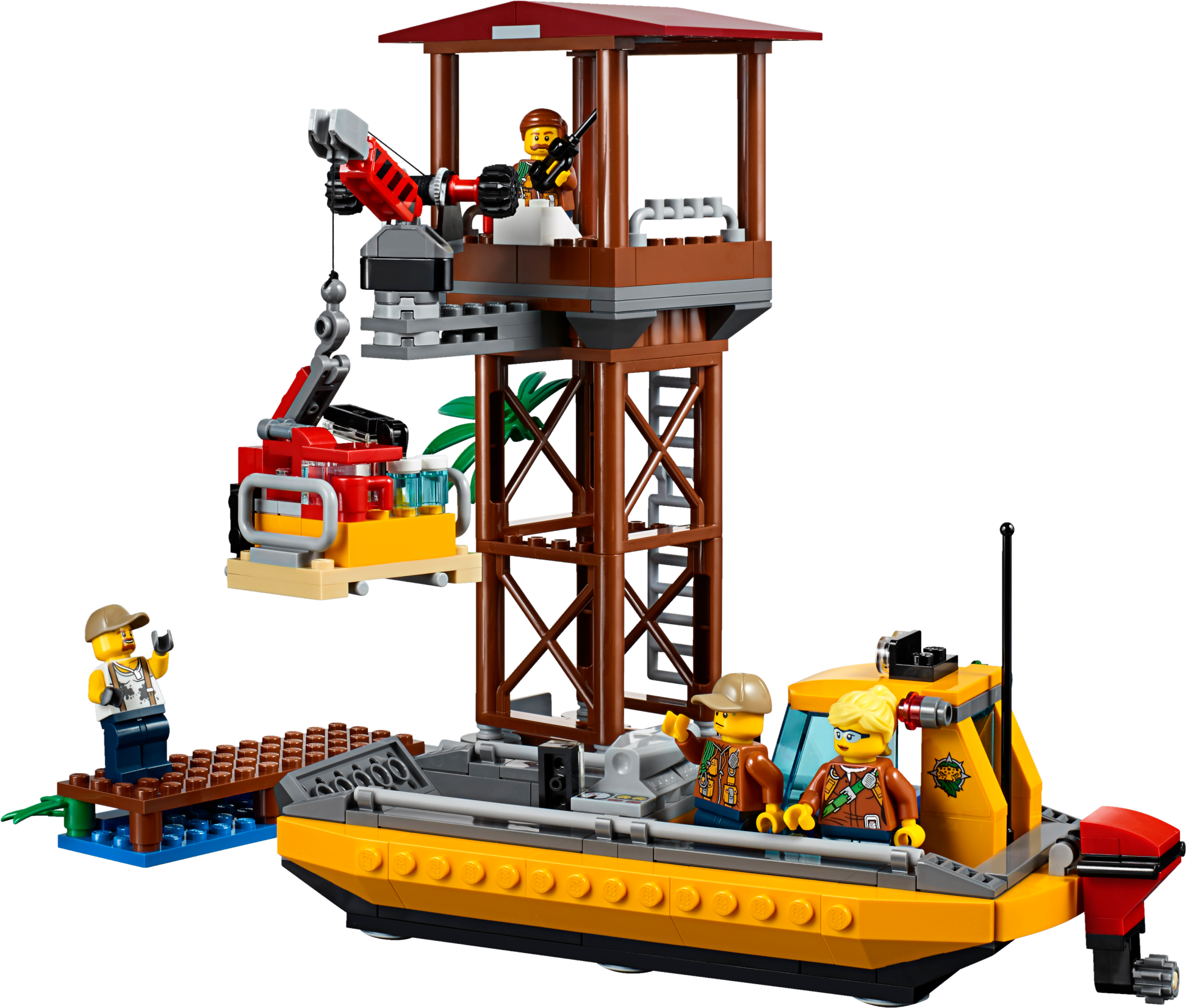 Keep your camp well-supplied in the LEGO® City jungle with the Jungle Air Drop Helicopter, featuring 2 spinning rotors, a clamp system to carry the pallet platform or truck, work tower with rotating crane, riverboat that holds 2 pallets or motorbikes, a temple, collapsible bridge, movable statue, buildable Venus flytrap and a 4x4 truck with winch. Includes 7 minifigures, plus tiger, crocodile and 2 spider figures.Includes 7 minifigures: riverboat captain, helicopter pilot, 3 explorers and 2 base camp workers, plus tiger, crocodile and 2 spider figures.Features a side-by-side rotor helicopter, work tower, pallet transporter, 2 motorbikes, riverboat, buildable Venus flytrap, and a temple and bridge build.Helicopter features a switch-activated clamp system to carry the included pallet platform or 4x4 truck with winch.Work tower features a rotating and elevating crane arm.Pallet transporter holds 3 pallets and/or 2 motorbikesRiverboat features a minifigure cockpit and space for 2 pallets and/or motorbikes.Venus flytrap build features a closing ‘mouth’ and space for a spider.Temple and bridge build features a moving statue that reveals a hiding space and lever-activated collapsing bridge.Push the switch on the helicopter’s tail to activate the clamp system and lift the pallet transporter or 4x4 truck.Rotate the crane arm on the work tower to move the pallet transporter or pallets to and from the riverboat.Hook the 4x4 truck’s winch to the statue to set it upright and find what’s hidden behind it.Slide the lever out on the temple and bridge section to collapse the bridge and send the explorer tumbling into the water.Push the top of the Venus flytrap down to trap the spider inside.Accessory elements include 3 pallets, mobile lab, fuel box, 2 fuel cans, treasure chest, gold-colored chalice, box, machete, working magnifying glass, camera and other tools.Side-by-side rotor helicopter including rotors measures over 5” (14cm) high, 15” (38cm) long and 22” (56cm) wide.Riverboat measures over 2” (6cm) high, 7” (20cm) long and 3” (8cm) wide.4x4 truck measures over 2” (7cm) high, 4” (12cm) long and 2” (7cm) wide.Work tower measures over 7” (20cm) high, 5” (15cm) wide and 5” (13cm) deep.Temple and bridge build measures over 4” (11cm) high, 12” (31cm) wide and 5” (14cm) deep.Pallet transporter measures over 2” (7cm) high, 2” (6cm) wide and 5” (14cm) deep.Each pallet measures over 1” (4cm) high, 1” (5cm) wide and 1” (3cm) deep.Venus flytrap build measures over 3” (8cm) high, 2” (6cm) wide and 3” (9cm) deep.Crocodile figure measures over4” (11cm) long.Tiger figure measures over 3” (8cm) long.