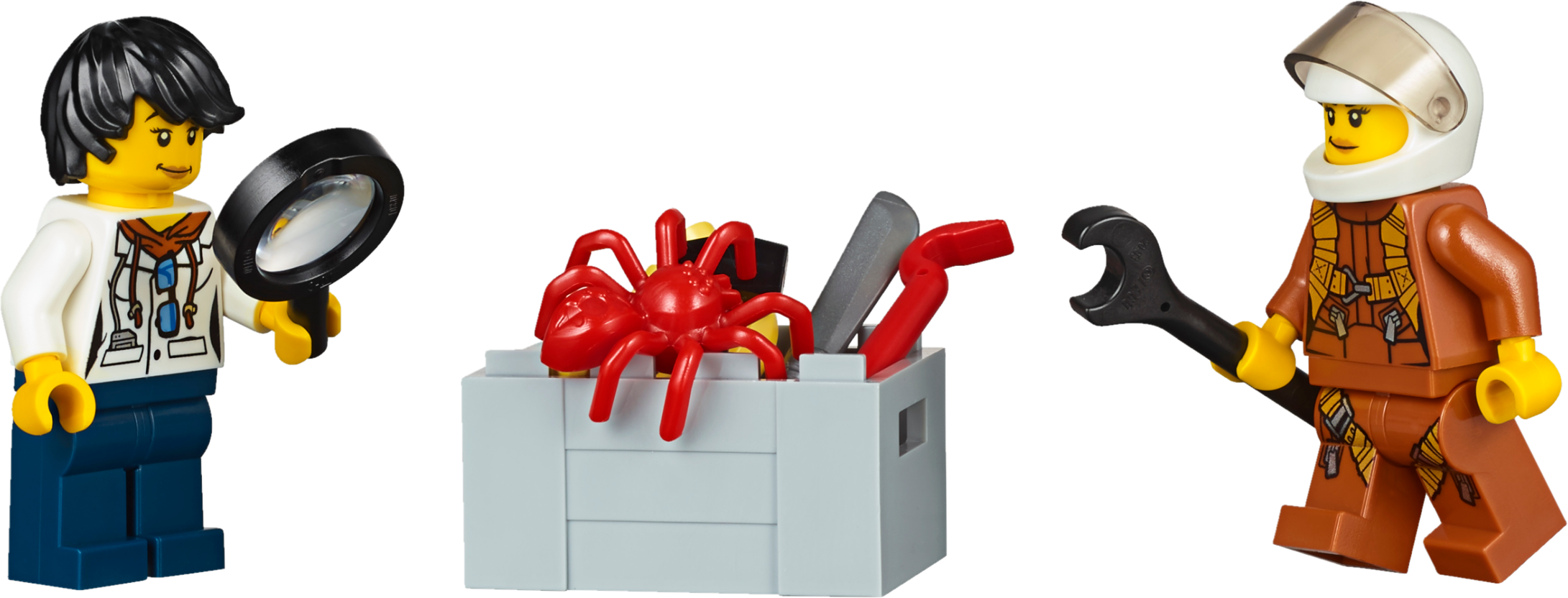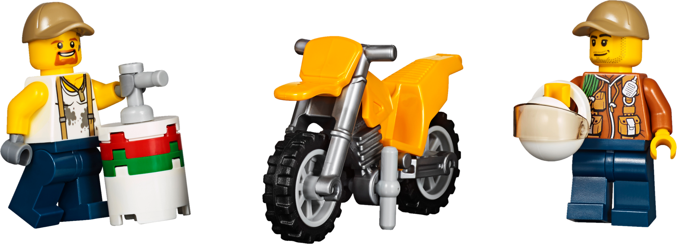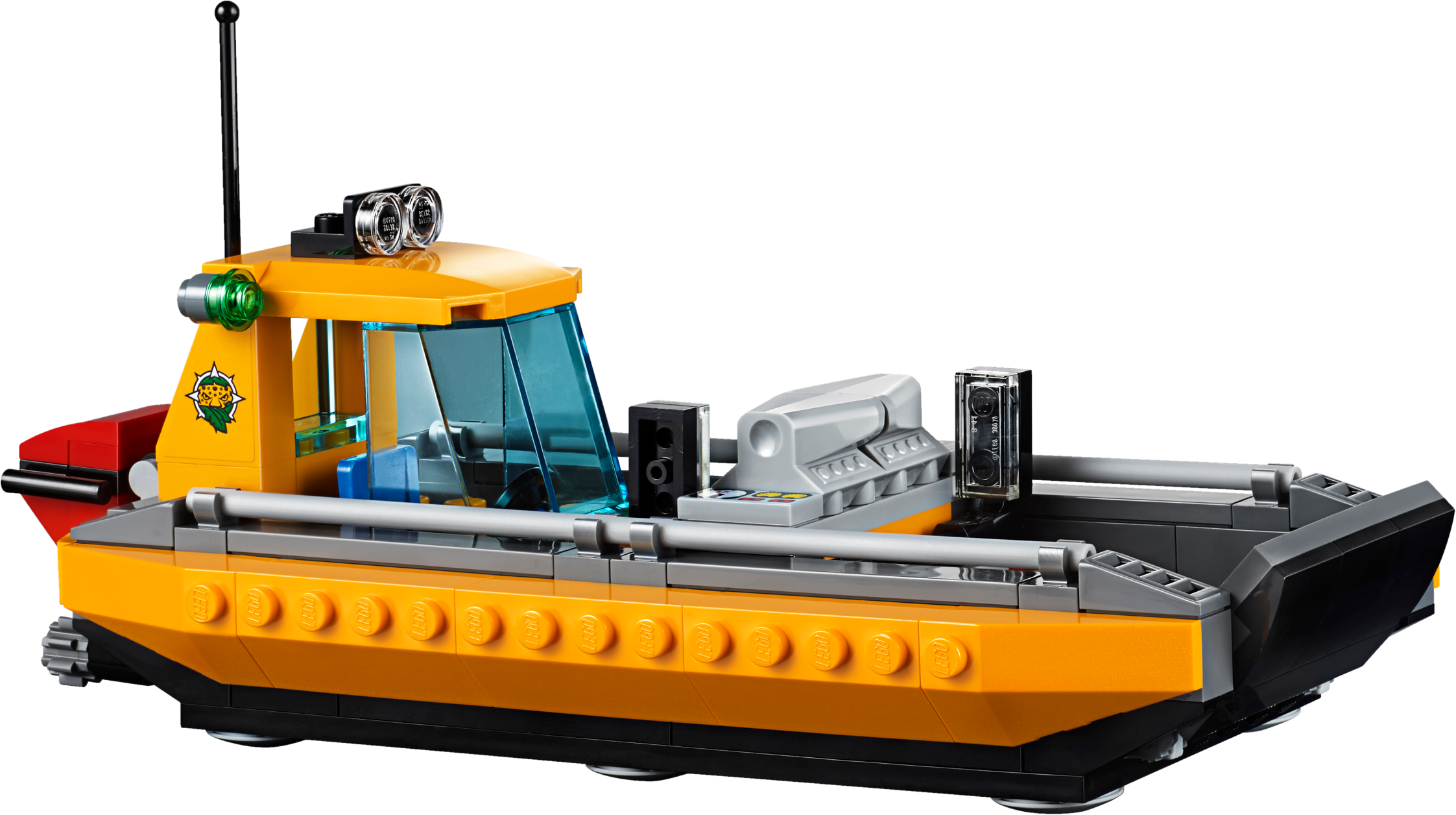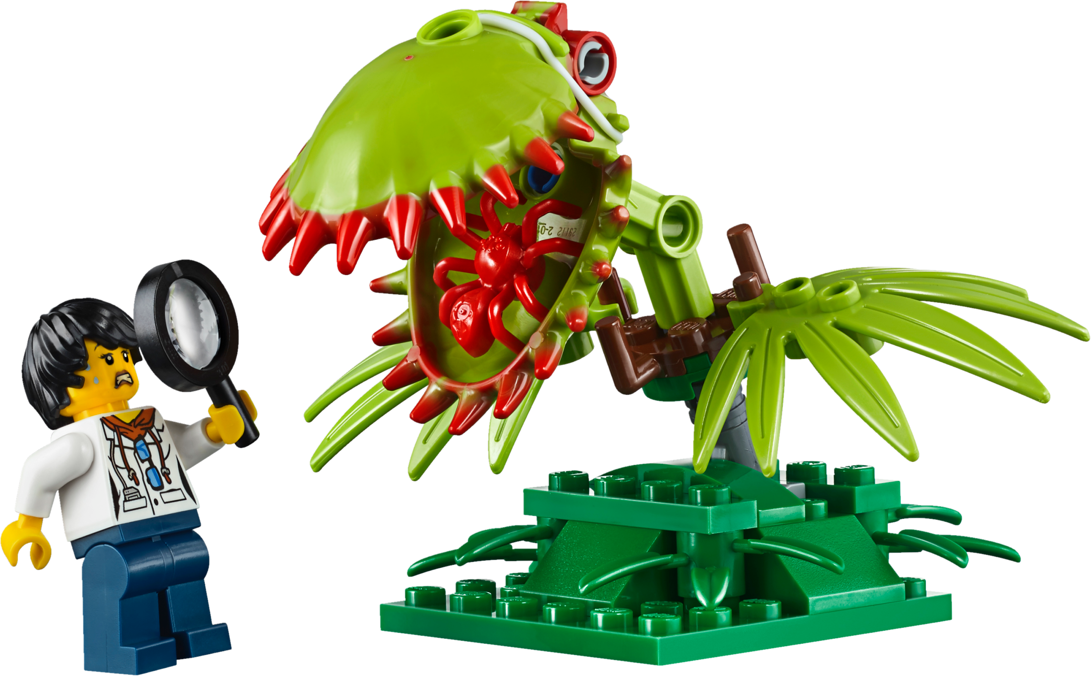 Keep your camp well-supplied in the LEGO® City jungle with the Jungle Air Drop Helicopter, featuring 2 spinning rotors, a clamp system to carry the pallet platform or truck, work tower with rotating crane, riverboat that holds 2 pallets or motorbikes, a temple, collapsible bridge, movable statue, buildable Venus flytrap and a 4x4 truck with winch. Includes 7 minifigures, plus tiger, crocodile and 2 spider figures.Includes 7 minifigures: riverboat captain, helicopter pilot, 3 explorers and 2 base camp workers, plus tiger, crocodile and 2 spider figures.Features a side-by-side rotor helicopter, work tower, pallet transporter, 2 motorbikes, riverboat, buildable Venus flytrap, and a temple and bridge build.Helicopter features a switch-activated clamp system to carry the included pallet platform or 4x4 truck with winch.Work tower features a rotating and elevating crane arm.Pallet transporter holds 3 pallets and/or 2 motorbikesRiverboat features a minifigure cockpit and space for 2 pallets and/or motorbikes.Venus flytrap build features a closing ‘mouth’ and space for a spider.Temple and bridge build features a moving statue that reveals a hiding space and lever-activated collapsing bridge.Push the switch on the helicopter’s tail to activate the clamp system and lift the pallet transporter or 4x4 truck.Rotate the crane arm on the work tower to move the pallet transporter or pallets to and from the riverboat.Hook the 4x4 truck’s winch to the statue to set it upright and find what’s hidden behind it.Slide the lever out on the temple and bridge section to collapse the bridge and send the explorer tumbling into the water.Push the top of the Venus flytrap down to trap the spider inside.Accessory elements include 3 pallets, mobile lab, fuel box, 2 fuel cans, treasure chest, gold-colored chalice, box, machete, working magnifying glass, camera and other tools.Side-by-side rotor helicopter including rotors measures over 5” (14cm) high, 15” (38cm) long and 22” (56cm) wide.Riverboat measures over 2” (6cm) high, 7” (20cm) long and 3” (8cm) wide.4x4 truck measures over 2” (7cm) high, 4” (12cm) long and 2” (7cm) wide.Work tower measures over 7” (20cm) high, 5” (15cm) wide and 5” (13cm) deep.Temple and bridge build measures over 4” (11cm) high, 12” (31cm) wide and 5” (14cm) deep.Pallet transporter measures over 2” (7cm) high, 2” (6cm) wide and 5” (14cm) deep.Each pallet measures over 1” (4cm) high, 1” (5cm) wide and 1” (3cm) deep.Venus flytrap build measures over 3” (8cm) high, 2” (6cm) wide and 3” (9cm) deep.Crocodile figure measures over4” (11cm) long.Tiger figure measures over 3” (8cm) long.