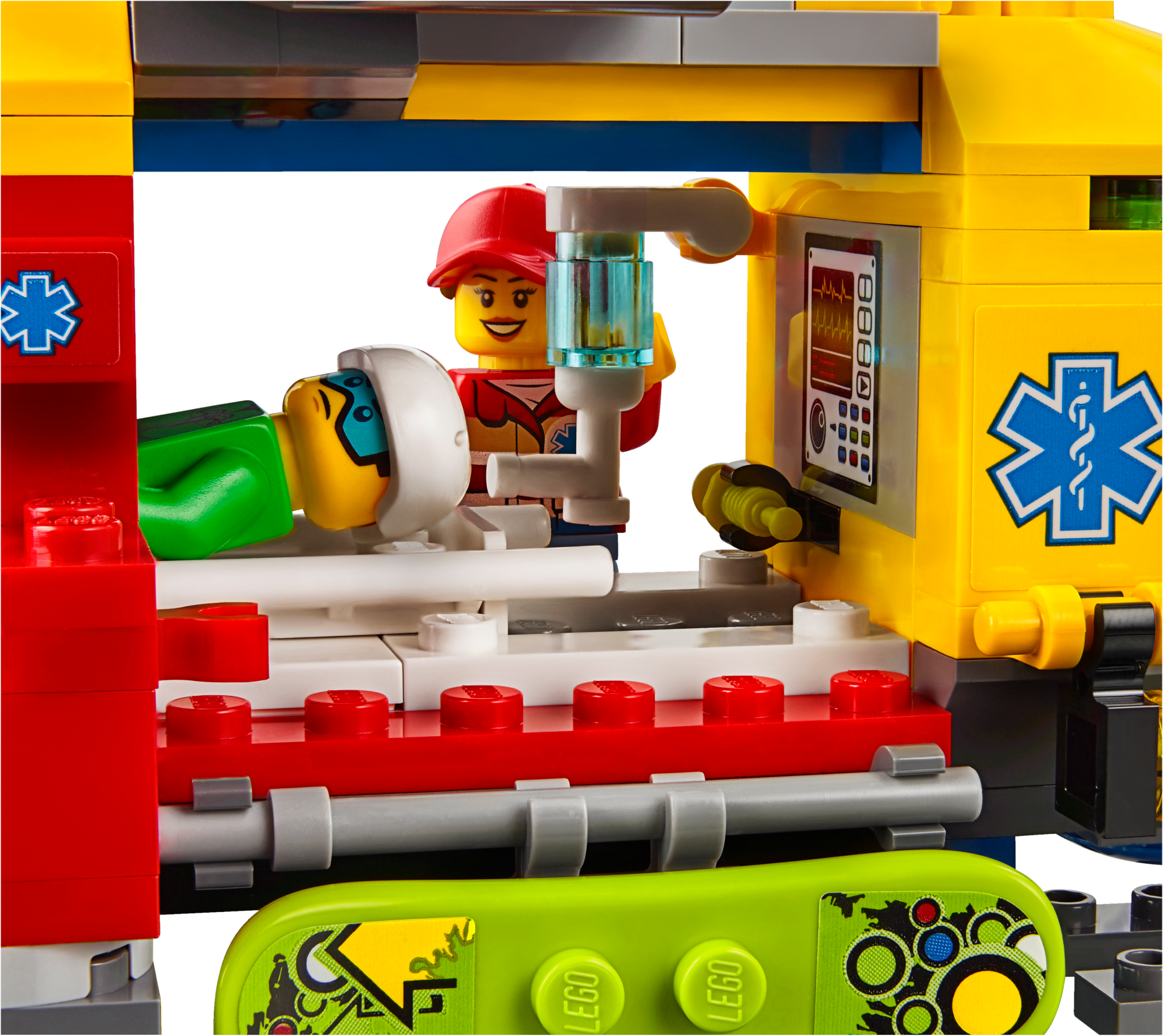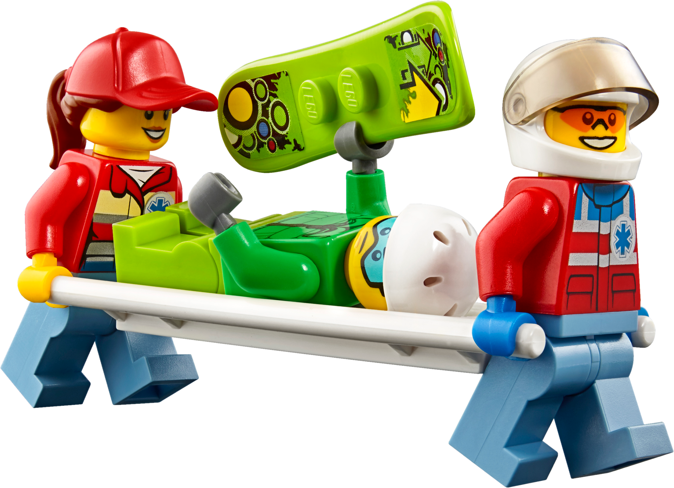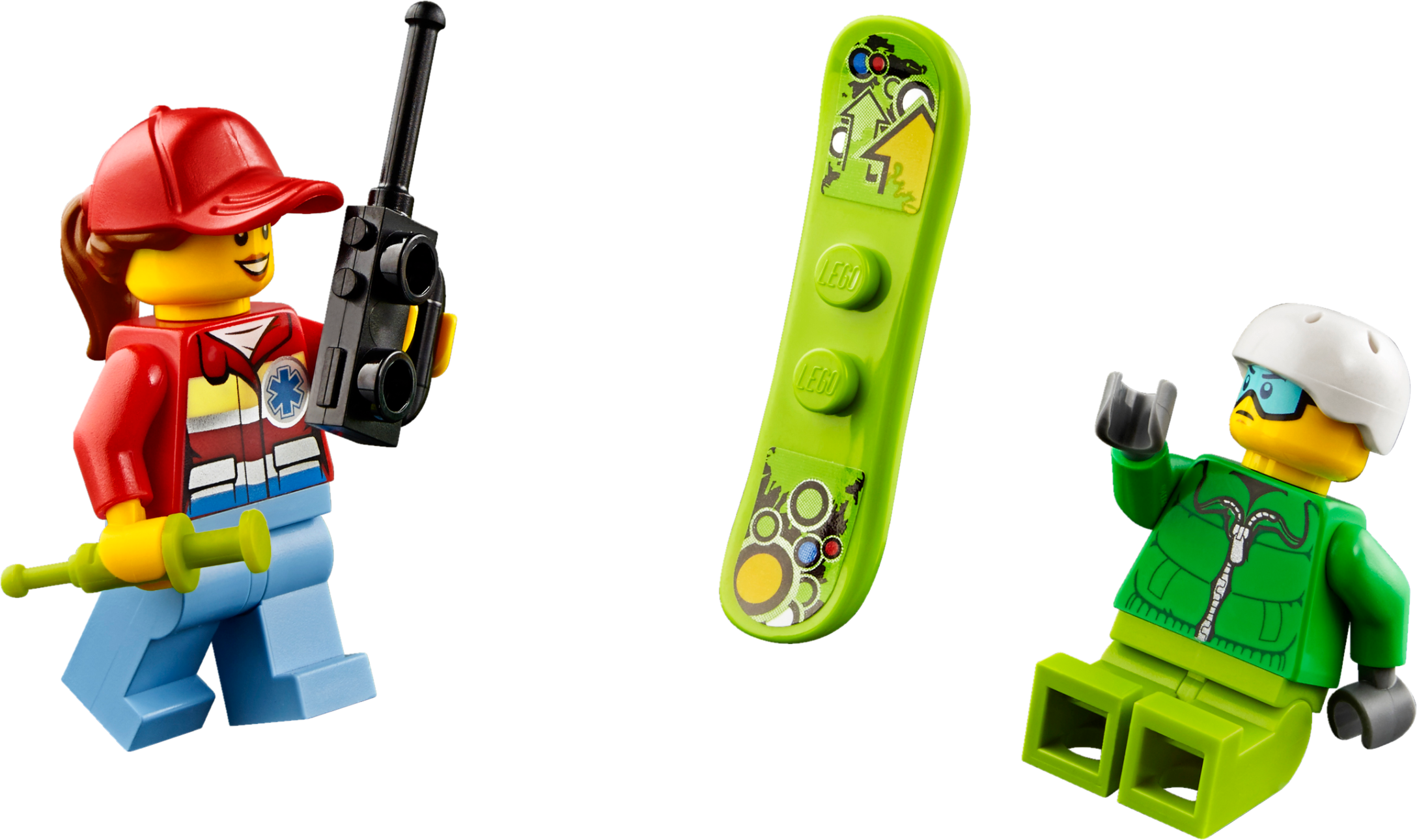 Accessory elements include a snowboard, stretcher and a radio.