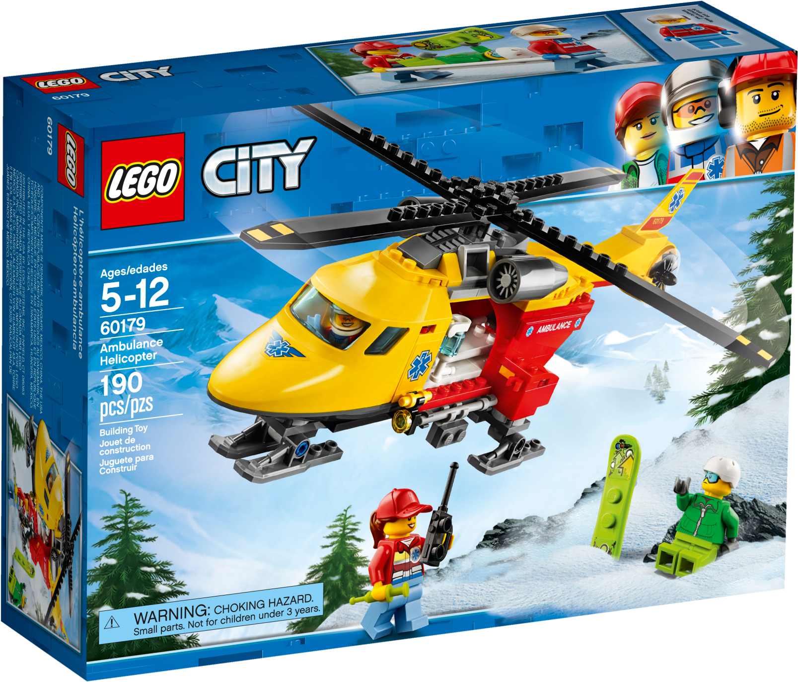 Includes 3 minifigures: a pilot, doctor and a snowboarder.