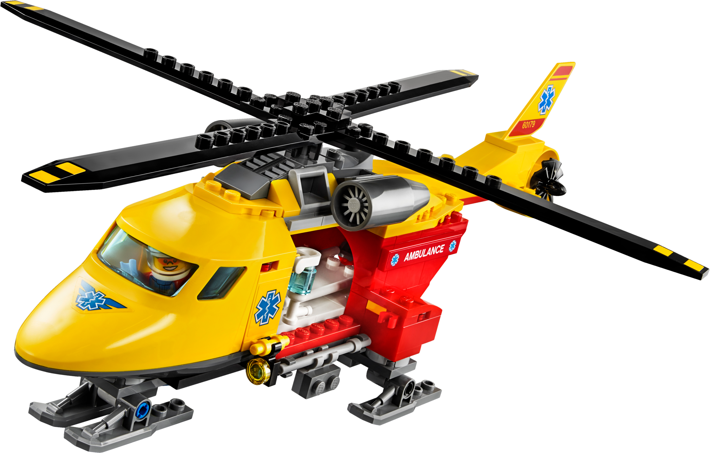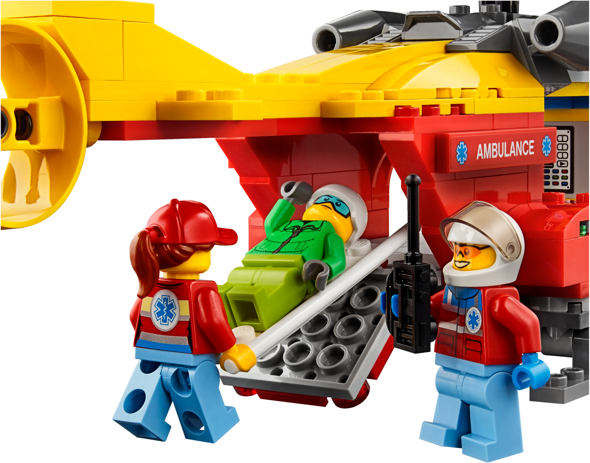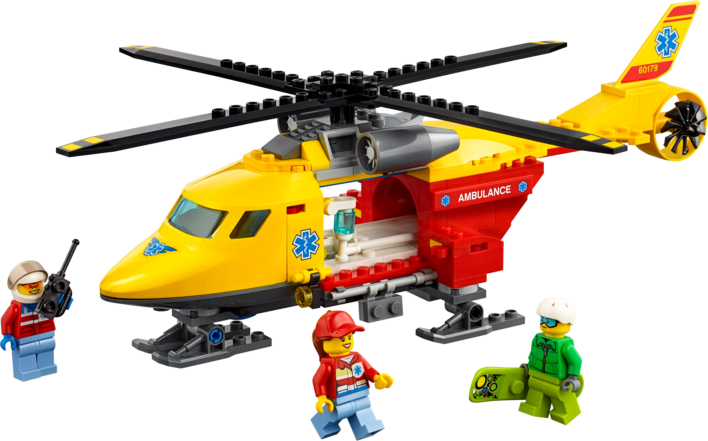 Join the LEGO® City rescue team and fly the Ambulance Helicopter! This fun toy features spinning rotors, hatch on the back, landing gear and room for a stretcher inside, plus snowboard and radio elements, and 3 minifigures.