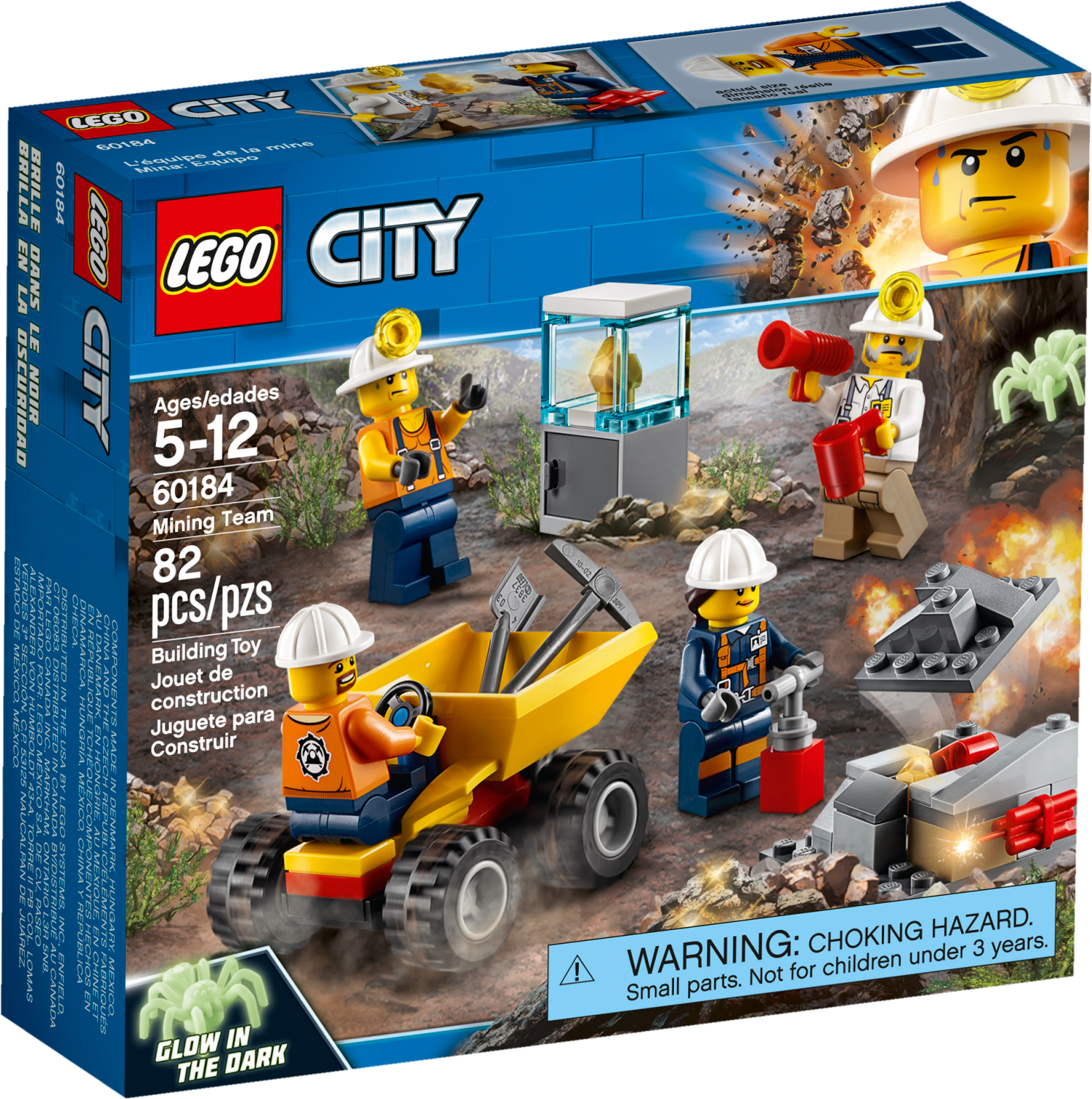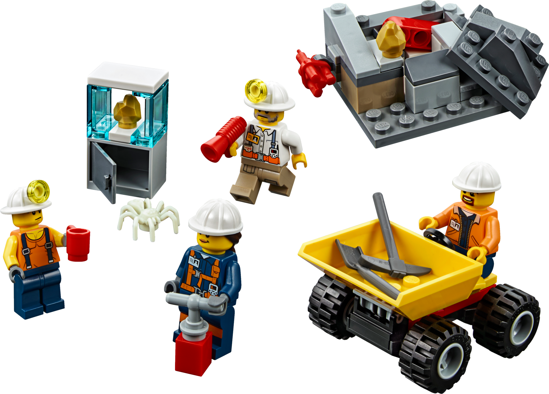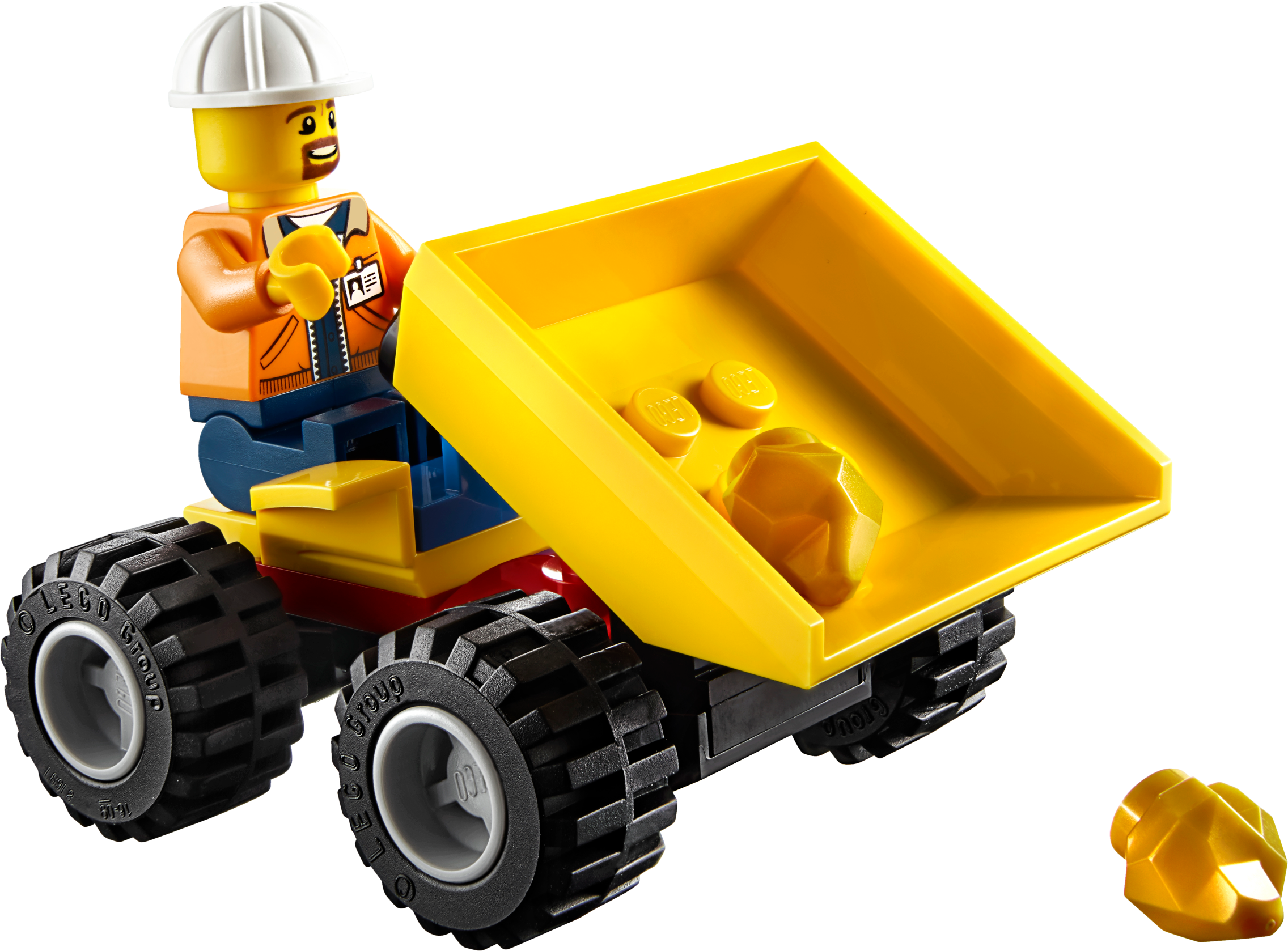 Grab your hard hat and head out with the LEGO® City Mining Team to dig for gold! This fun building toy features a rock pile with space for golden nugget elements and breakaway elements, as well as a dumper with tipping bed and space for a minifigure, and a research station. Includes 4 minifigures and a glow-in-the-dark spider figure.