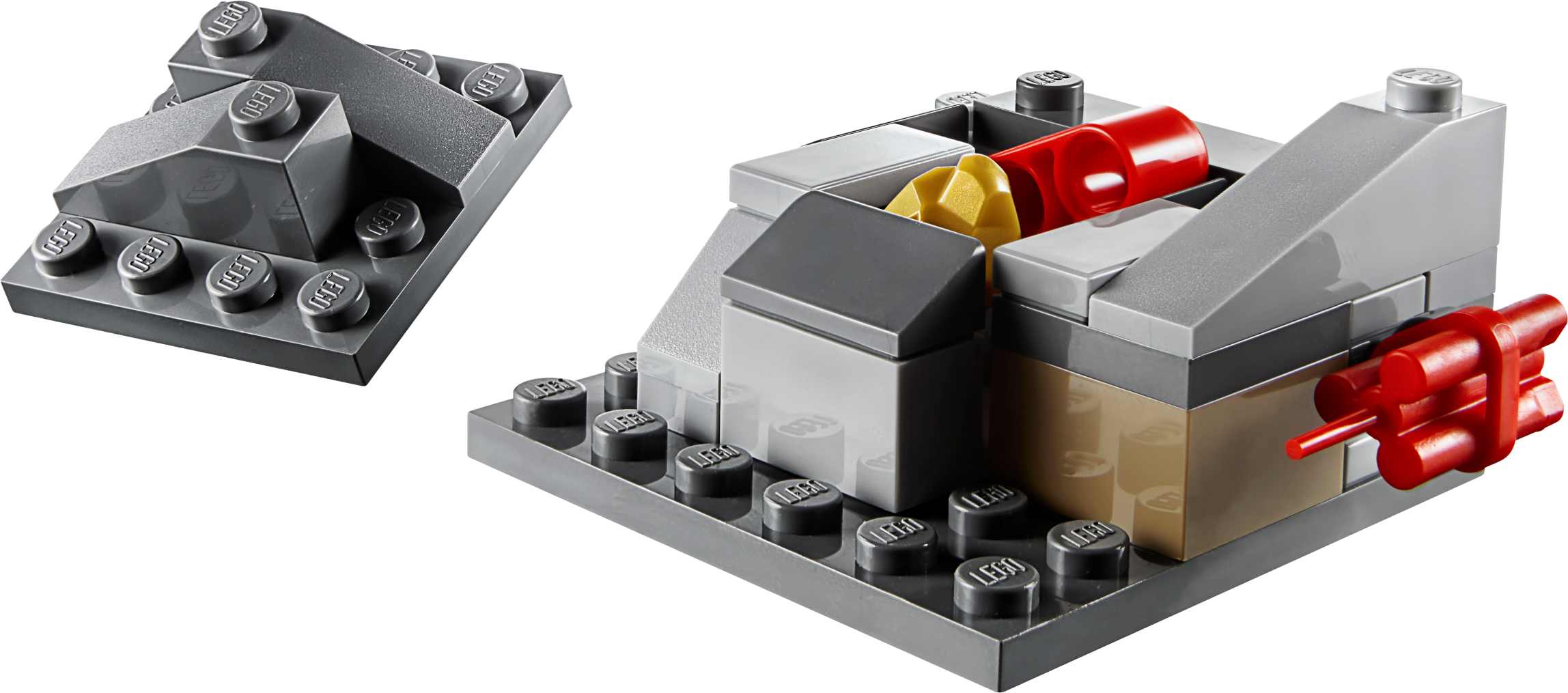 Also includes a research station with space for golden nugget elements and a rock pile with breakaway elements, space for a dynamite stick element and golden nugget elements.