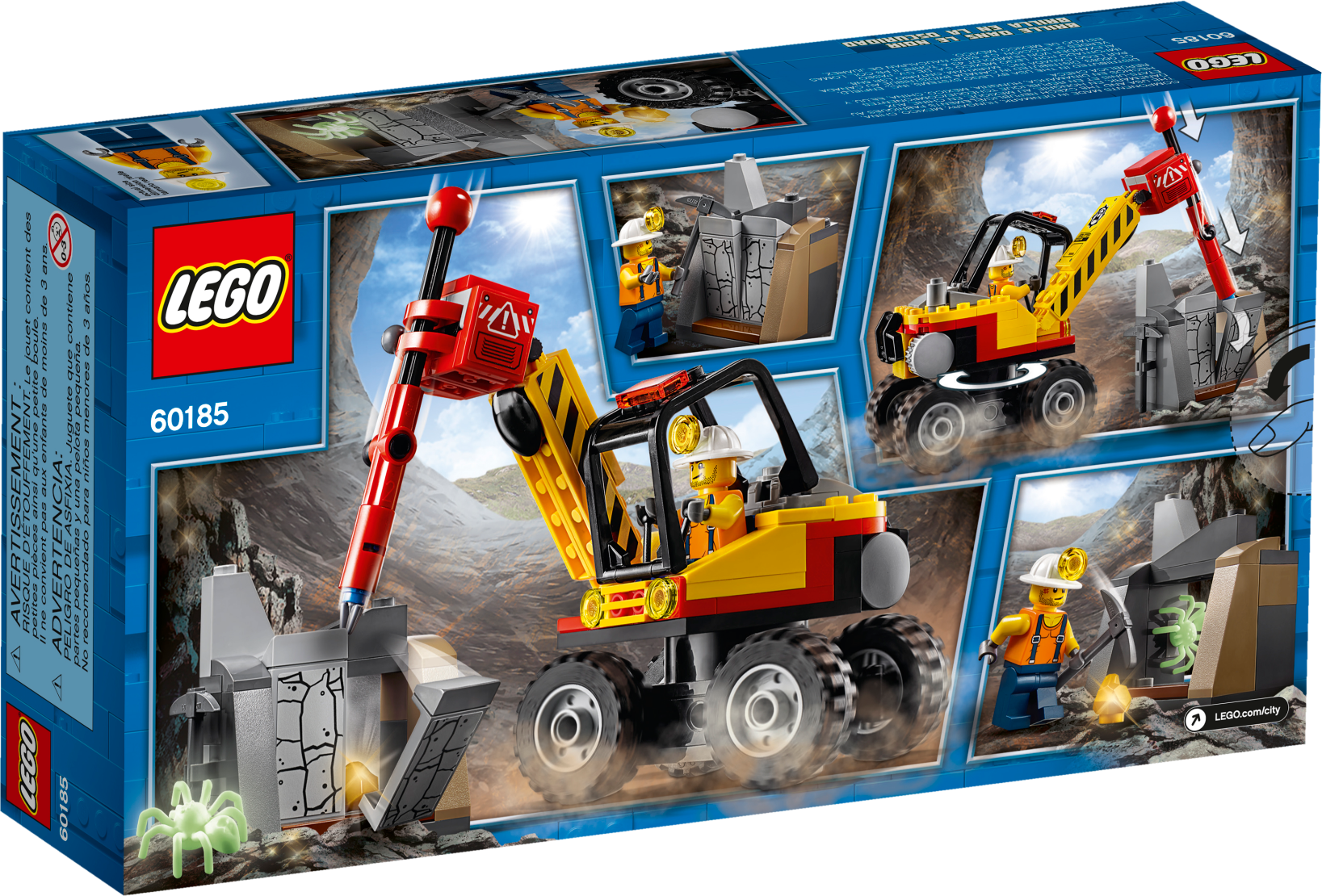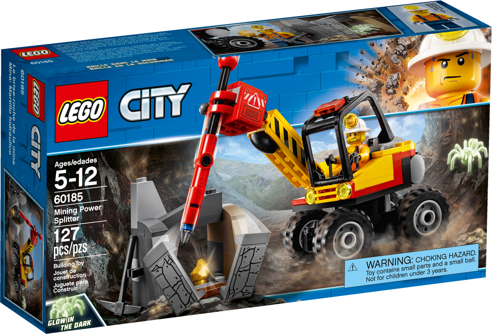 Grab your hard hat and head out with the LEGO® City Mining Power Splitter to dig for gold! This fun construction toy features a power splitter with functioning jackhammer, raising arm and rotating cab, as well as a rock pile with breakaway elements and space for a golden nugget element. Includes a minifigure and a glow-in-the-dark spider figure.
