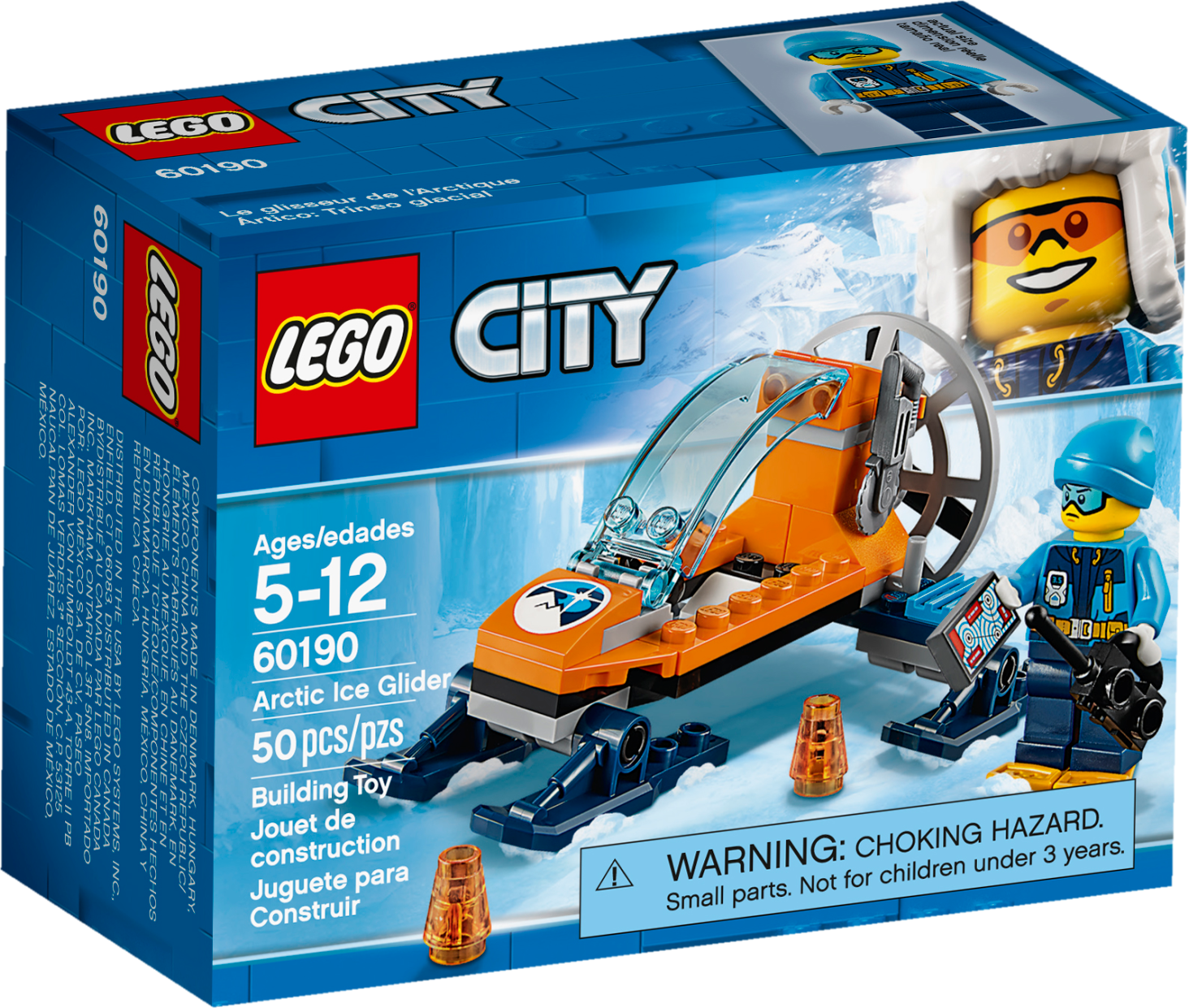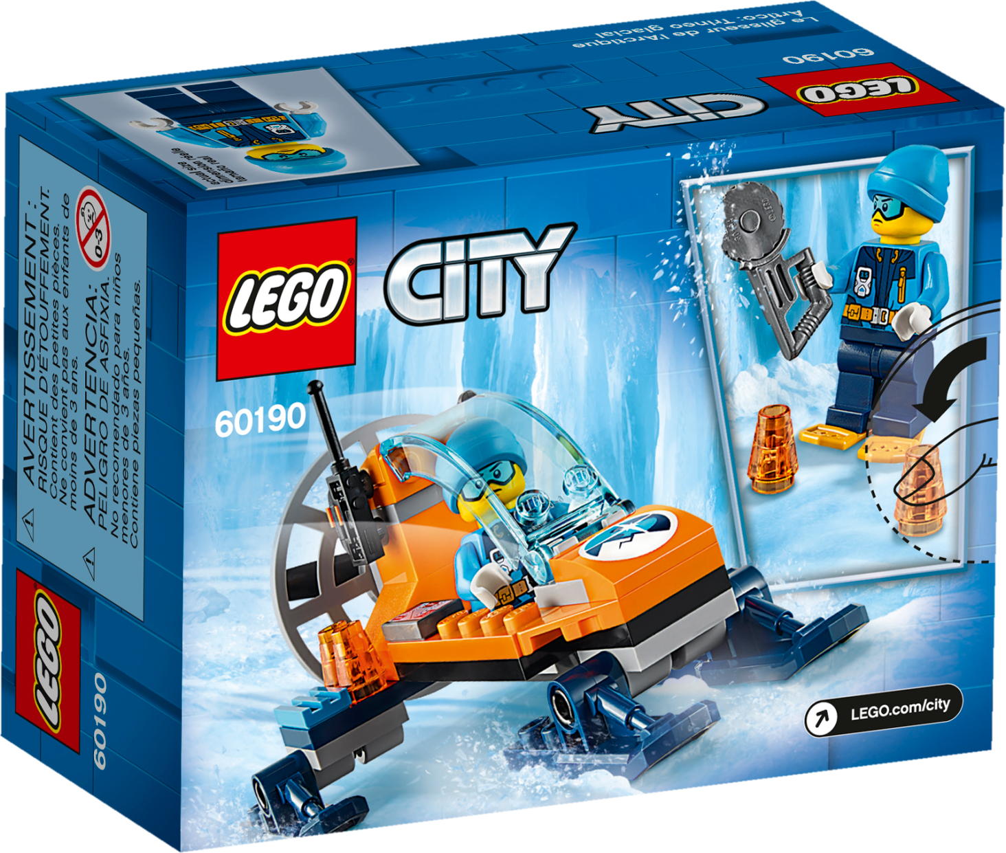 Discover incredible things with the LEGO® City 60190 Arctic Ice Glider set, featuring an ice glider with opening cockpit and spinning fan rotor, plus 2 remote tracker beacons, a decorated computer pad, radio, saw and a pair of snowshoes. This cool Arctic Expedition set includes a LEGO minifigure.