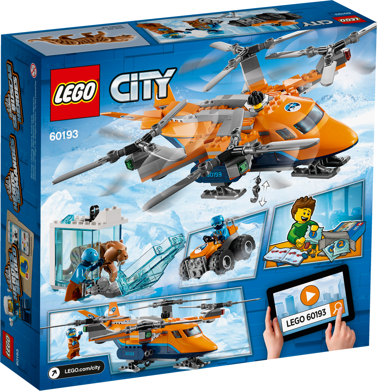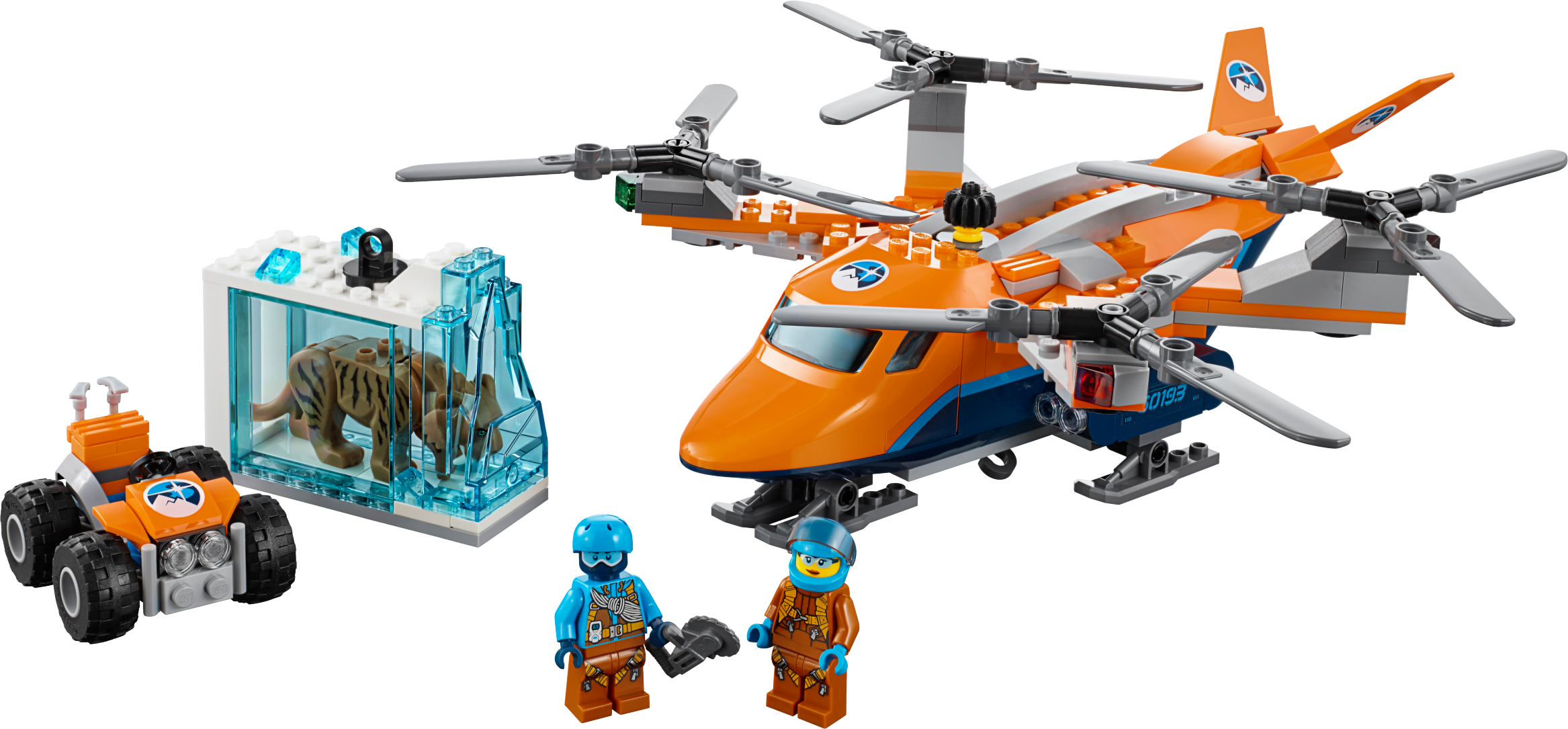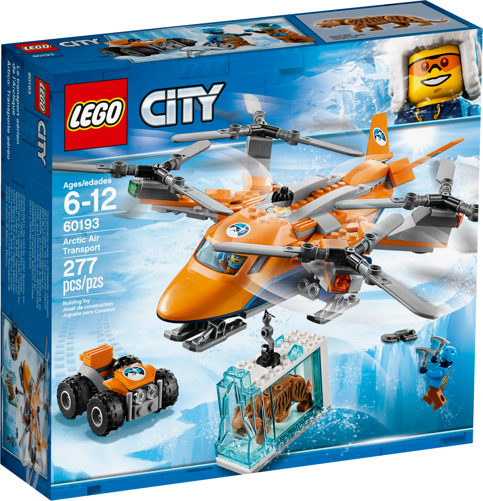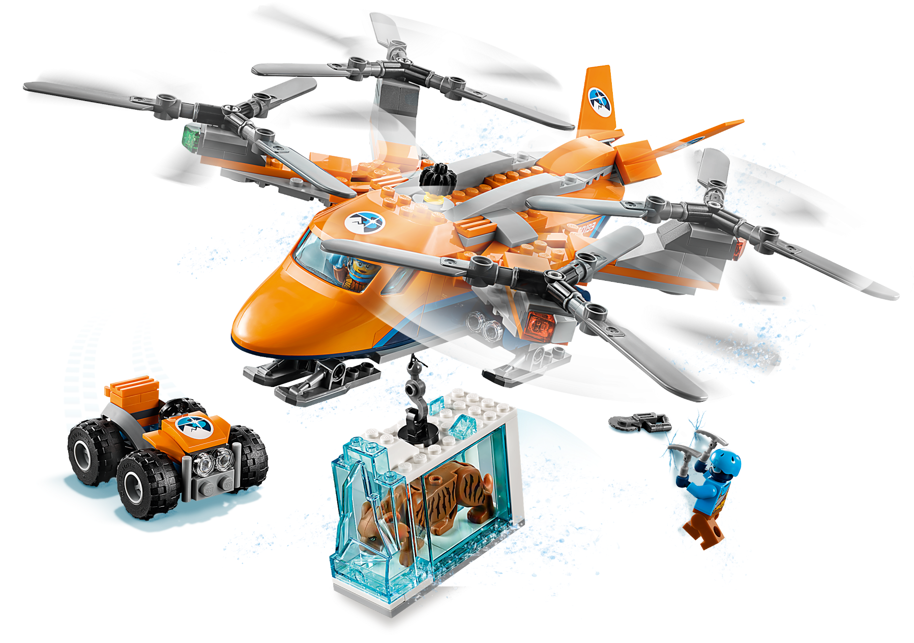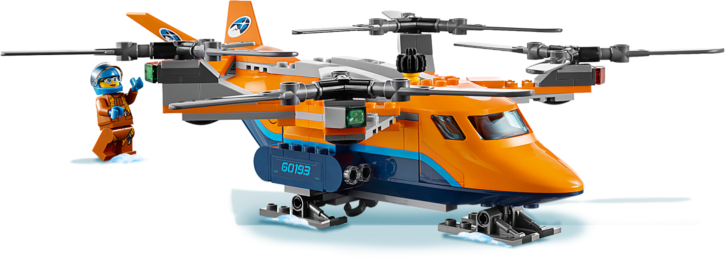 Carry precious items with the LEGO® City 60193 Arctic Air Transport, featuring a heavy-duty quadrocopter with 4 spinning rotors, ski landing gear, opening minifigure cockpit and a functioning winch with rope and hook. This fun Arctic Expedition set also includes an ATV with 2 pick axes, saw, translucent-blue ice block with hook latch, opening side and ‘frozen' saber-toothed tiger figure, plus 2 LEGO explorer minifigures.