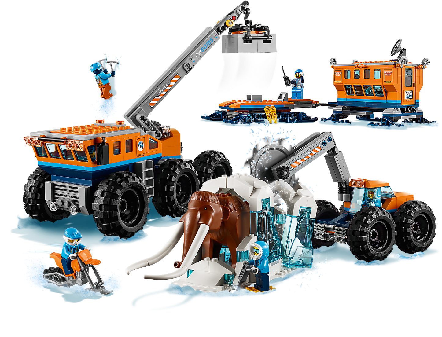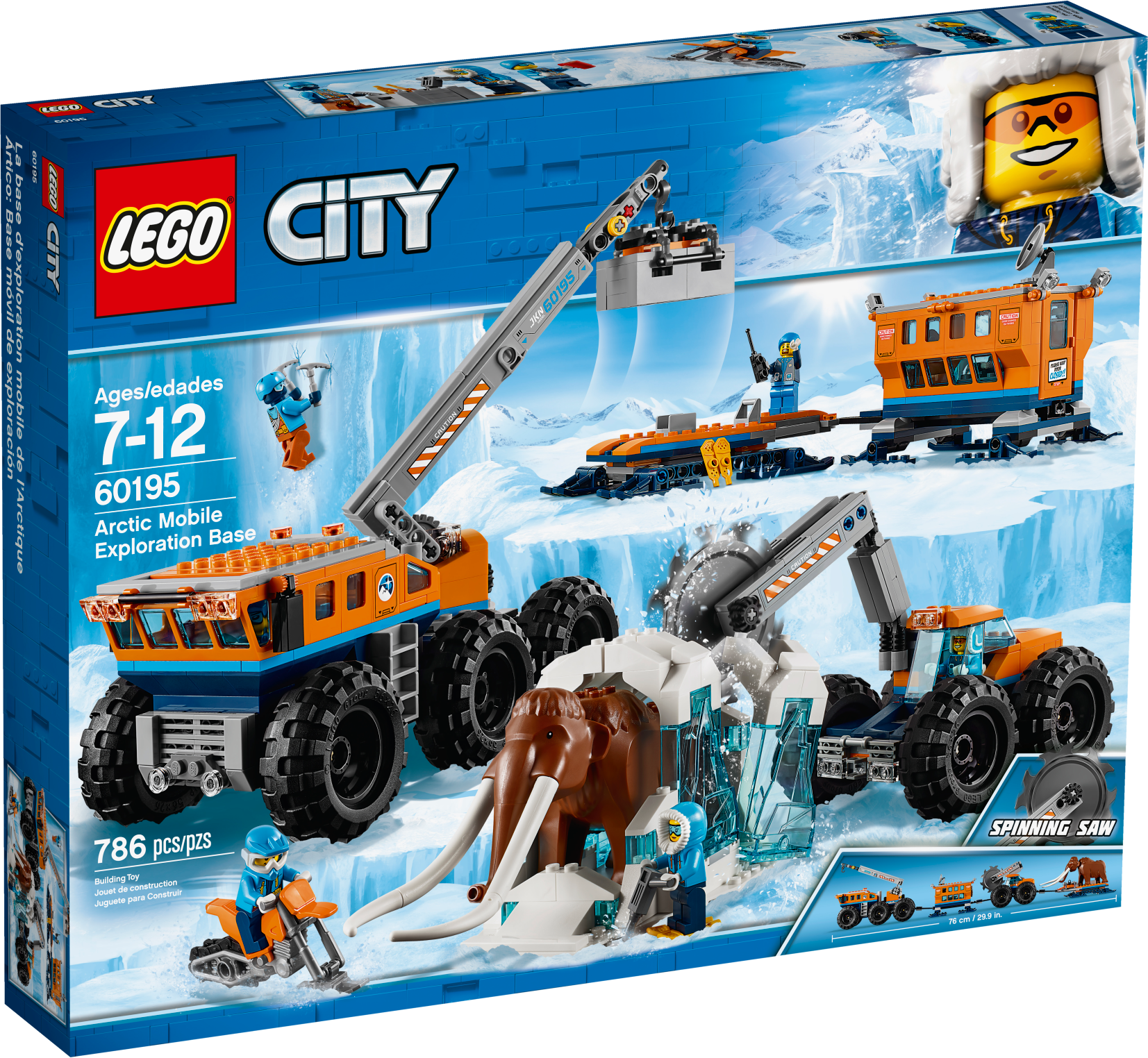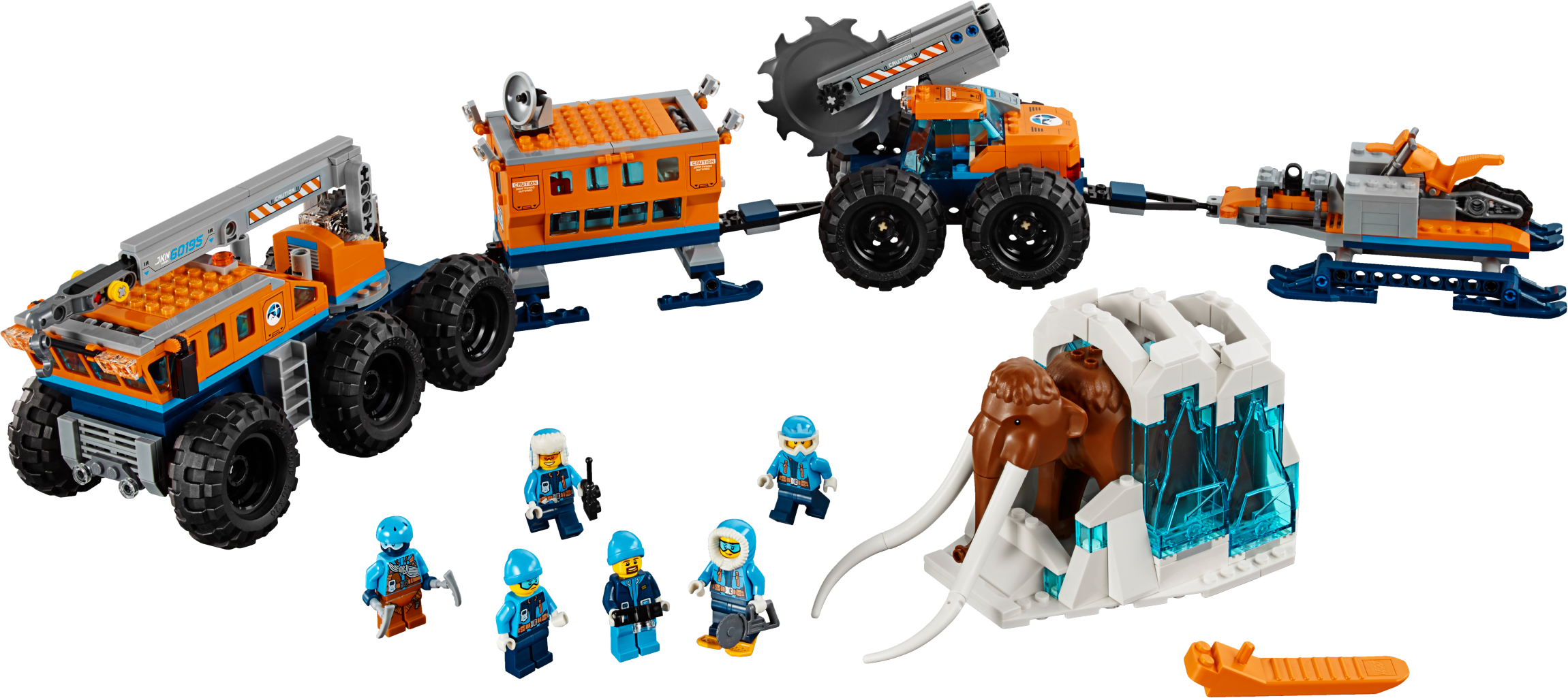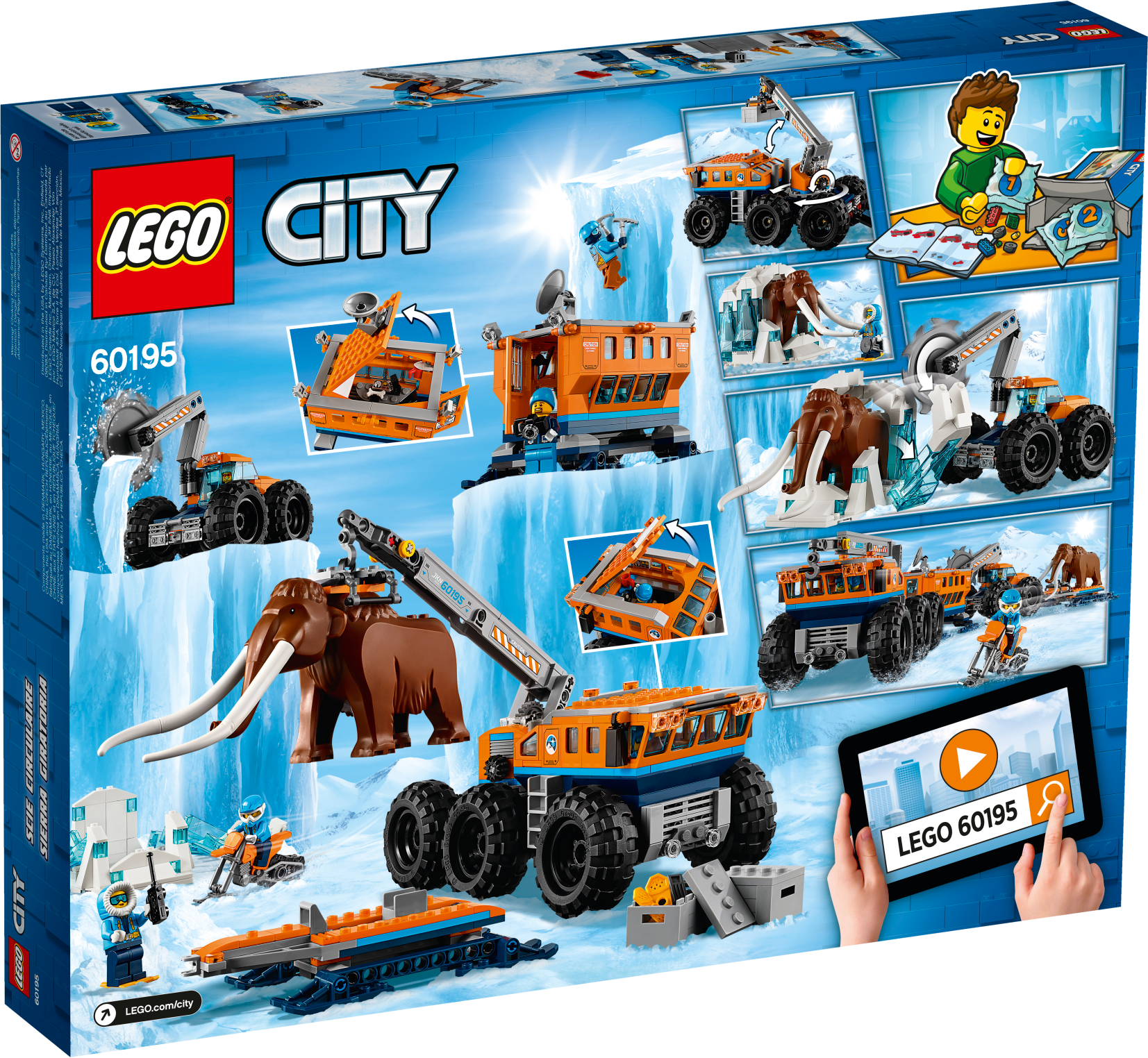 Investigate awesome finds on the go with the LEGO® City 60195 Arctic Mobile Exploration Base! This fun set features a crane with posable arm, hook, platform and a trailer, plus a mobile lab unit with radar dish and opening door. Also includes a mobile saw vehicle with posable arm and rotating blade, plus a snow bike and a large ice build to hold the mammoth. This Arctic Expedition set includes 6 LEGO explorer minifigures and a mammoth figure.