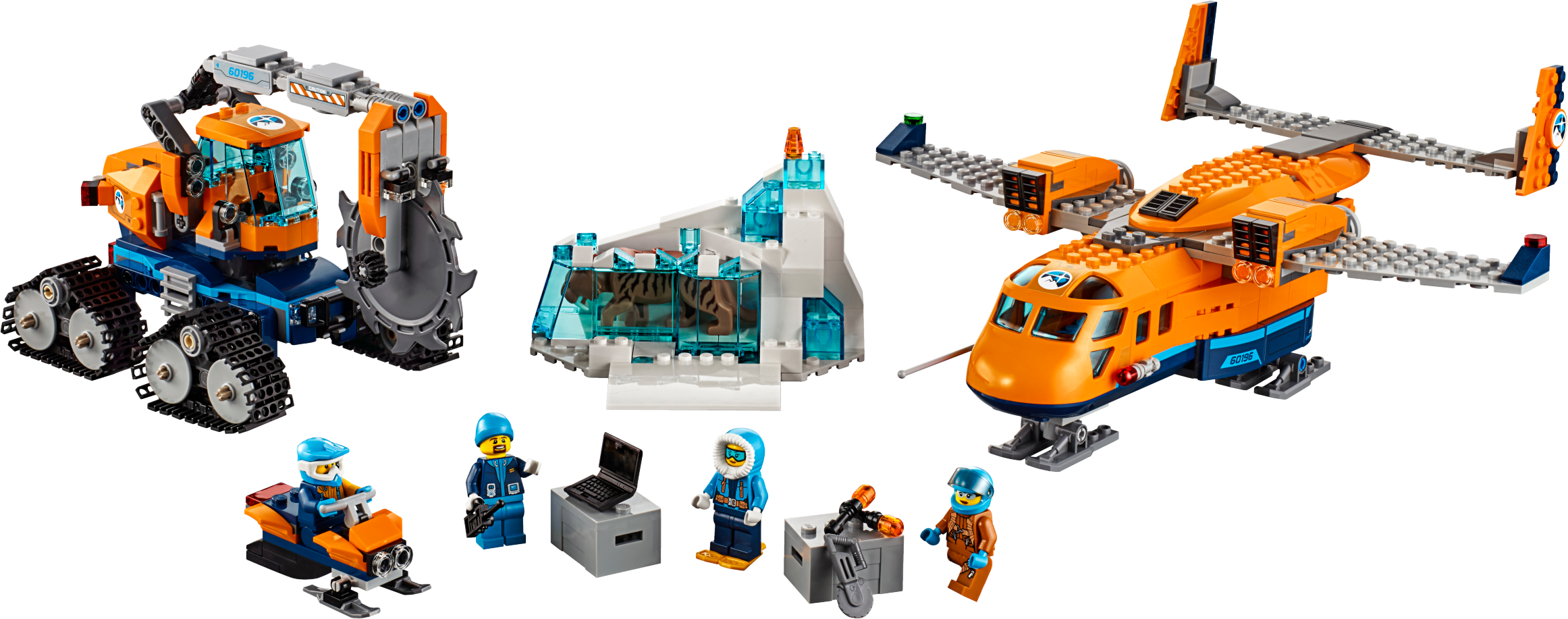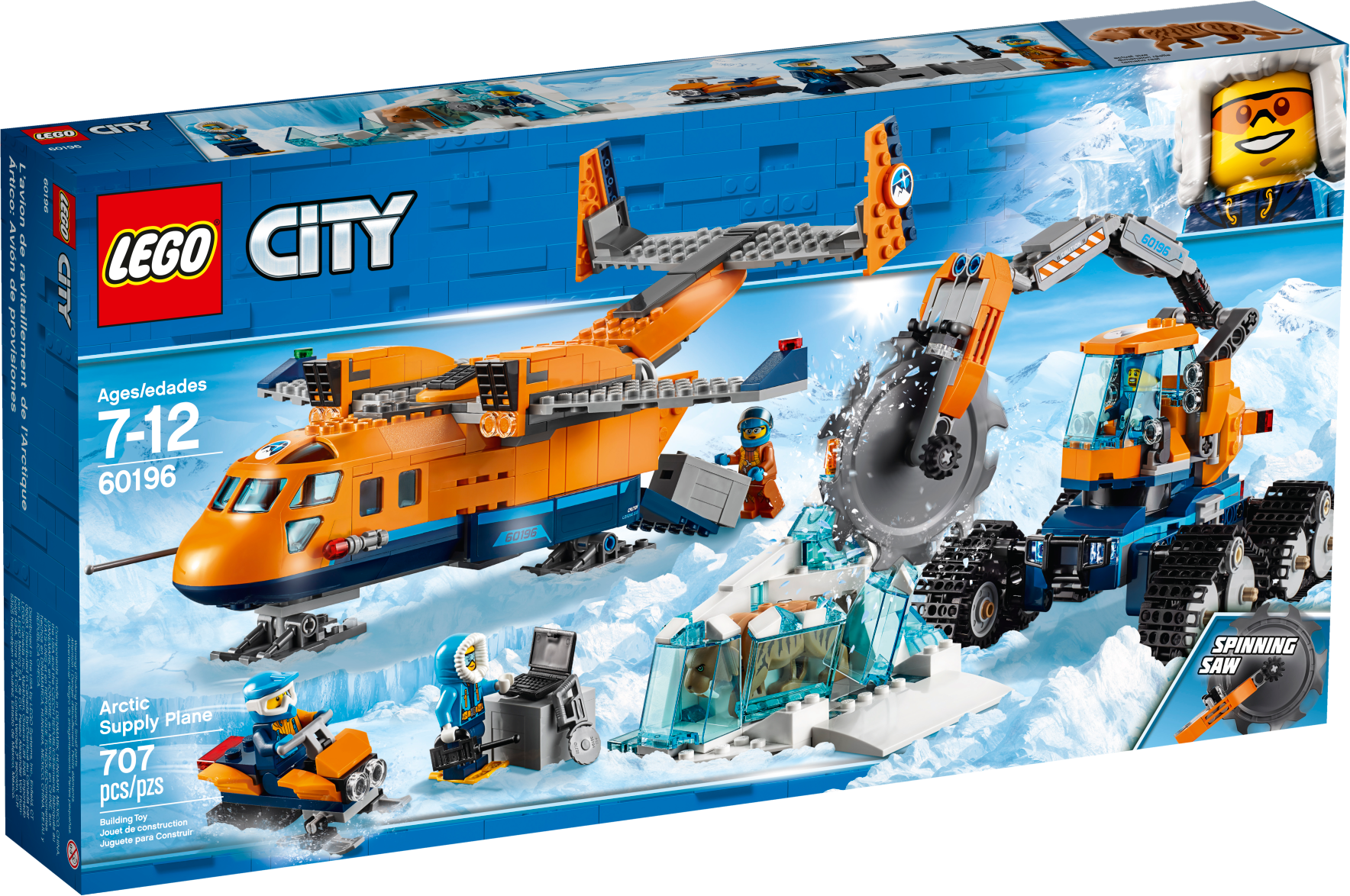 Airlift amazing finds with the LEGO® City 60196 Arctic Supply Plane, featuring an opening back and ski landing gear, plus an ice cutter vehicle with rotating cab, articulated saw arm and spinning blade, an ice scooter and a ‘frozen’ saber-toothed tiger encased in an ice formation with translucent blue bricks. This Arctic Expedition set includes 4 LEGO minifigures.