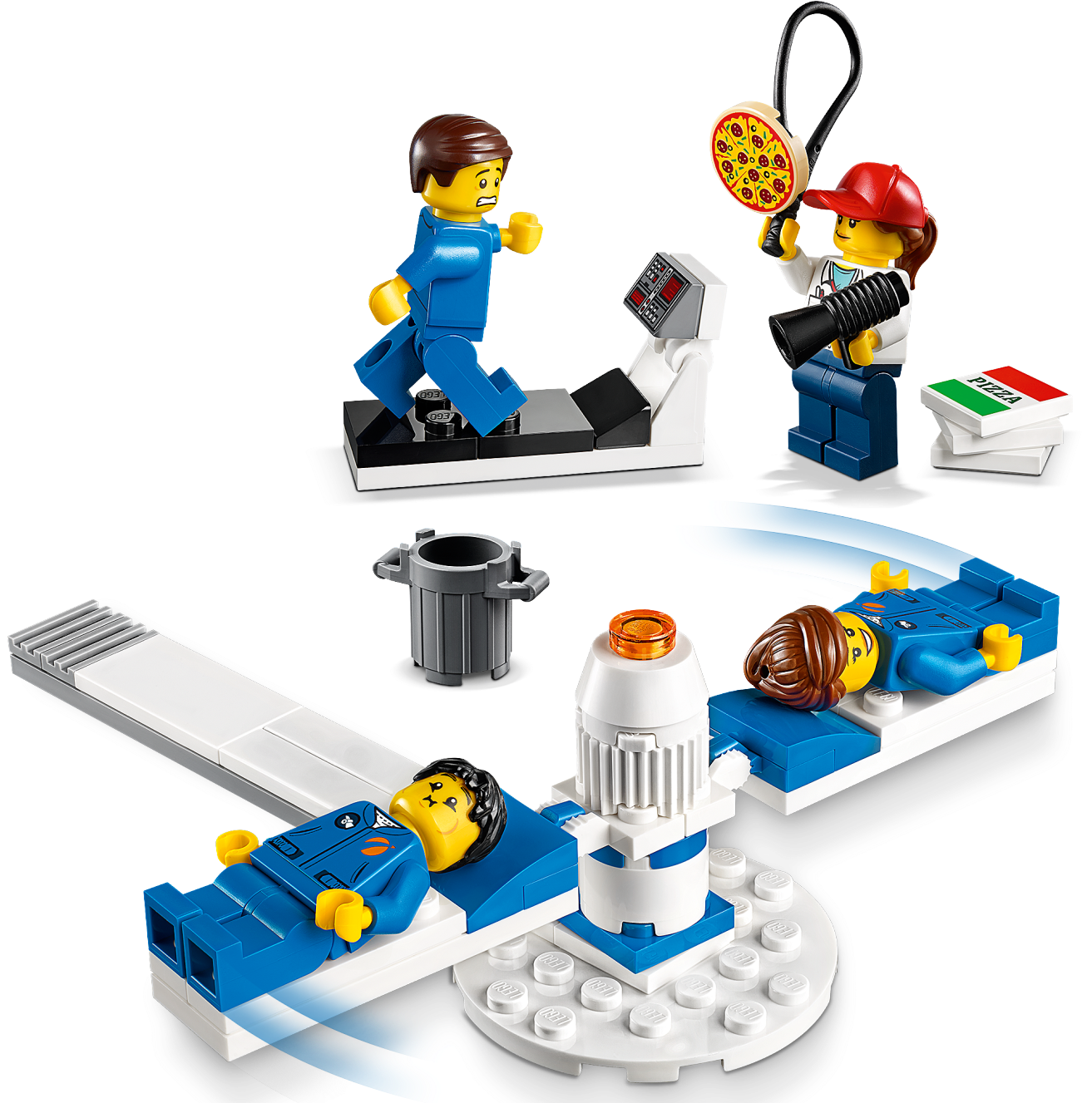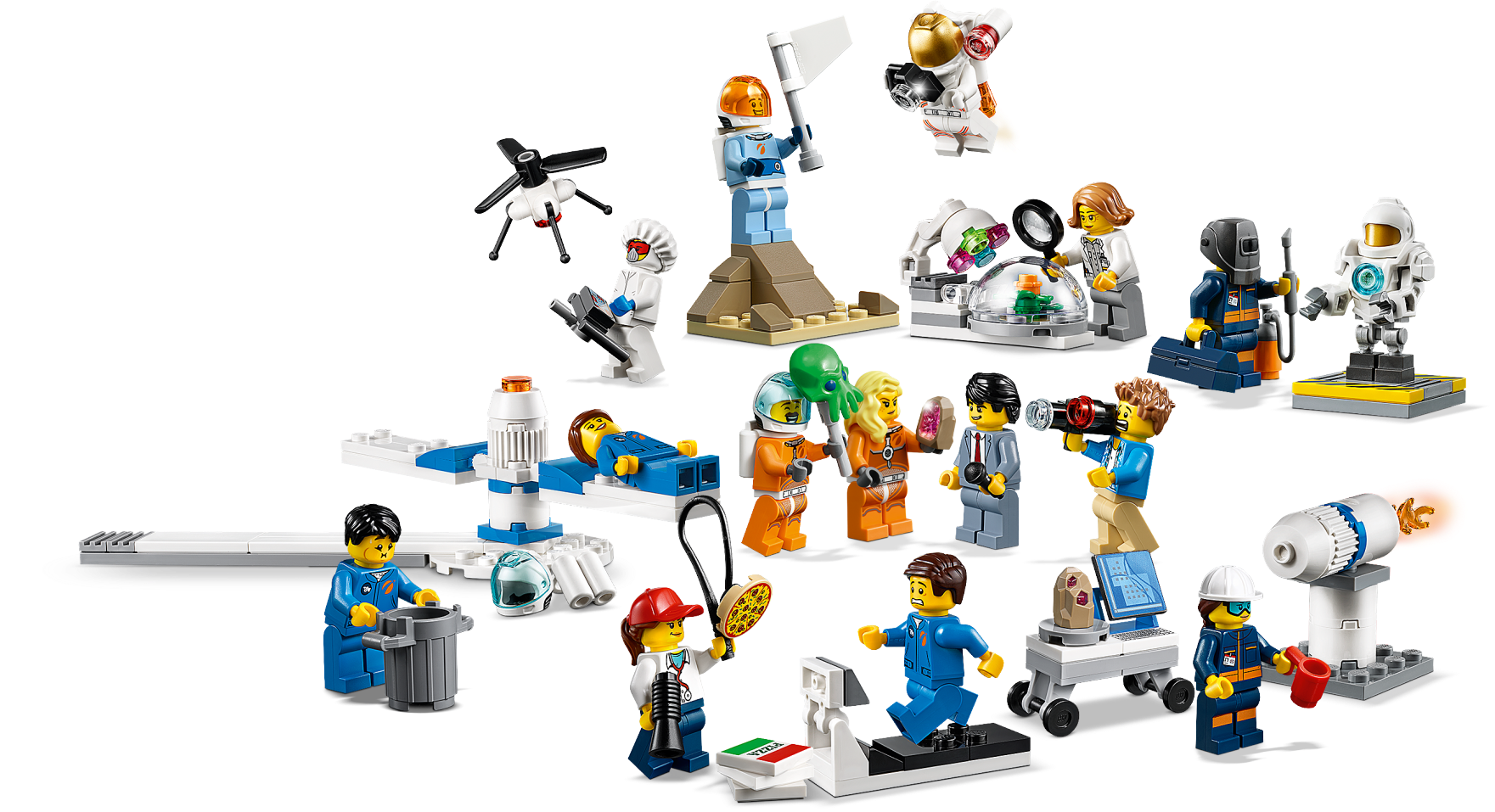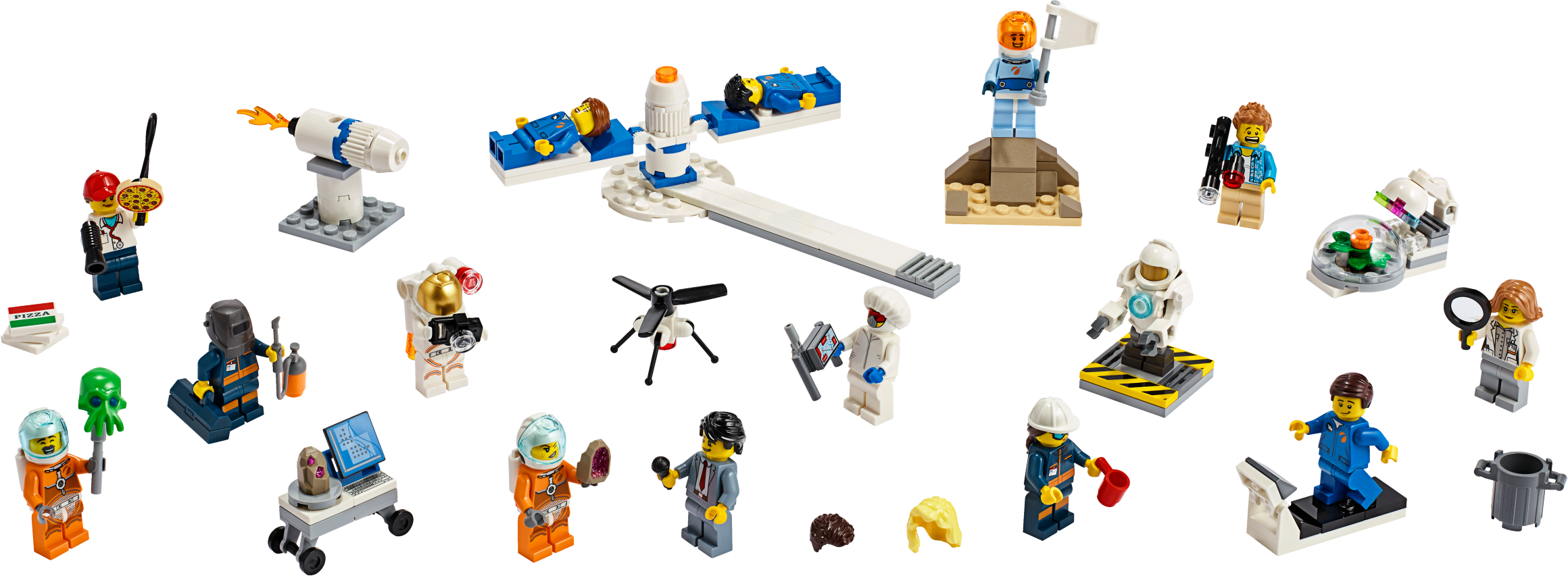 Accessory elements include a magnifying glass, welder, white flag, megaphone, camera, microphone, alien head on a stick, 2 astronaut helmets with blue visor, astronaut helmet with golden visor, Extra Vehicular Activity suit with a golden visor and light, trashcan, mug, drone remote, pizza boxes, pizza, 2 new-for-June-2019 geodes and a toolbox.