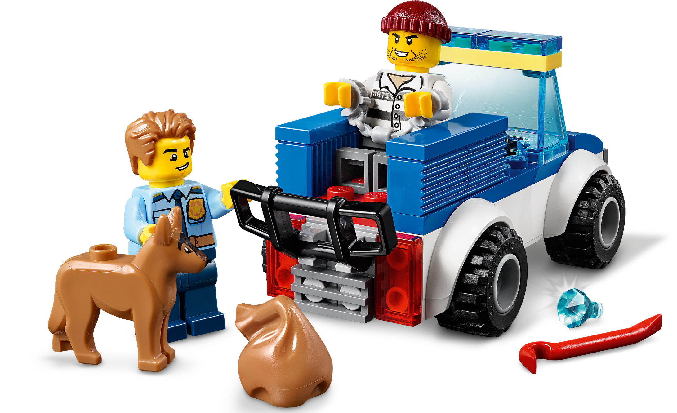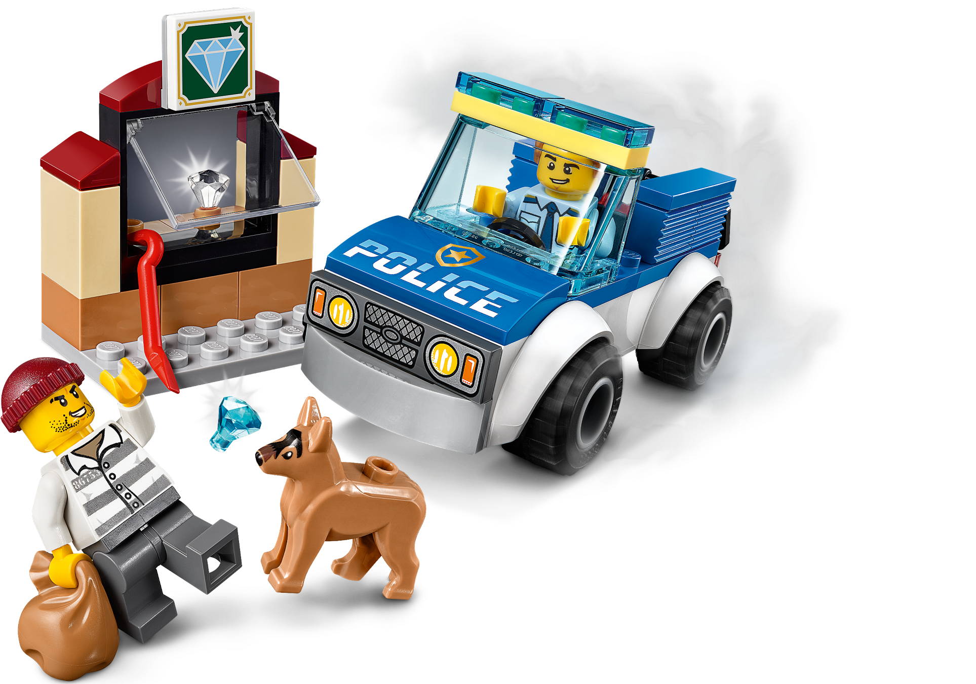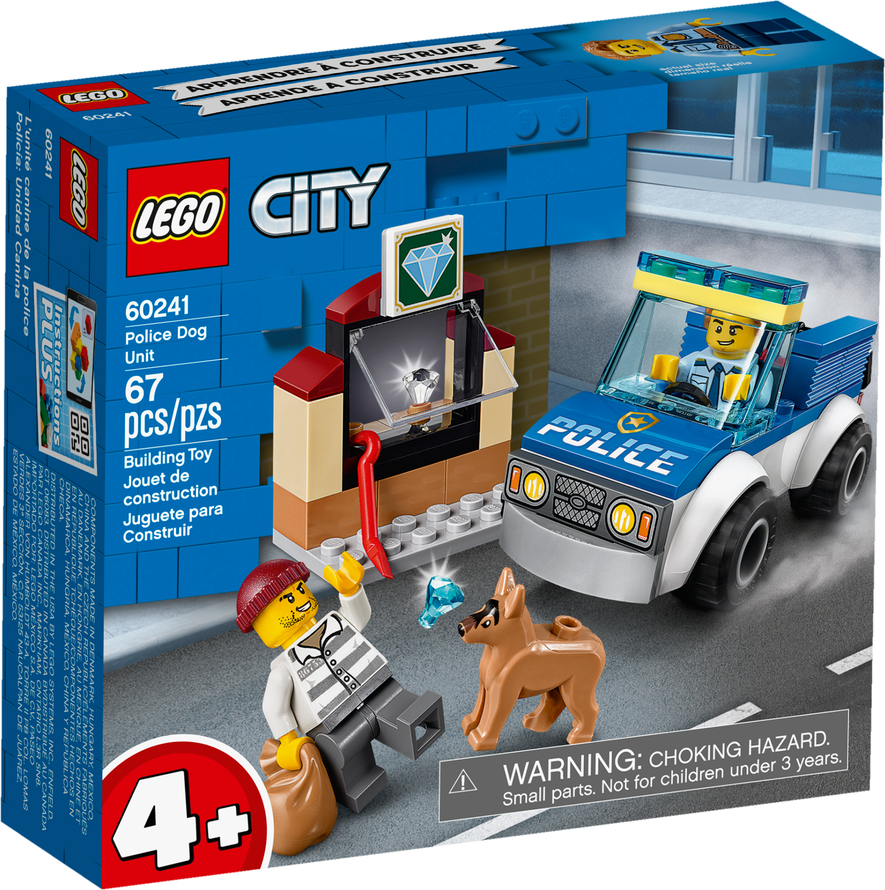 Youngsters love to role-play everyday heroes, and with this LEGO® City Police Dog Unit (60241) set they can do just that! There’s a cool toy police car with room for the police officer and his faithful police dog, a jewelry shop with gems, plus a crowbar-wielding crook. The perfect scenario for small crimefighters with big imaginations.Fun police playset for kidsThis 4+ toy playset includes a simple printed building guide and a special Starter Brick element so youngsters can take pride inconstructing LEGO toys. And with the free LEGO Life app for smartphones and tablets, kids get Instructions PLUS – an interactive building guide with zoom and rotate viewing tools that really do turn LEGO building into child’s play.LEGO City – Cool toys for kidsWith LEGO City police sets, kids get to immerse themselves in open-ended adventures and action-packed scenarios that reflect real-life situations. And, with a wide range of feature-rich buildings and vehicles, kids' imaginations arefree to soar!This Police Dog Unit toy is an ideal introduction to the exciting world of LEGO® City. Perfect for kids aged 4+, it is designed to inspire open-ended, imaginative role-play based on real-life scenarios.What’s in the box? A cool toy police car with room for the police officer and his faithful police dog, a jewelry shop setting with 2 gems, and a crowbar-wielding crook with a sack for stashing his haul.Kids can combine the characters and models in this LEGO® City Police Dog Unit (60267)building set with other LEGO toy playsets to form their own unique creations for play or display.LEGO® 4+ sets are a fun way for youngsters to learn the art of LEGO building. With special starter bricks and simple printed building guides they help kids grow their confidence and abilities step by step.Measuring over 1" (5cm) high, 3" (9cm) long and 1" (5cm) wide the police car toy has room for the police officer and his dog, while the jewelry shop measures in at over 2” (6cm) high, 1” (4cm) wide and 1” (3cm) deep.The Police Dog Unit building set for kids doesn't require batteries, so the play can start right away!This toy police set has a printed building guide and Instructions PLUS – an interactive construction guide to help budding builders become master builders! Available in the free LEGO® Life app for smart devices.LEGO® City police sets come with feature-rich buildings, cool vehicles and fun characters that stimulate imaginative role play as kids create open-ended adventures in lifelike settings.LEGO® City toy construction sets meet the highest industry standards, which ensures these fun toys continue to connect and pull apart easily time after time.At The LEGO Group, we drop, squash, twist, heat, scratch and stretch LEGO® City bricks and pieces to make sure every set meets the highest global safety and quality standards.