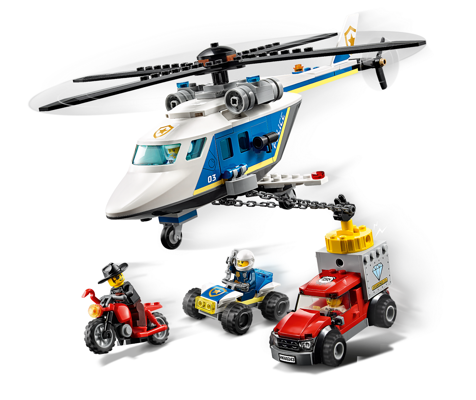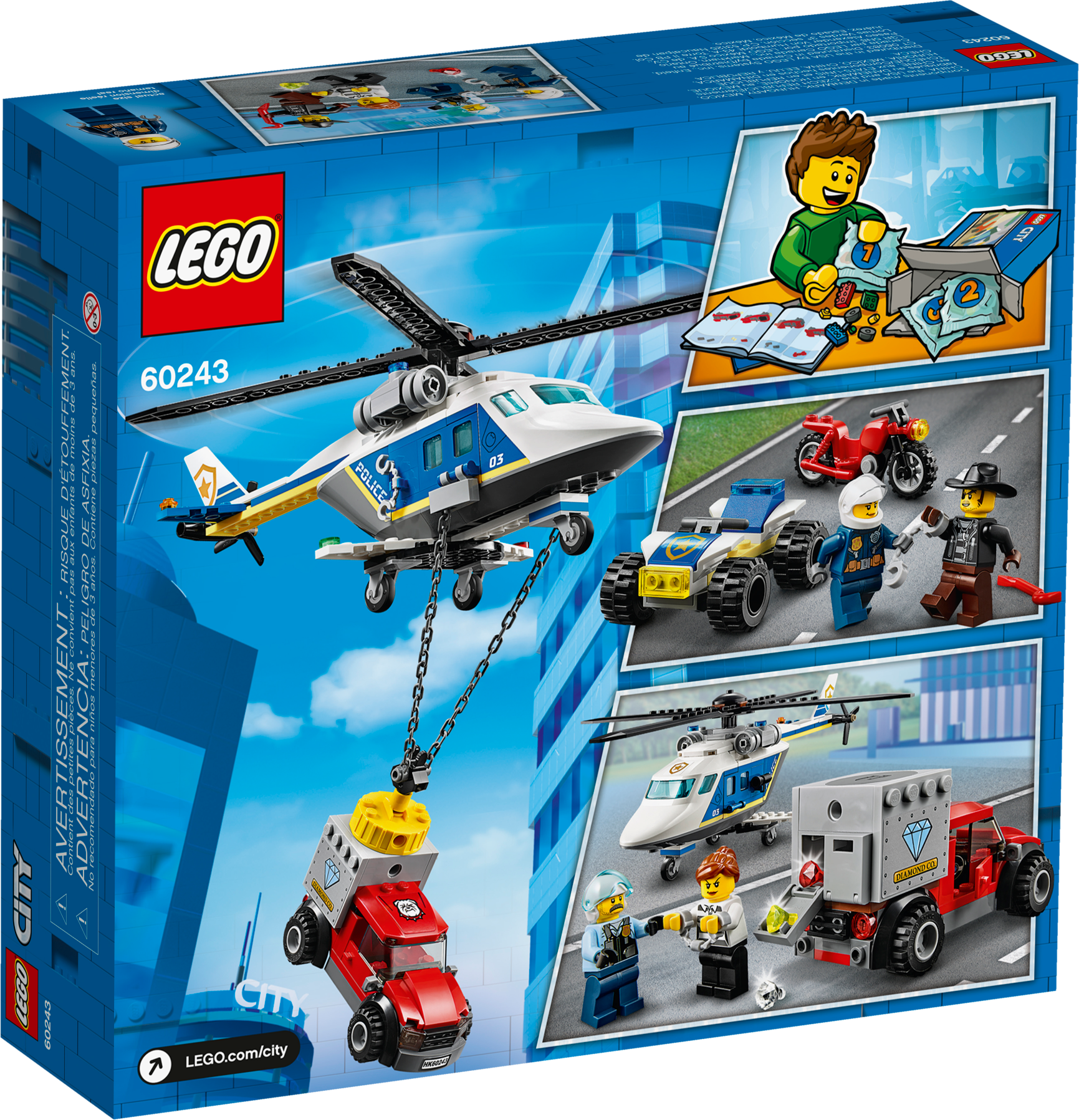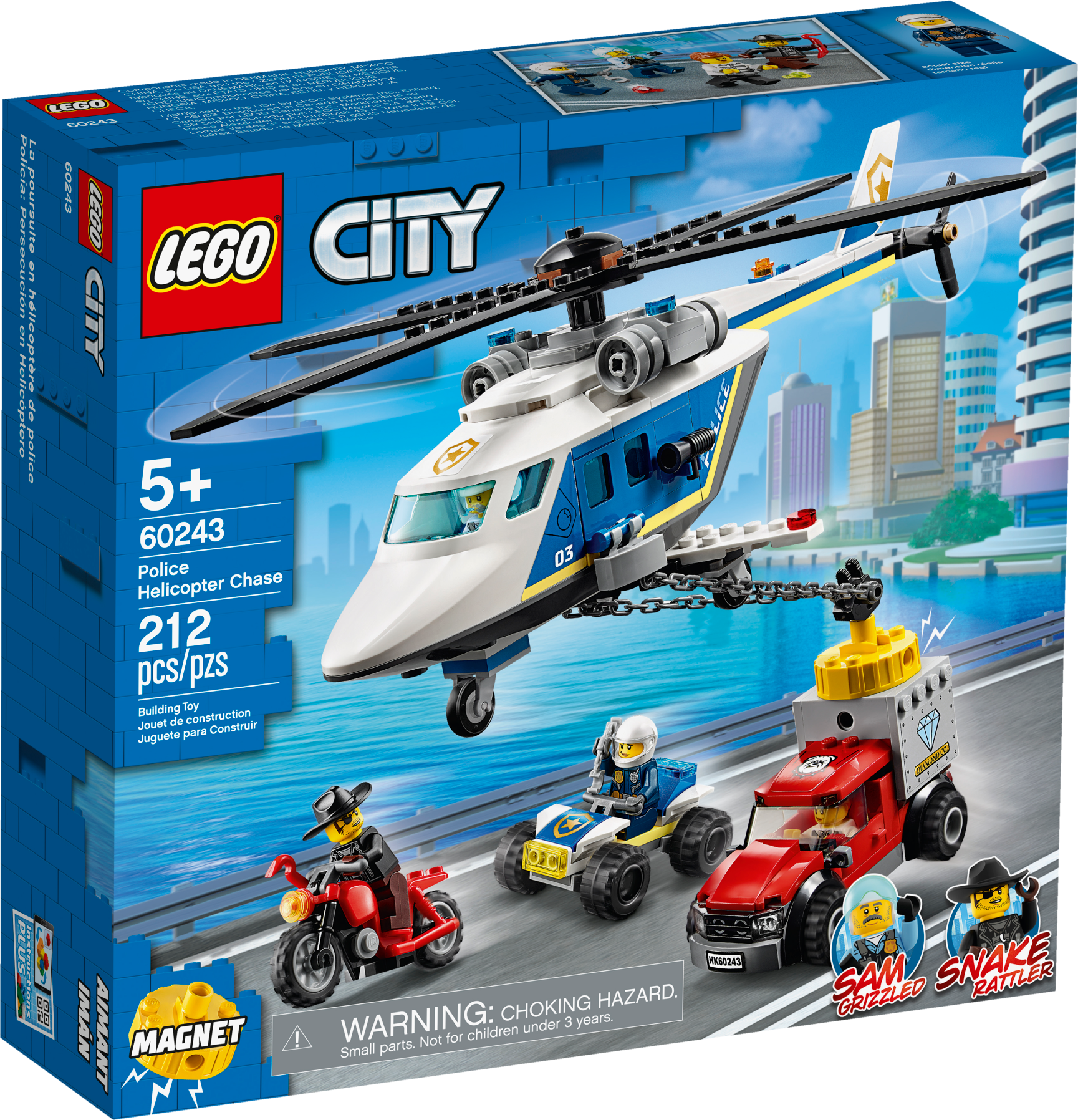 Kids with a passion for role-play will love this LEGO® City Police Helicopter Chase (60243) playset, featuring a police helicopter with a working magnet chain. Young law enforcers can join LEGO® City TV hero Sam Grizzled in his bid to protect the city from master crook Snake Rattler. And with a toy getaway truck, motorcycle and police ATV in the mix, the scene is set for action-packed adventures! Cool toy for kids. You'll find building instructions for this LEGO® City building toy in the box. Or you can hop online and download Instructions PLUS, part of the LEGO® Life app for smartphones and tablets. This interactive building guide, with amazing zoom and rotate viewing tools, quickly turns budding LEGO builders into master builders! Realistic role-play adventures LEGO® City police sets deliver an exciting build and play experience with models and characters that depict real city life in a fun and imaginative way.This multi-vehicle LEGO® City police (60243) set features a toy helicopter with a powerful magnet for lifting magnetic objects, including the crooks getaway vehicle! A cool toy for kids who enjoy fun car-chase action.Take LEGO® City TV hero Sam Grizzled, an ATV rider, crook Snake Rattler and his accomplice. Add a toy helicopter with a lifting magnet, a getaway truck and motorbike and the scene is set for endless independent play!Mini crimefighters can lift and transport the crooks' getaway vehicle by attaching the helicopter magnet to the stolen safe on the back of the truck. The helicopter also has room for all 4 minifigures.Looking for cool toys for kids aged 5+? This set makes a great Christmas, birthday or any-other-day gift for LEGO® City fans and boys and girls who love action-packed role-play. Requires only very basic building skills.When built, Sam Grizzled's Helicopter measures over 4" (11cm) high, 11" (30cm) long and 10" (26cm) wide, while Snake Rattler's getaway truck measures over 1" (5cm) high, 3" (10cm) long and 1" (5cm) wide.Does it need batteries? No, this construction toy is powered by small kids with big imaginations ‚ simply open the bags of bricks and the play can start right away!This building toy comes with an easy-to-follow printed building guide and Instructions PLUS‚ an interactive building guide for budding builders. Available in the free LEGO® Life app for smart devices.Unleash the fun and excitement of LEGO® City police sets featuring buildings, vehicles and characters that inspire open-ended creative play while helping youngsters develop physical skills and confidence.LEGO® building bricks are designed to the highest industry standards to ensure that LEGO City playsets are consistent, compatible and connect and pull apart easily every time.At The LEGO Group, we drop, squash, twist, heat, bite, bend, scratch and stretch LEGO® City pieces to make sure every building set meets the highest global safety and quality standards.