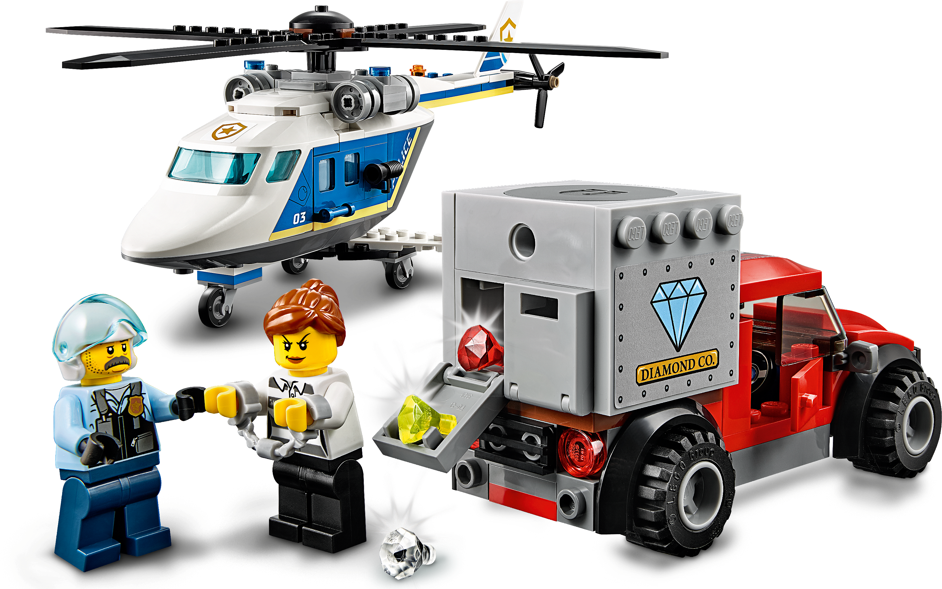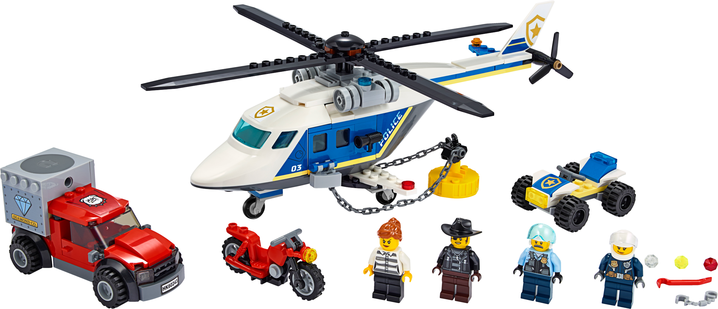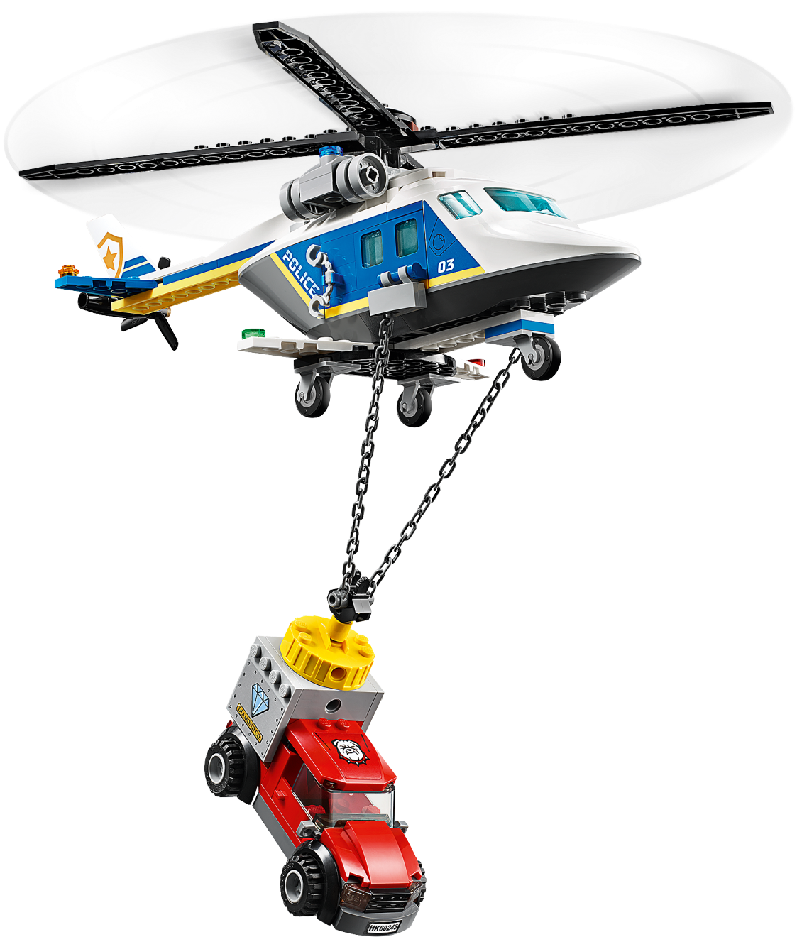 Kids with a passion for role-play will love this LEGO® City Police Helicopter Chase (60243) playset, featuring a police helicopter with a working magnet chain. Young law enforcers can join LEGO® City TV hero Sam Grizzled in his bid to protect the city from master crook Snake Rattler. And with a toy getaway truck, motorcycle and police ATV in the mix, the scene is set for action-packed adventures! Cool toy for kids. You'll find building instructions for this LEGO® City building toy in the box. Or you can hop online and download Instructions PLUS, part of the LEGO® Life app for smartphones and tablets. This interactive building guide, with amazing zoom and rotate viewing tools, quickly turns budding LEGO builders into master builders! Realistic role-play adventures LEGO® City police sets deliver an exciting build and play experience with models and characters that depict real city life in a fun and imaginative way.This multi-vehicle LEGO® City police (60243) set features a toy helicopter with a powerful magnet for lifting magnetic objects, including the crooks getaway vehicle! A cool toy for kids who enjoy fun car-chase action.Take LEGO® City TV hero Sam Grizzled, an ATV rider, crook Snake Rattler and his accomplice. Add a toy helicopter with a lifting magnet, a getaway truck and motorbike and the scene is set for endless independent play!Mini crimefighters can lift and transport the crooks' getaway vehicle by attaching the helicopter magnet to the stolen safe on the back of the truck. The helicopter also has room for all 4 minifigures.Looking for cool toys for kids aged 5+? This set makes a great Christmas, birthday or any-other-day gift for LEGO® City fans and boys and girls who love action-packed role-play. Requires only very basic building skills.When built, Sam Grizzled's Helicopter measures over 4" (11cm) high, 11" (30cm) long and 10" (26cm) wide, while Snake Rattler's getaway truck measures over 1" (5cm) high, 3" (10cm) long and 1" (5cm) wide.Does it need batteries? No, this construction toy is powered by small kids with big imaginations ‚ simply open the bags of bricks and the play can start right away!This building toy comes with an easy-to-follow printed building guide and Instructions PLUS‚ an interactive building guide for budding builders. Available in the free LEGO® Life app for smart devices.Unleash the fun and excitement of LEGO® City police sets featuring buildings, vehicles and characters that inspire open-ended creative play while helping youngsters develop physical skills and confidence.LEGO® building bricks are designed to the highest industry standards to ensure that LEGO City playsets are consistent, compatible and connect and pull apart easily every time.At The LEGO Group, we drop, squash, twist, heat, bite, bend, scratch and stretch LEGO® City pieces to make sure every building set meets the highest global safety and quality standards.