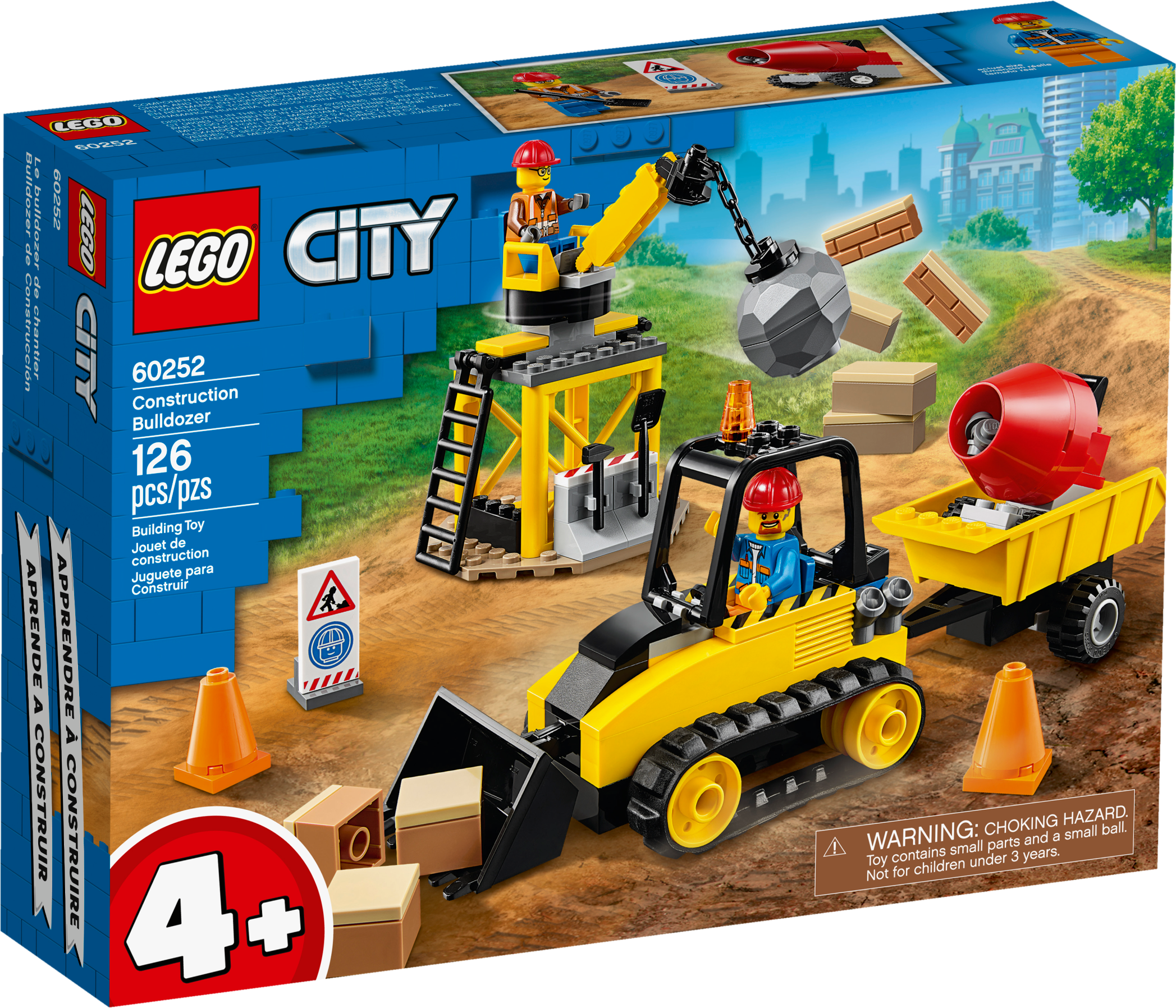 Youngsters who love to role-play everyday heroes will love this LEGO® City Construction Bulldozer (60252) set. There’s a cool bulldozer with rubber tracks and working bucket, a toy crane with a wrecking ball, a cement mixer and a warning sign – everything a child needs to enjoy hours of imaginative play. A cool toy for kids This 4+ toy playset includes a simple printed building guide and a special Starter Brick element to help youngsters experience the pride of constructing their own LEGO toys. And with the free LEGO Life app for smartphones and tablets, kids get Instructions PLUS – an interactive building guide with amazing zoom and rotate viewing tools that really make LEGO building child’s play.The creative world of LEGO CityWith LEGO City sets, kids get to immerse themselves in open-ended adventures and scenarios that reflect real life. And with a wide range of realistic, feature-rich vehicles and machines, kids' imaginations are free to soar!This construction bulldozer set for kids is an ideal introduction to the exciting world of LEGO® City. Perfect for children aged 4+, it is designed to inspire creative, independent play based on real-life scenarios.What’s in the box? This (60252) construction site playset features a bulldozer with working bucket, a toy crane with a wrecking ball, a cement mixer, 2 minifigures and more. Just add a sprinkle of imagination for endless fun!Kids can cordon off the site with the sign and cones, swing the wrecking ball to knock down the wall, scoop up bricks with the bulldozer, spin the cement mixer and more – a great gift for kids who love pretend play.LEGO® City 4+ sets are a fun way for youngsters to learn the art of LEGO building. With special starter bricks and simple printed building guides they help kids grow their confidence and abilities step by step.When built, the construction bulldozer measures over 3" (8cm) high, 4" (12cm) long and 2" (6cm) wide, while its trailer measures over 1" (4cm) long, 3" (9cm) high and 1" (4cm) wide.No batteries required – this building toy is powered by small kids with big imaginations, so the play can start right away!Find instructions to build this 4+ set in the box. Or hop online to download Instructions PLUS – available as part of the free LEGO® Life app. Zoom, rotate and visualize the model to bring the building process to life.LEGO® City Great Vehicles sets help kids grow physical skills and confidence with feature-rich buildings, realistic vehicles and fun characters that inspire open-ended independent play.LEGO® bricks are designed to the highest industry standards to ensure that LEGO® City building toys are consistent, compatible and connect and pull apart easily every time.At The LEGO Group, we thoroughly test LEGO® City playsets to make sure every one of these unique toys meets the highest global safety and quality standards.