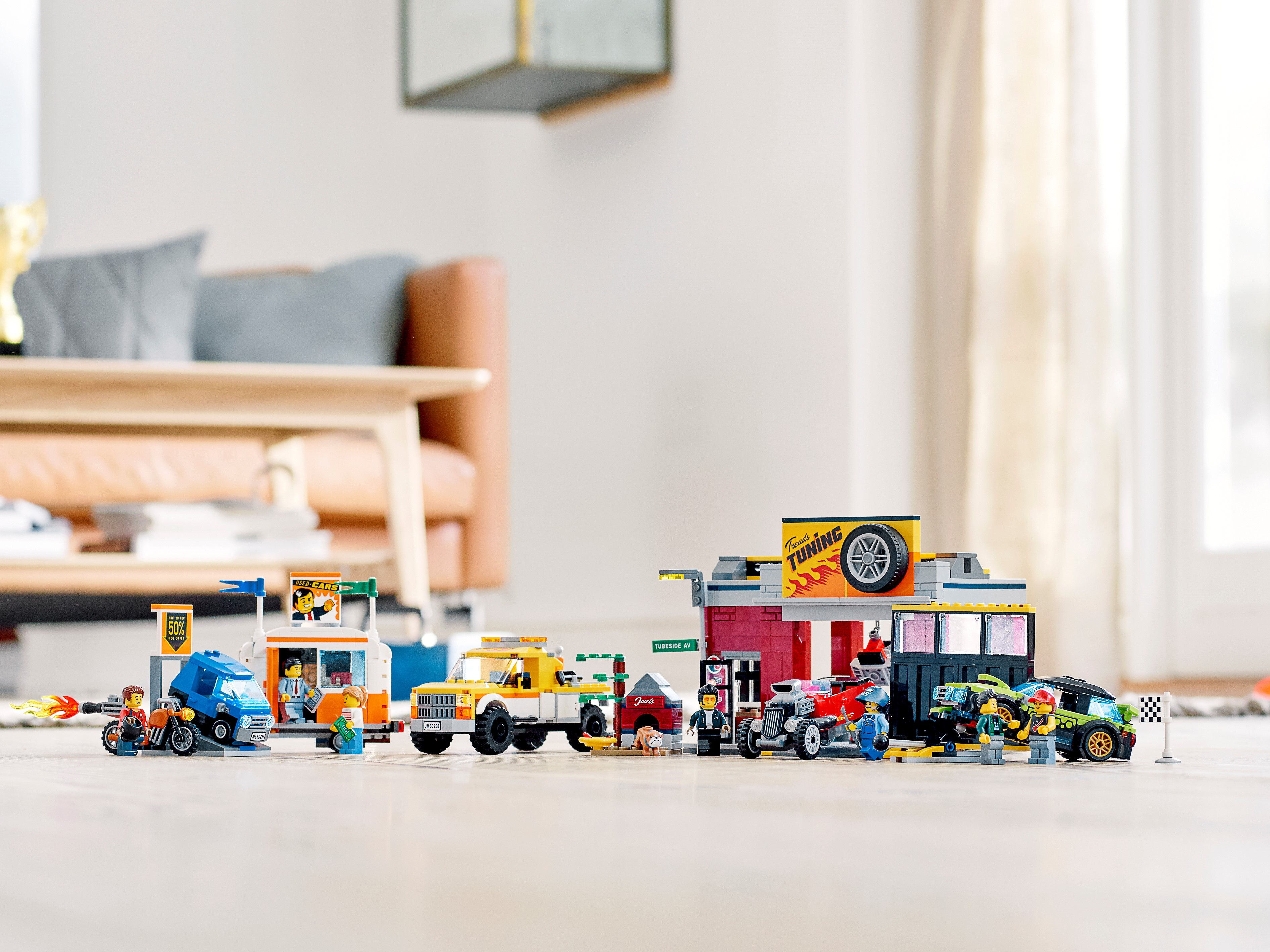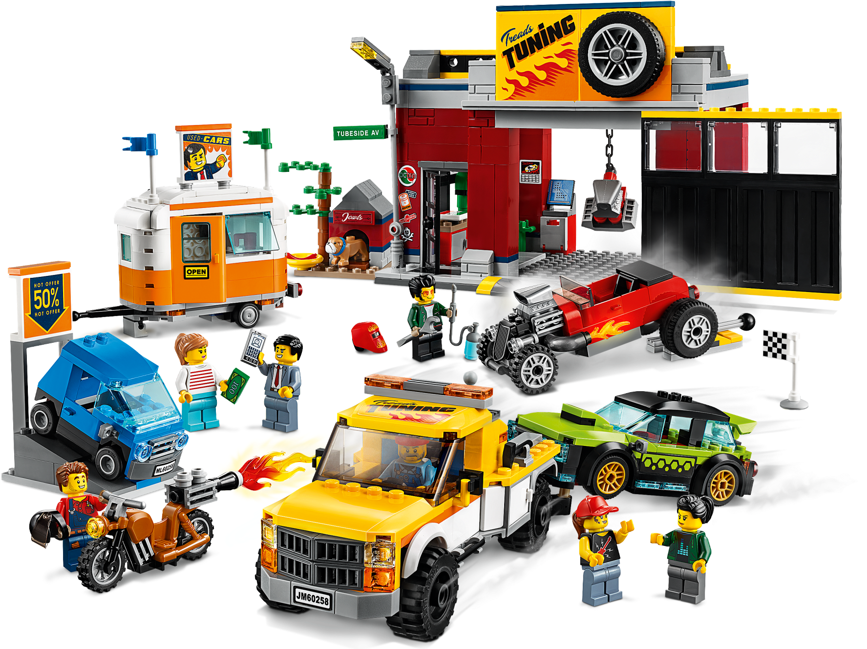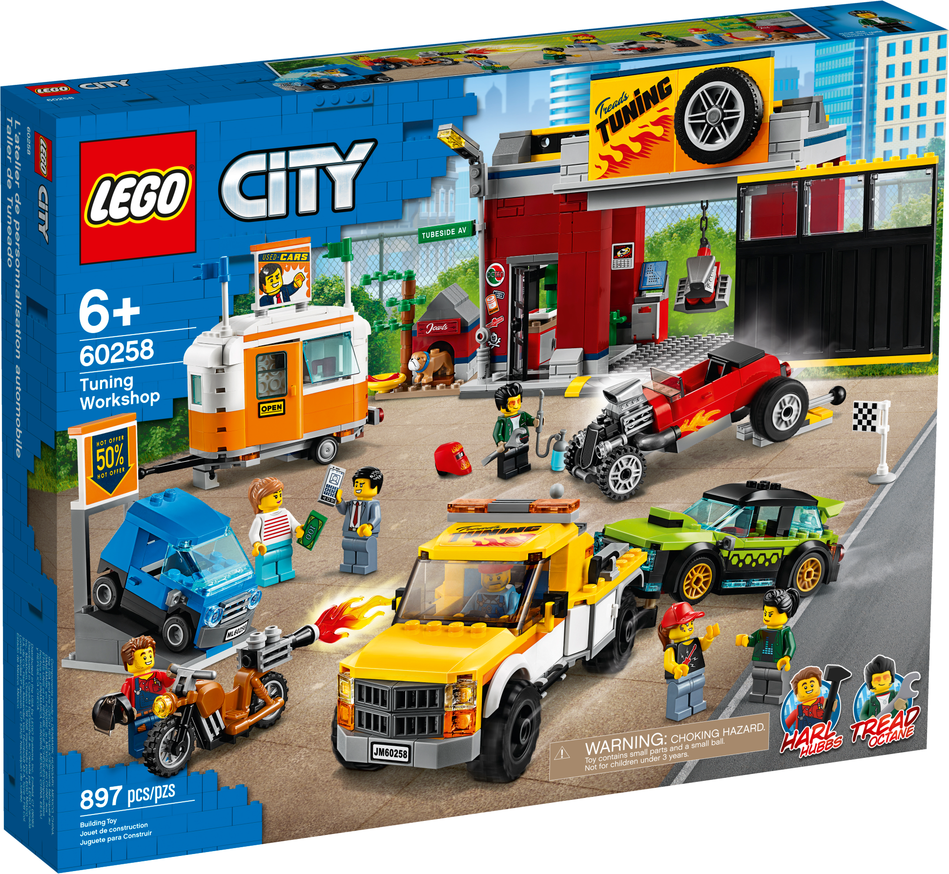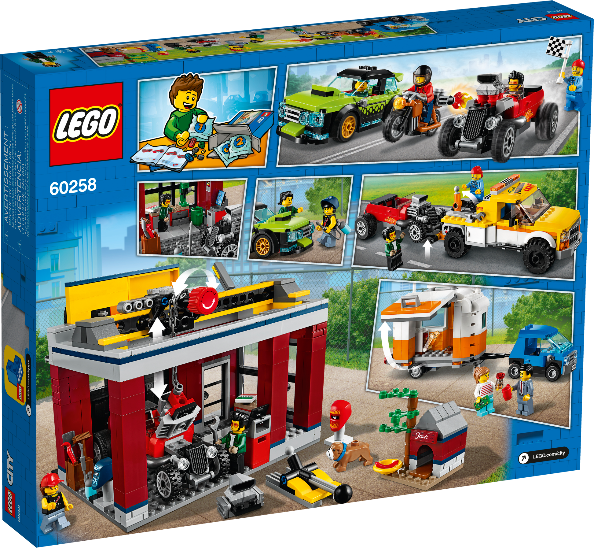 Kids who love toy cars, and fans of the hit LEGO® City TV series will adore this fun-packed LEGO City Tuning Workshop (60258) playset. There’s a repair shop, a tow truck and even a small car-dealership selling dodgy cars at bargain prices! And the fun doesn't end there! Kids also get a selection of fun characters with cool vehicles, including Tread Octane and his prize hot rod, and Harl Hubbs with his crazy, rocket-powered motorcycle. A perfect combination for hilarious role-play adventures. Great building set for kids This toy playset includes simple building instructions that will help your budding LEGO builder become a master builder. Cool construction toys for kids LEGO City vehicle playsets give kids the chance to let their inner turbo loose with an awesome range of superfast, supercool toys on wheels. These feature-rich building sets, with detailed buildings and fun characters, inspire open-ended, independent play, where children can recreate scenarios that reflect real-life in a fun and exciting way.This multi-model LEGO® City Tuning Workshop (60258) playset is a perfect gift for car lovers and comes with a workshop and an array of cool vehicles, and fun characters for imaginative independent play.Comes with a toy garage, camping trailer and cool vehicles, including a tow truck, hot rod and rocket-powered motorbike, plus 7 minifigures, including LEGO® City TV characters Tread Octane and Harl Hubbs.Kids can operate the engine hoist in the workshop, lift cars with the jack, rescue broken-down vehicles with the tow truck and much more. Kids can also combine this set with other LEGO® playsets for fun play and displays.Looking for cool toys for kids aged 5 and up? This tuning workshop building set makes a great Christmas, birthday or any-other-day gift for kids who love toy vehicles and for fans of the hit LEGO® City TV series.When built, Tread Octane's workshop measures over 5” (14cm) high, 6” (17cm) wide and 5” (13cm) deep, while the tow truck measures over 2" (7cm) high, 7" (18cm) long and 2" (6cm) wide.No batteries required – this awesome playset is powered by small kids with big imaginations, so the play can start right away!It's easy to get started with this LEGO® City construction toy. Inside the box you'll find easy-to-follow building instructions – so tear open the brick bags and let the fun begin!LEGO® City playsets come with cool vehicles, feature-rich buildings and fun characters that stimulate imaginative play while helping youngsters grow physical skills and confidence.LEGO® bricks and pieces meet the highest industry standards to ensure that LEGO City building toys are consistent, compatible and connect and pull apart easily every time.At The LEGO Group, we thoroughly test LEGO® City building sets to ensure that every one of these unique toys meets the highest global safety and quality standards.