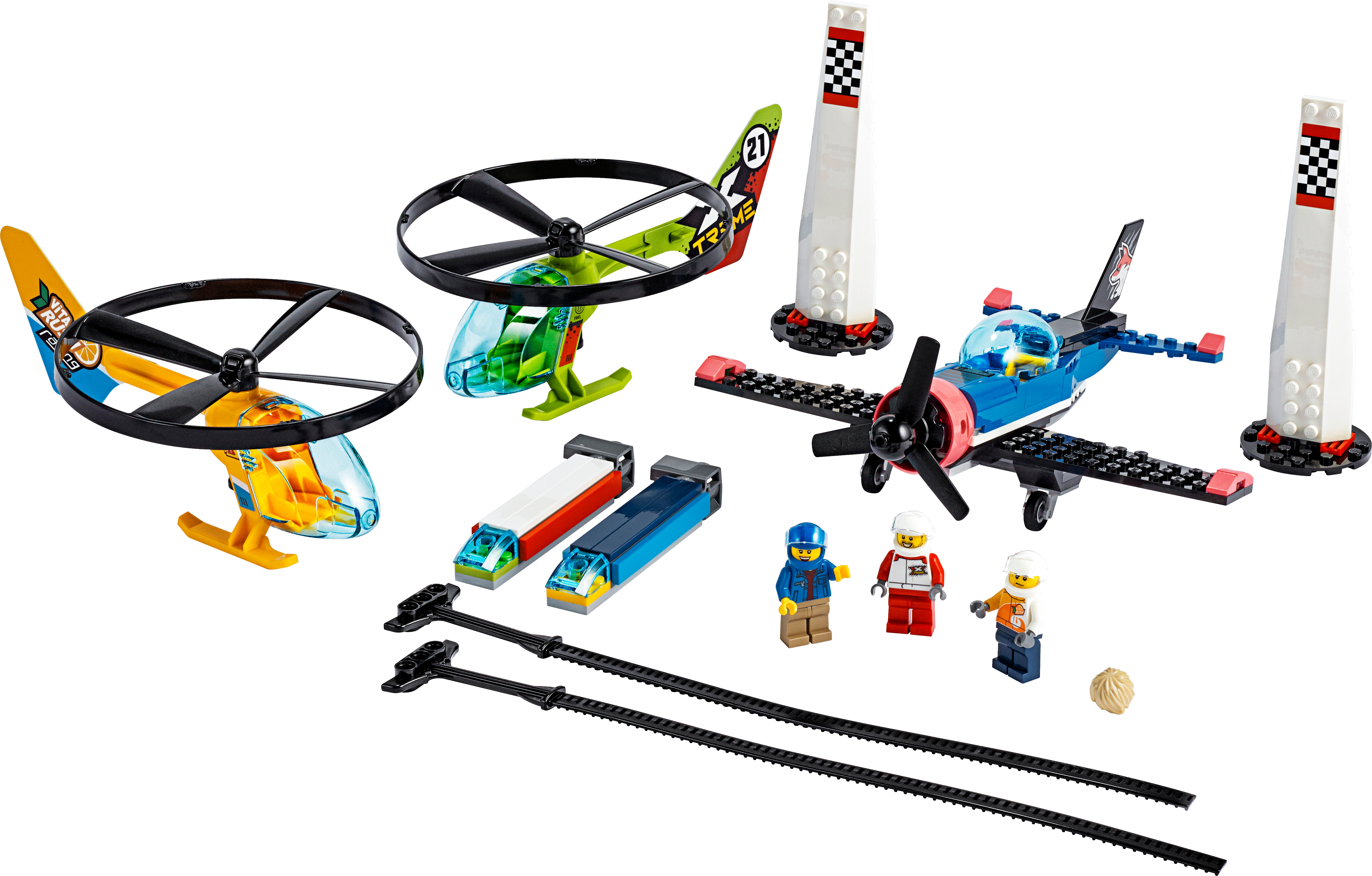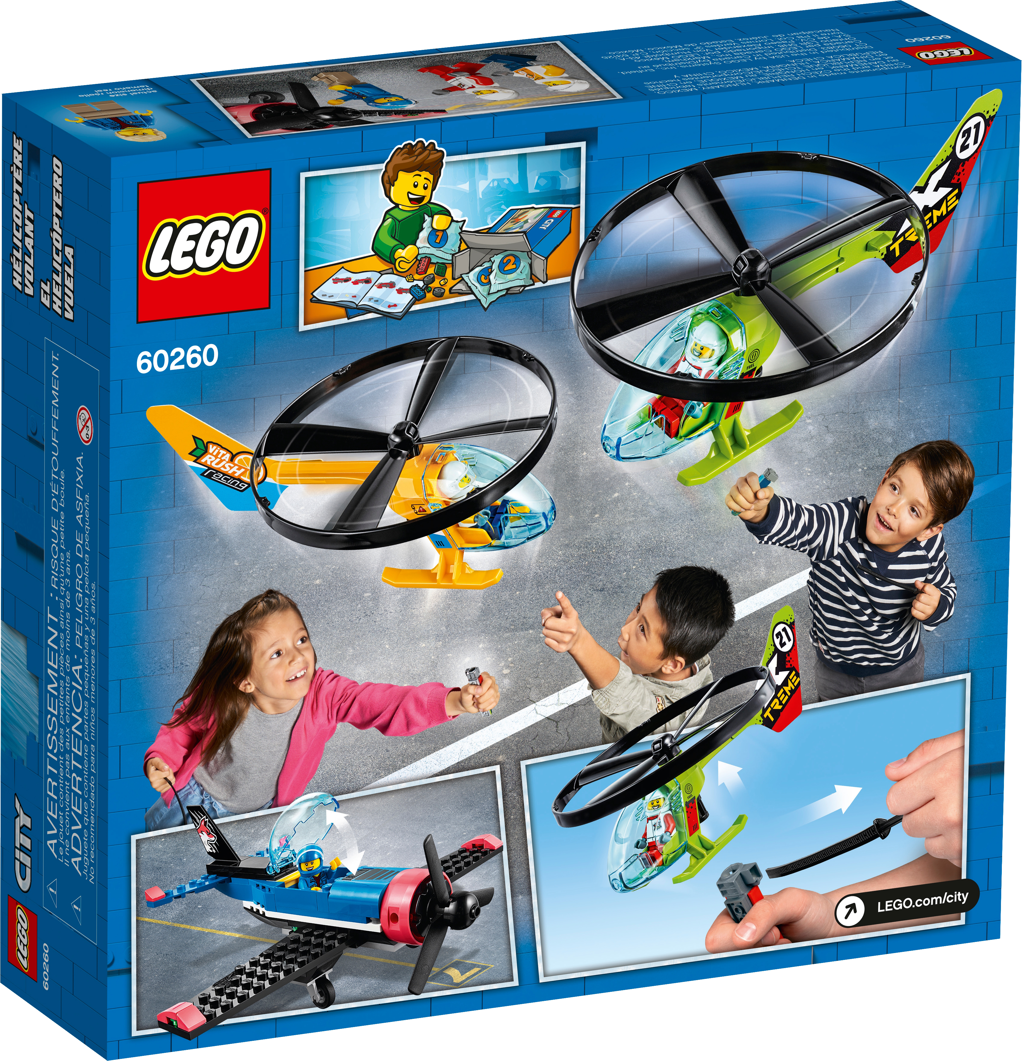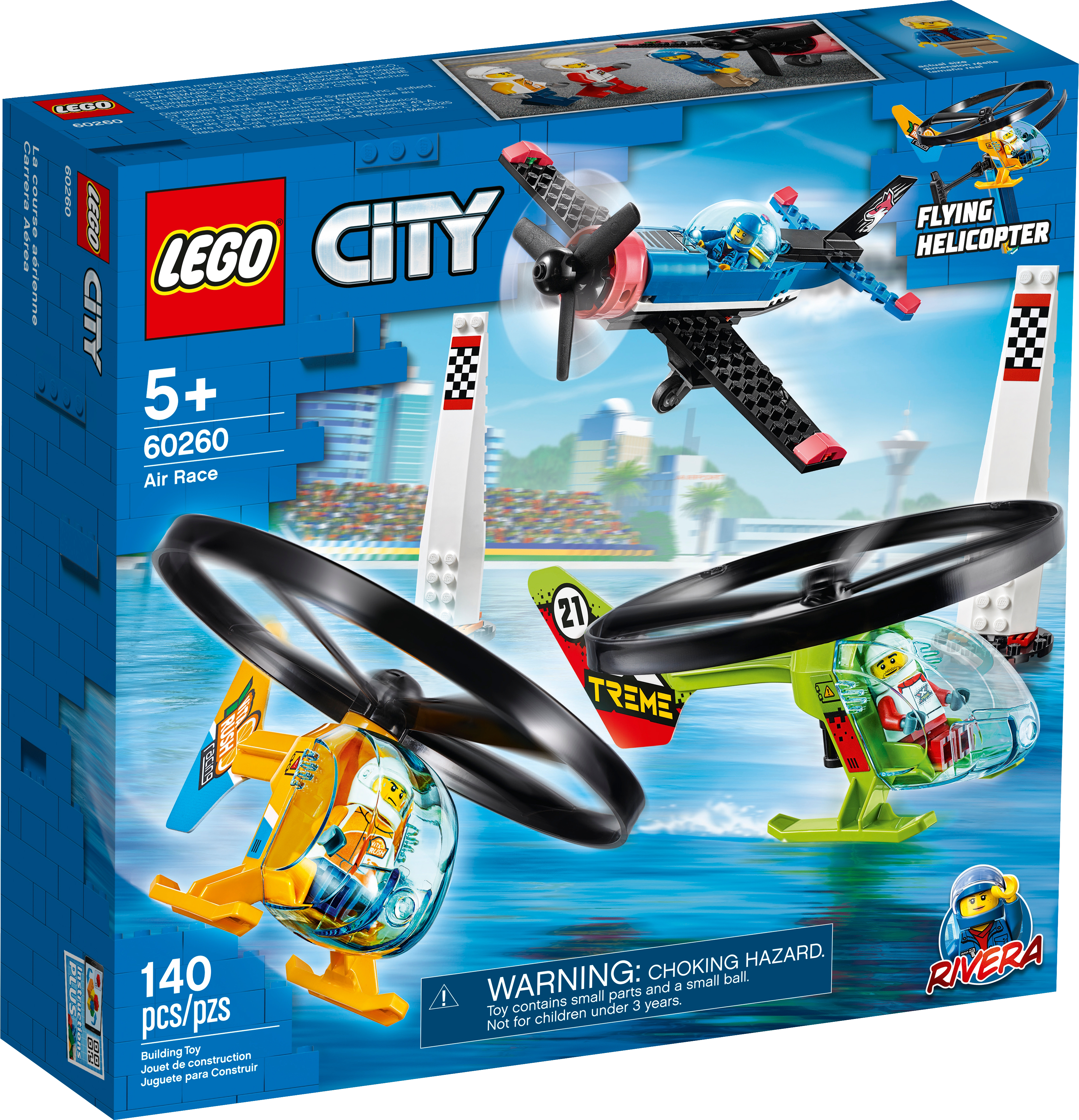 Send kids imaginations skyward with this LEGO® City Air Race (60260) playset, featuring a cool toy propeller stunt plane, 2 ripcord helicopters and 2 course pylons. Boys and girls can have fun launching the helicopters into the air and enjoy action-packed adventures with 3 minifigure characters, including LEGO City TV's ace pilot Rivera, plus Xtreme and Vitarush helicopter pilots.Great building set for kidsThe LEGO City Air Race playset comes with an easy-to-follow building guide and Instructions PLUS, part of the free LEGO Building Instructions app for smartphones and tablets. This interactive building guide with zoom and rotate viewing tools helps young LEGO builders become master builders.Inspiring creative, imaginative playLEGO City Airport toys deliver an enjoyable build and play experience with realistic vehicles, detailed accessories and fun characters that stimulate open-ended, fun-filled role play.Send Kids imaginations skyward with this multi-vehicle LEGO® City Air Race playset, featuring 2 toy flying ripcord helicopters, 3 minifigures, including LEGO City Adventures TV series character Rivera, and more.What’s in the box? The LEGO® City Air Race set includes 2 toy ripcord helicopters, a stunt plane, 2 course pylons and 3 minifigures, including LEGO City TV character Rivera and LEGO City Xtreme and Vitarush pilots.Kids can launch the ripcord helicopters into the air. The toy stunt plane and helicopters also have opening cockpits with room for any 1 of the 3 minifigure pilots included with this airport building set.This LEGO® City Air Race (60260) playset makes a great Christmas, birthday or any-other-day gift for kids aged 5 and up and for boys and girls who love toy vehicles. Requires only very basic building skills.Stunt plane toy measures over 3" (8cm) high, 7" (20cm) long and 7" (20cm) wide, while each ripcord helicopter measures over 2" (7cm) high, 7" (18cm) long and 4" (12cm) wide.No batteries required for this air race building set, it is powered by kids imaginations. Need help launching the ripcord helicopters? Scan the QR code in the building instruction to view the video guide.This air race set comes with a simple building guide, and instructions PLUS an interactive building guide that helps kids become master builders. Part of the free LEGO® Building Instructions app for smart devices.LEGO® City Airport sets stimulate imaginative role play with realistic, feature-rich buildings, cool vehicles and fun characters.All LEGO® City Airport playsets meet the highest industry standards and quality criteria to ensure that all LEGO bricks and pieces are consistent, compatible and connect and pull apart easily every time.LEGO® bricks and pieces are dropped, heated, crushed, twisted and analyzed to make sure every kid's building set meets the highest global safety and quality standards.