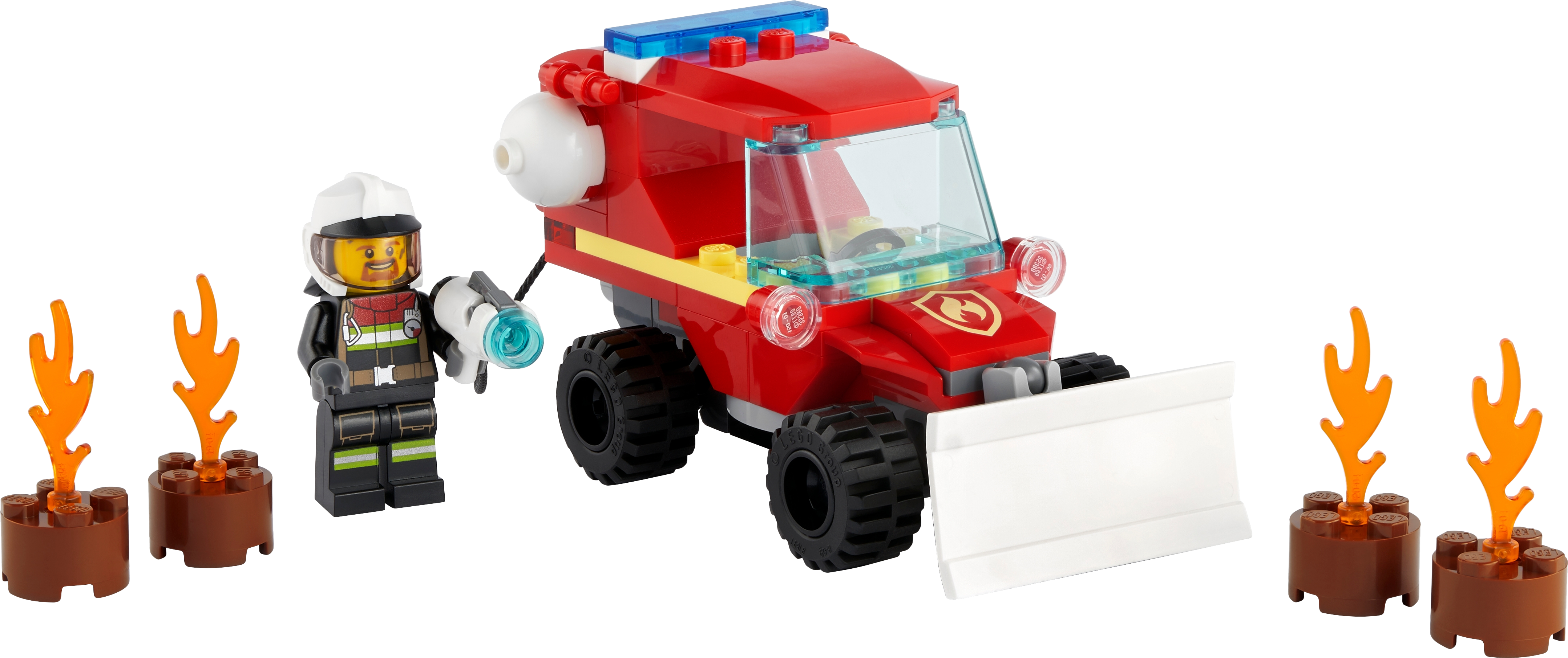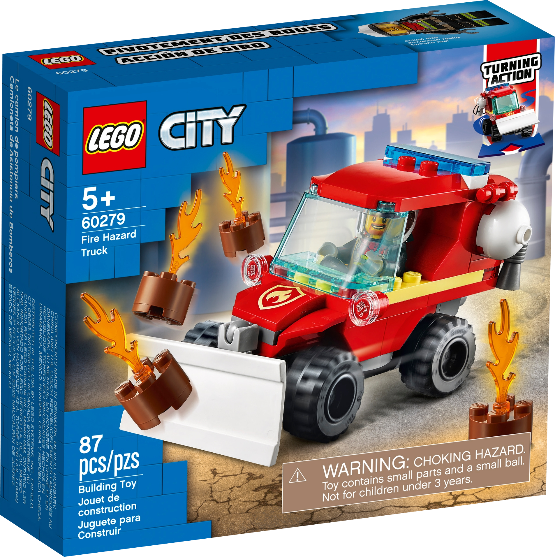 Bring excitement to kids’ play any day with this LEGO® City Fire Hazard Truck (60279) playset. They can steer the fire truck by tilting it left and right, sweep away the burning LEGO logs using its front plow and shoot water elements to put out the fire. With a LEGO City firefighter on the scene, this construction toy really ignites children's imaginations.Fun and easy to buildThis fire truck toy comes with both printed building instructions and Instructions PLUS – part of the free LEGO Building Instructions app for smartphones and tablets. This interactive building guide, with amazing zoom and rotate viewing tools, quickly helps budding LEGO builders become master builders.Mobilizing kids’ creativityWith LEGO City fire sets, kids get to enjoy open-ended adventures and action-packed scenarios that reflect real-life situations. The wide range of feature-rich buildings, realistic vehicles and fun characters lets kids enter a world where creativity and imagination can thrive.This fire truck toy is a great introduction to the exciting world of LEGO® City, where kids become everyday heroes as they play out realistic firefighting adventures. Suitable for kids aged 5 and up.What’s in the box? The LEGO® City Fire Hazard Truck (60279) playset includes a steerable fire truck with a plow and fire hose, blazing LEGO logs, and a firefighter minifigure with a cool helmet.Kids can steer the toy fire truck by tilting it left and right, sweep away the LEGO® flames using its front plow and shoot water elements from the stud-shooter fire hose to knock out the fire.This LEGO® firefighter playset makes a great little gift for any occasion. It’s perfect for boys and girls aged 5 and up and requires only basic building skills.When built, the Fire Hazard Truck measures over 2 in. (6 cm) high, 4 in. (10 cm) long and 2 in. (5 cm) wide.LEGO® accessories include a megaphone, fire helmet and logs with flame elements.Includes a printed building guide and Instructions PLUS – part of the free LEGO® Building Instructions app for smart devices. This interactive construction guide helps kids become master builders!LEGO® City fire toys come with colorful buildings, cool vehicles and fun characters that stimulate imaginative role play as kids create open-ended adventures in settings that resemble real life.Looking for a high-quality children's toy? All LEGO® City components meet strict industry standards to ensure they are compatible and connect and pull apart consistently every time.Putting safety in the spotlight. LEGO® City bricks and pieces are dropped, heated, crushed, twisted and analyzed to make sure they meet stringent global safety standards.