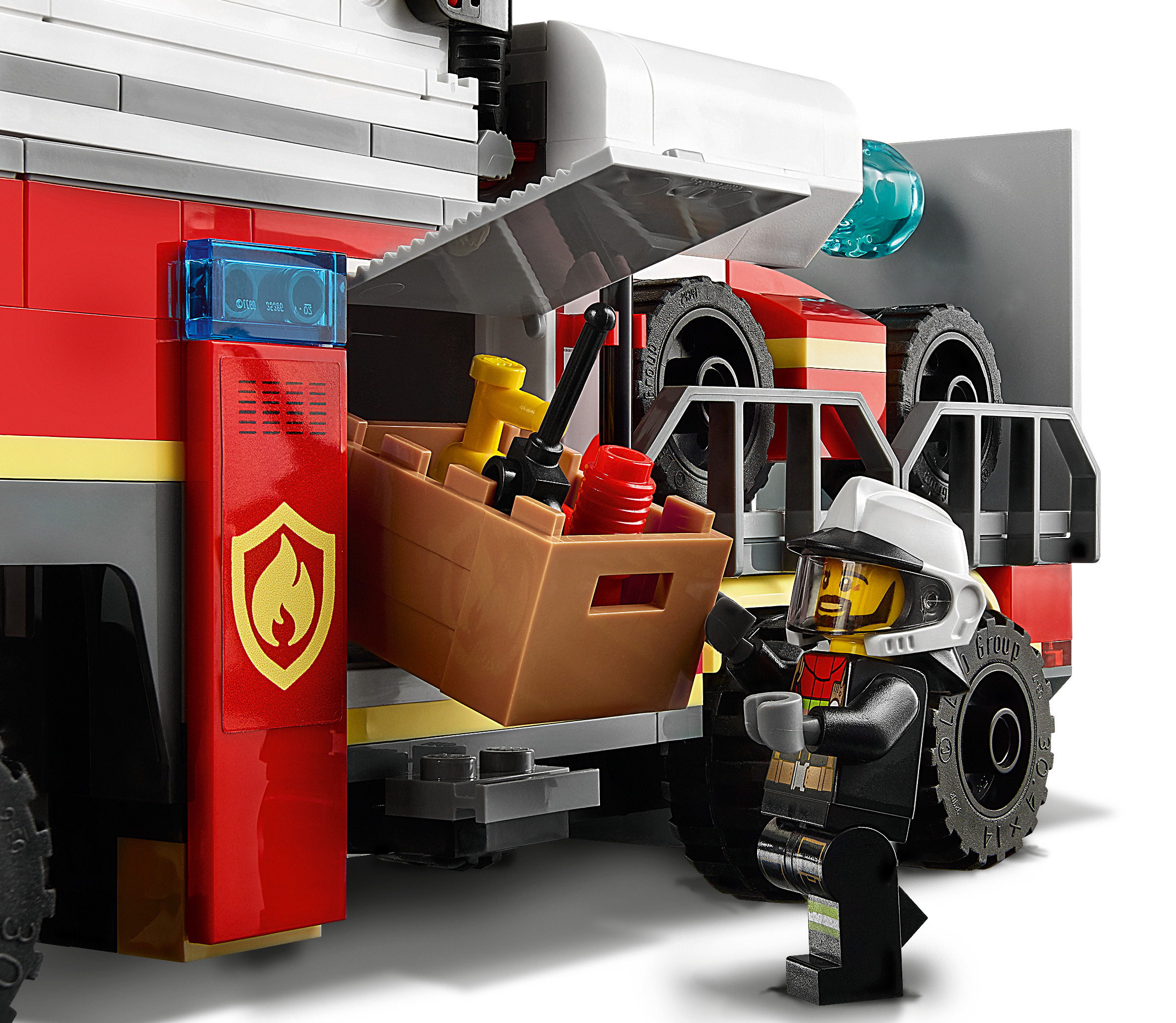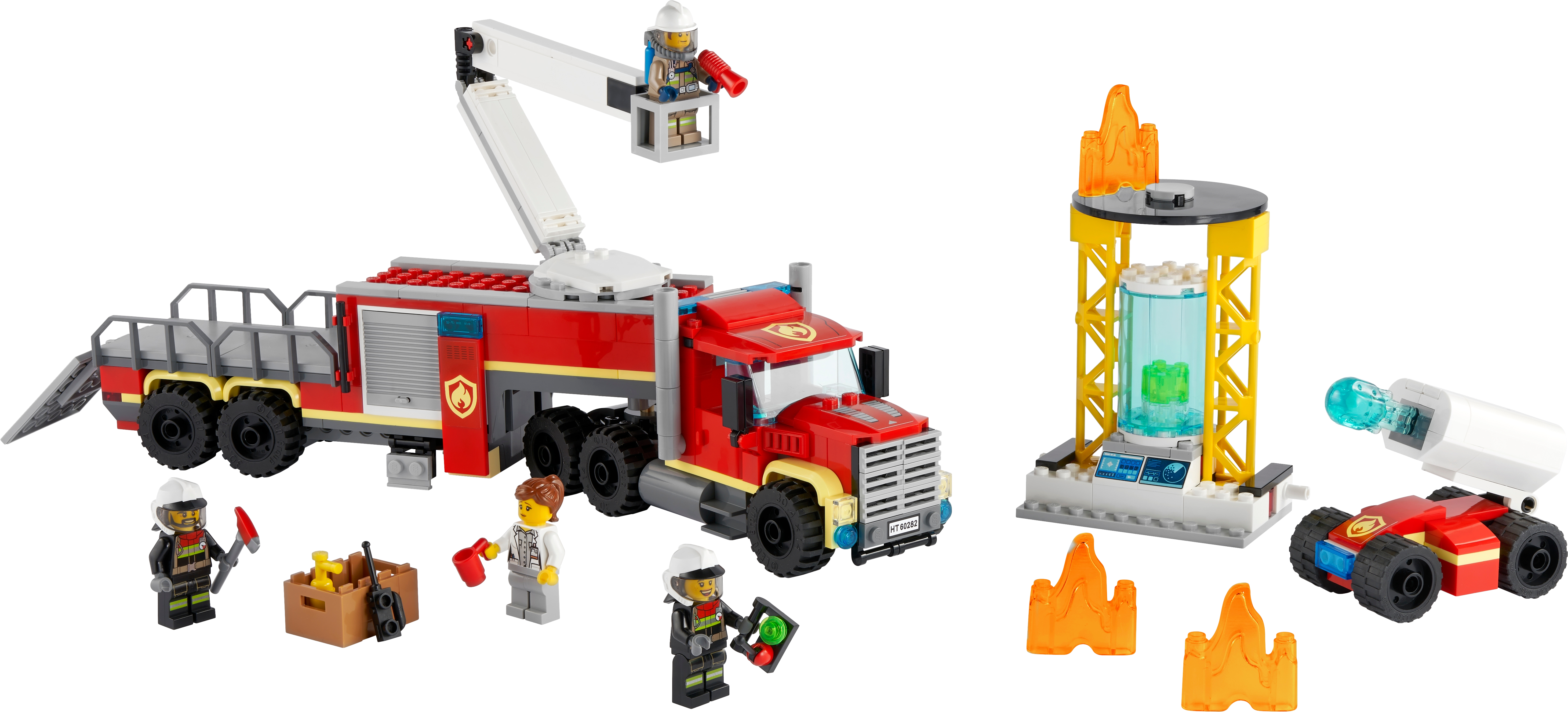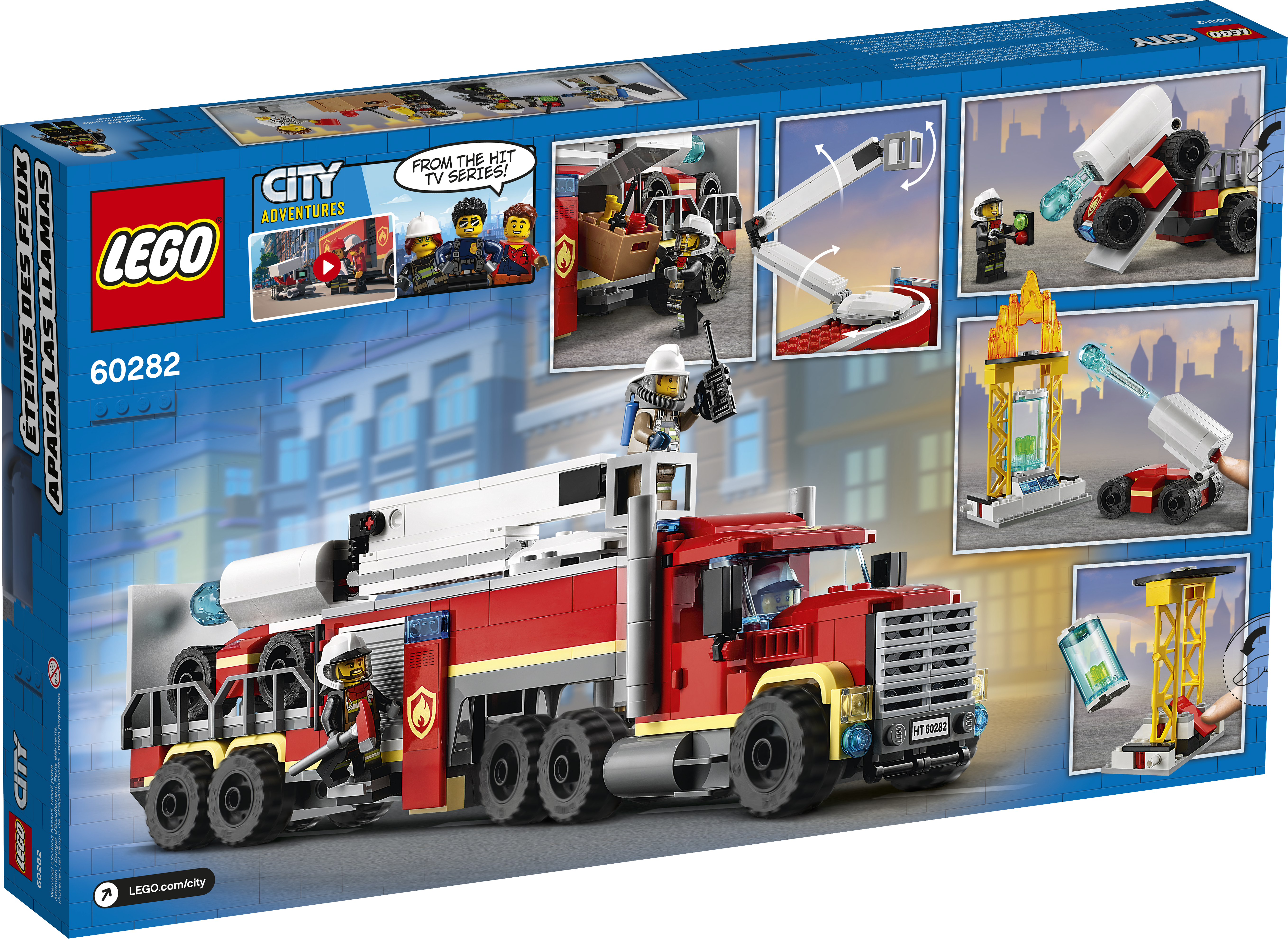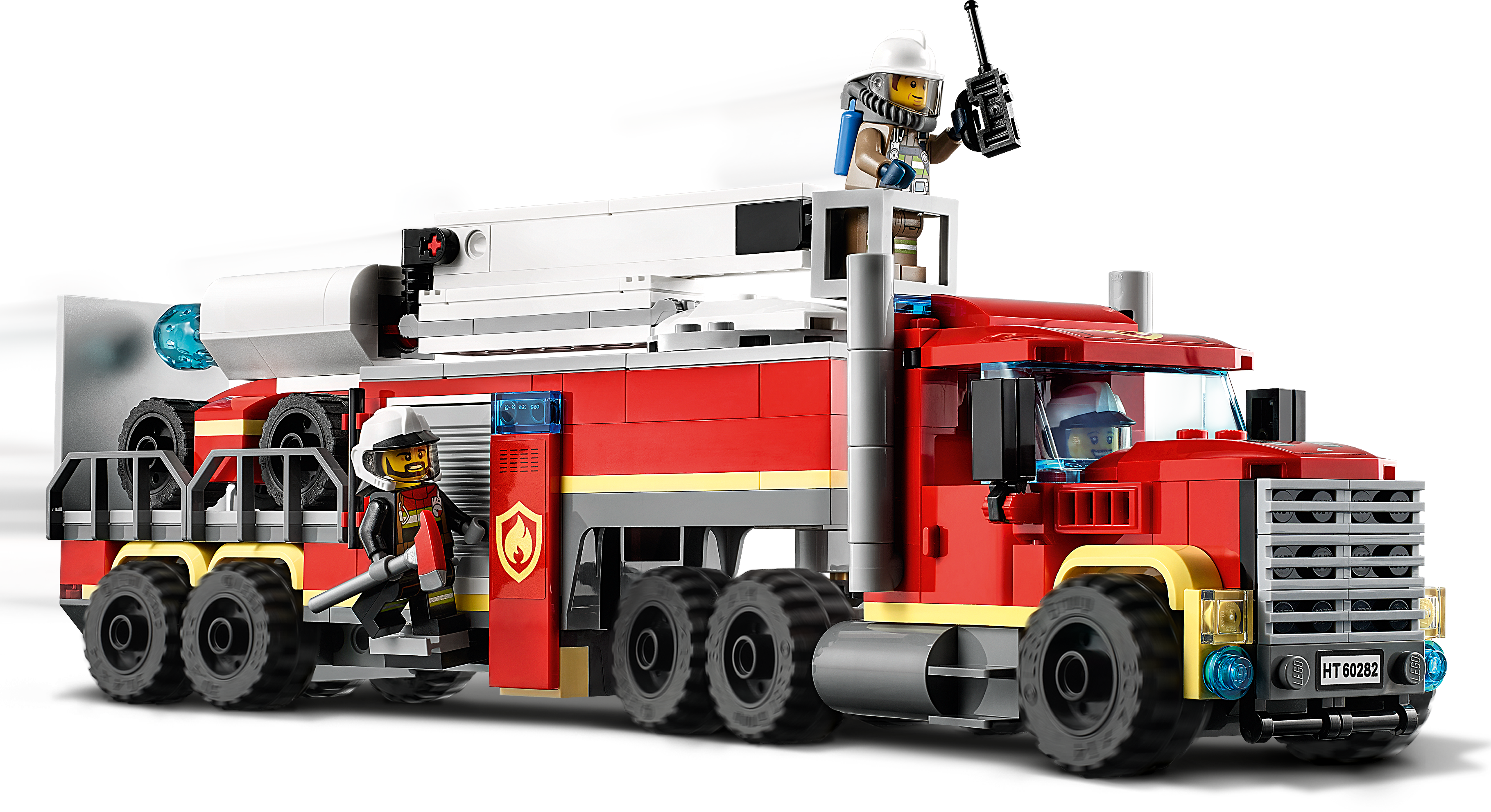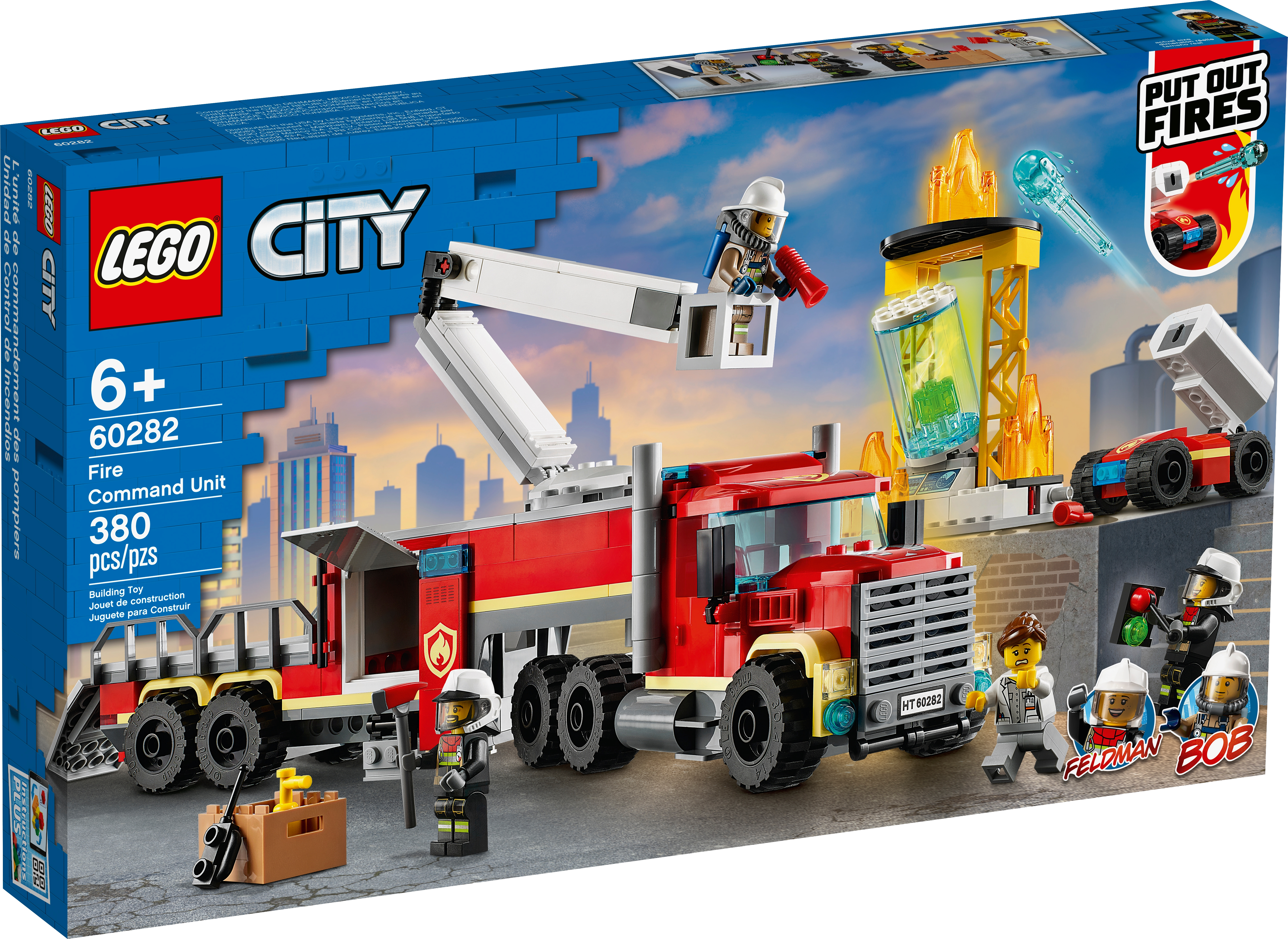This exciting LEGO® City Fire Command Unit (60282) playset includes a classic fire truck with a functioning cherry picker arm. Kids also get a host of LEGO City TV characters, including Bob, Feldman and Toastie the firefighter robot complete with a water cannon that shoots water elements. Transport your little hero to the heart of the LEGO City Adventures TV series, where they get to decide the script!Ideal building toy for kids aged 5 and upYou'll find easy-to-follow building instructions for this LEGO City playset in the box. Or you can download Instructions PLUS, part of the free LEGO Building Instructions app for smartphones and tablets. This interactive construction guide, with amazing zoom and rotate viewing tools, quickly turns kids into master builders!Creative play for kidsLEGO City fire playsets deliver a world of fun where creativity can thrive, with feature-rich buildings, realistic vehicles and exciting characters that inspire imaginative play based on real-life scenarios.Kids can play out stories from the popular LEGO® City Adventures TV series with the LEGO City Fire Command Unit (60282) playset, featuring realistic vehicles and fun characters from the TV show.What’s in the box? A cool toy fire truck with functioning cherry picker, a science lab setting with stackable LEGO® flames, plus LEGO City TV characters Toastie the firefighter robot, Bob and Feldman.Kids can elevate the fire truck's cherry picker, shoot water elements from Toastie the firefighting robot to knock out the LEGO® flames, and play out stories featuring fun LEGO City TV characters.This high-quality playset makes an impressive Christmas, birthday or any-other-day gift for fans of the LEGO® City Adventures TV series and for kids who love creative play.When built, the fire truck (with cherry picker retracted) measures over 4 in. (10 cm) high, 13 in. (33 cm) long and 2.5 in. (6 cm) wide.The fire truck has a compartment for storing the firefighting accessories, plusa trailer with a ramp for transporting Toastie the firefighter robot. Includes 3 firefighter minifigures with helmets.Comes with easy-to-follow building instructions and Instructions PLUS – an interactive guide for budding builders that’s part of the free LEGO® Building Instructions app for smart devices.LEGO® City fire sets nurture imaginative role play and open-ended adventures in realistic settings with detailed buildings, cool vehicles and fun characters loved by kids.Have you ever wondered how LEGO® bricks connect and pull apart so consistently? It’s because LEGO components are produced to meet strict industry standards for quality.LEGO® pieces are rigorously tested to make sure all LEGO building playsets meet stringent global standards for safety.